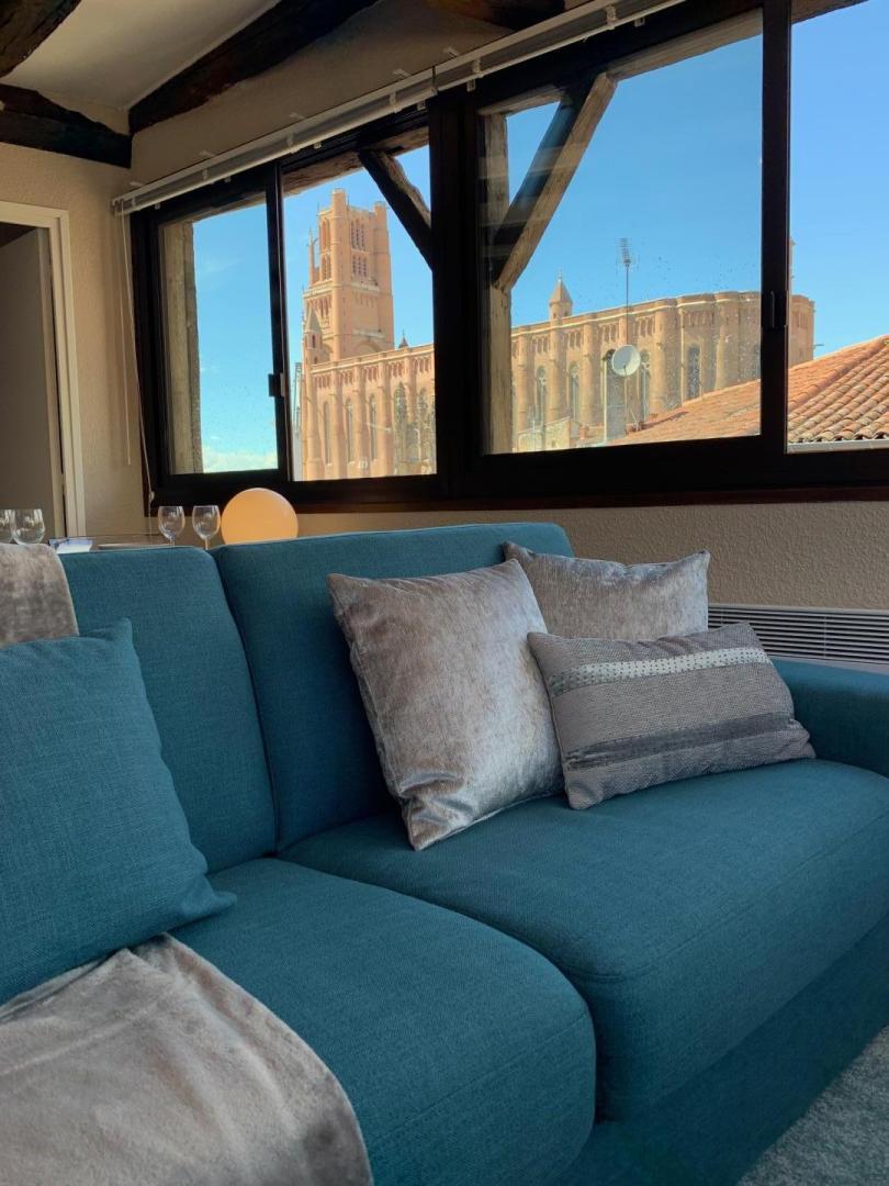 L’espace séjour est aménagé d’une grande baie vitrée et vous offre une vue époustouflante sur la cathédrale Sainte Cécile, la collégiale Saint Salvi et les toits du vieil Albi.