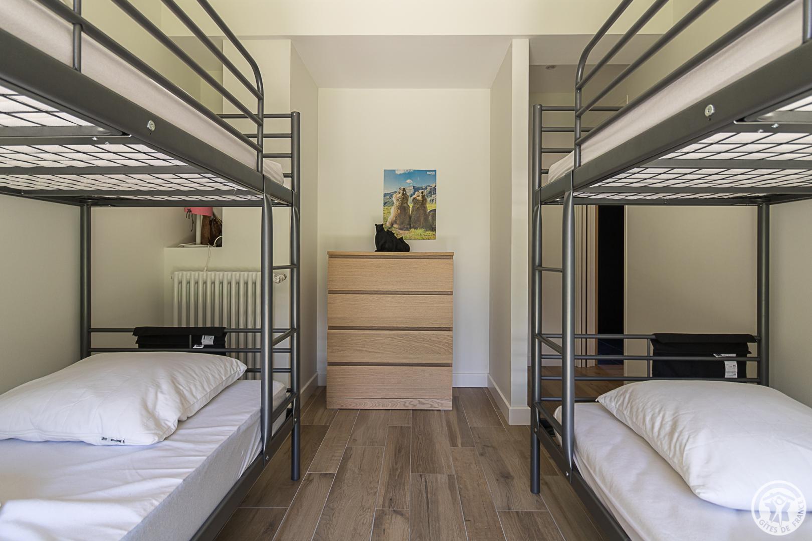 – Ground floor: the sleeping area of the house comprises an entrance hall (cupboard/wardrobe), a utility room with washing machine/dryer, shoe storage, etc., 3 bedrooms opening onto the garden (1 double bed 140x190cm) (1 double bed 140x190cm) (2 bunk beds, each with 2 single beds 90x200cm), a shower room and a separate toilet.