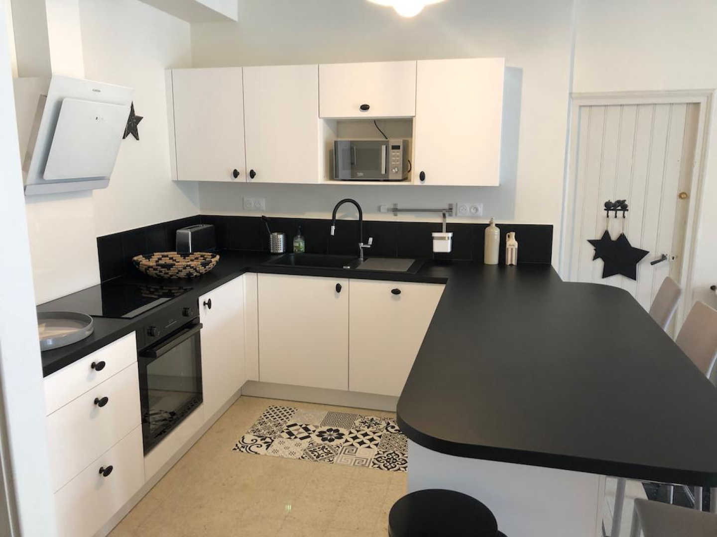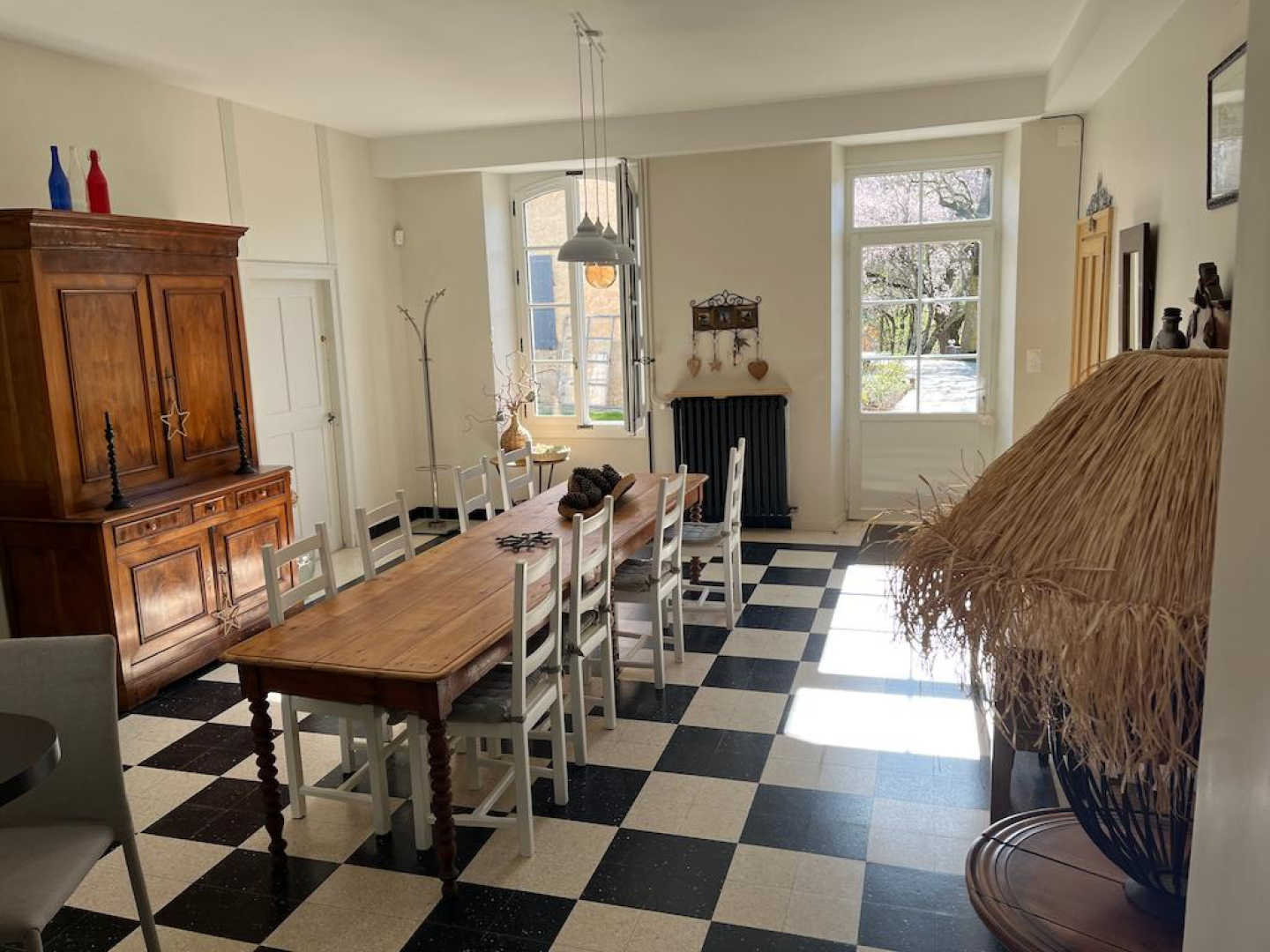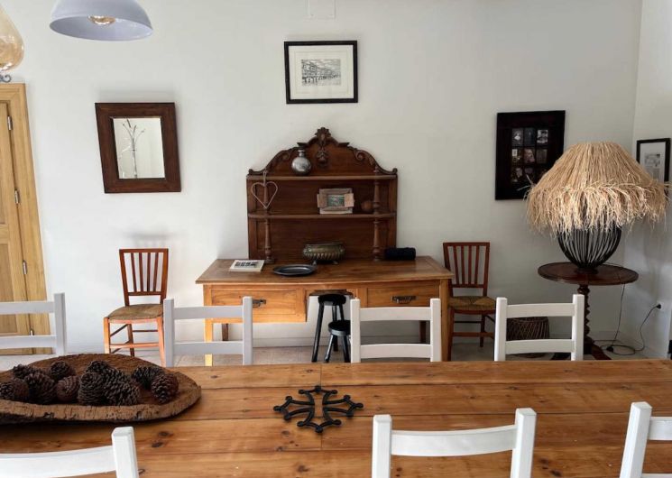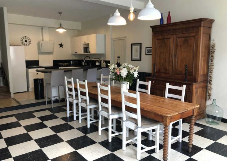 On entre dans le gîte directement dans la grande salle à manger avec cuisine ouverte toute équipée (réfrigérateur, four, lave-vaisselle, micro-ondes, cafetière filtre + Nespresso, barbecue électrique), comptoir et chaise hautes, grande table (jusqu’à 14 couverts), vaisselier.