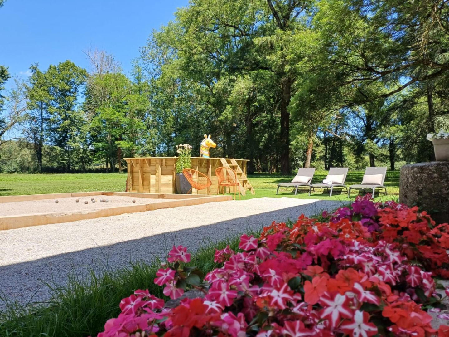 Piscine privative, hors-sol de 5x3m sur 1,20m de hauteur. La piscine est chauffée de début juillet jusqu’à mi-septembre, mais elle reste ouverte et accessible aux moins frileux jusqu’à mi-octobre.