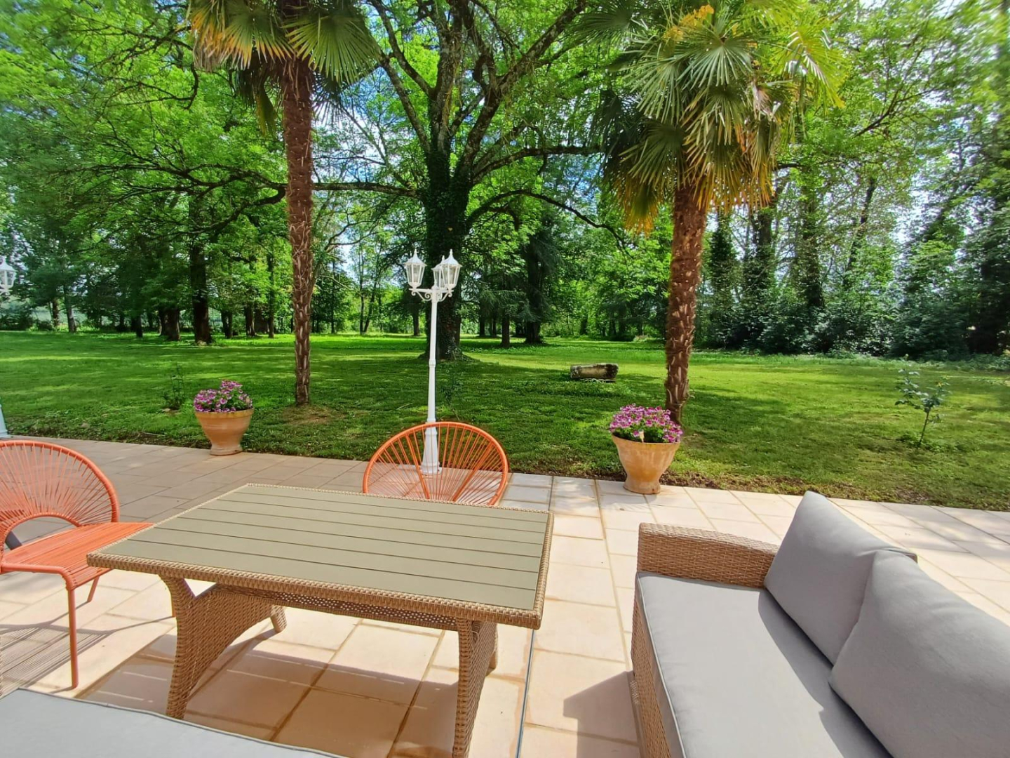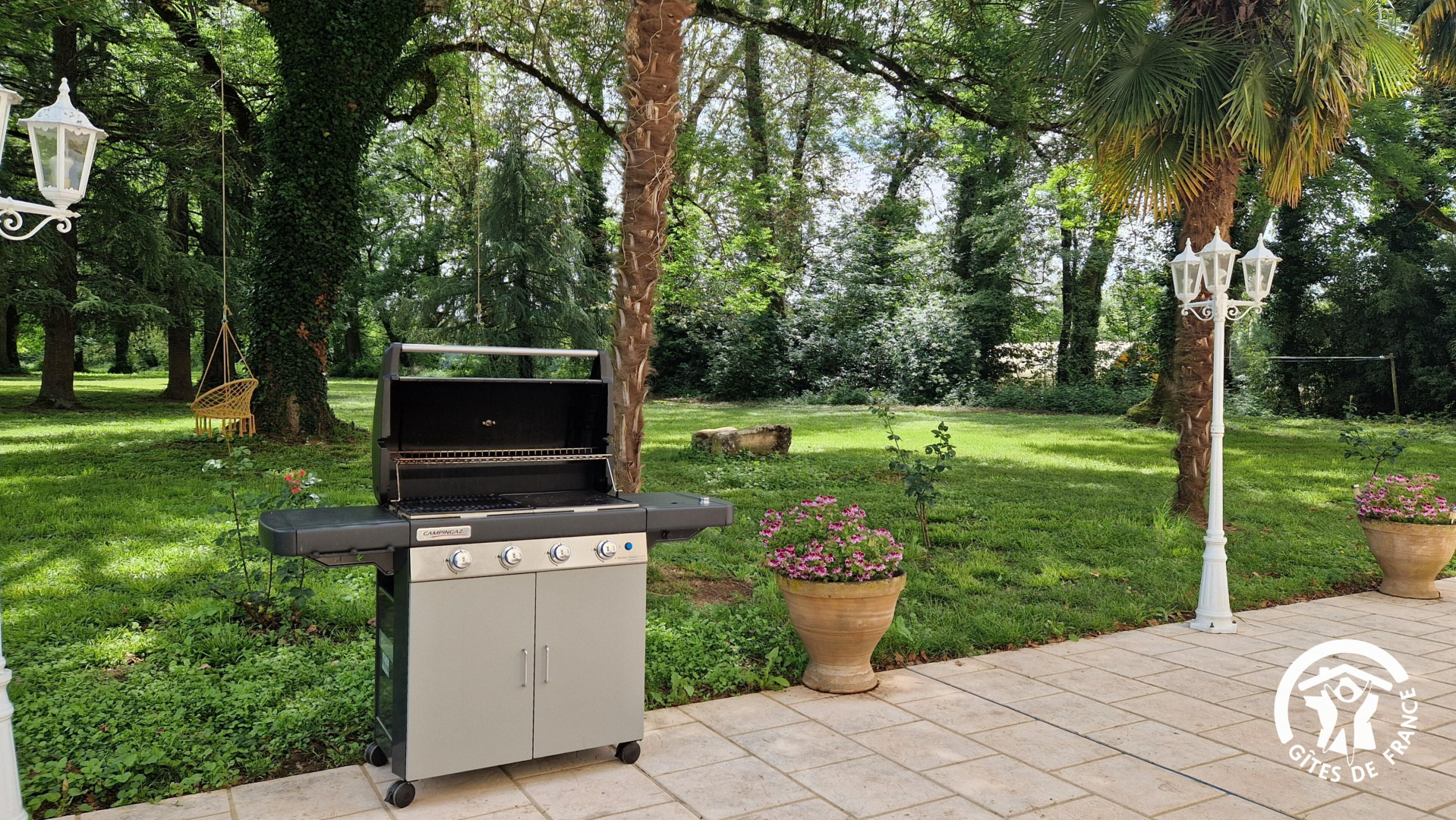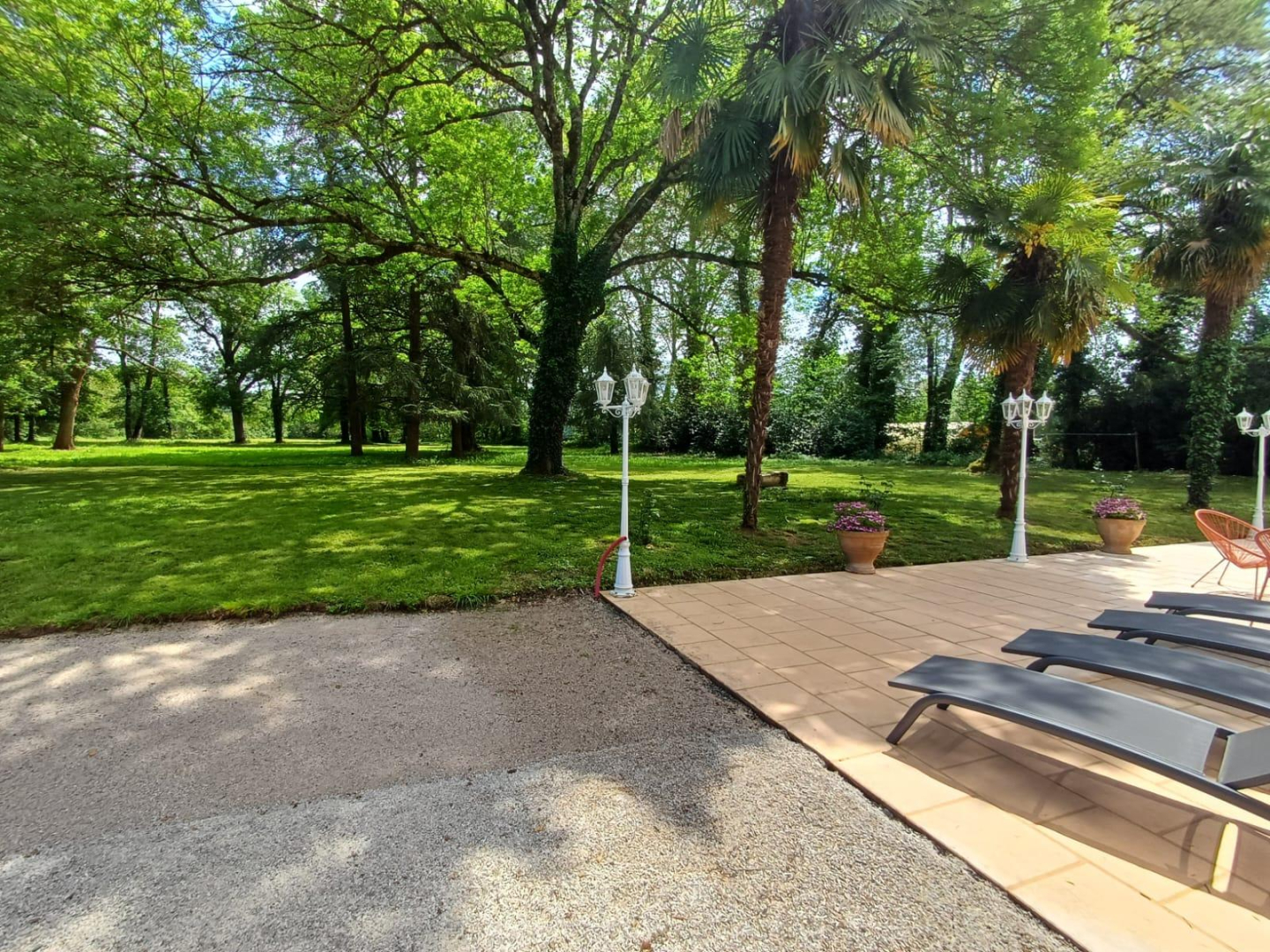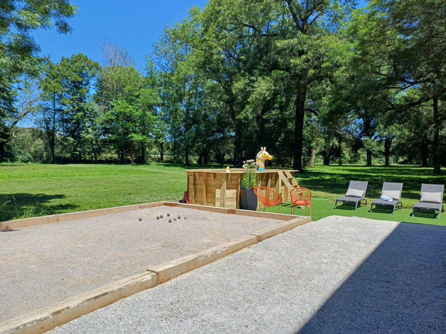 L’extérieur : un grand parc arboré pour le bonheur des petits et grands. Terrasse abritée par un auvent avec table et salon de jardin, terrain de pétanque et barbecue / plancha.