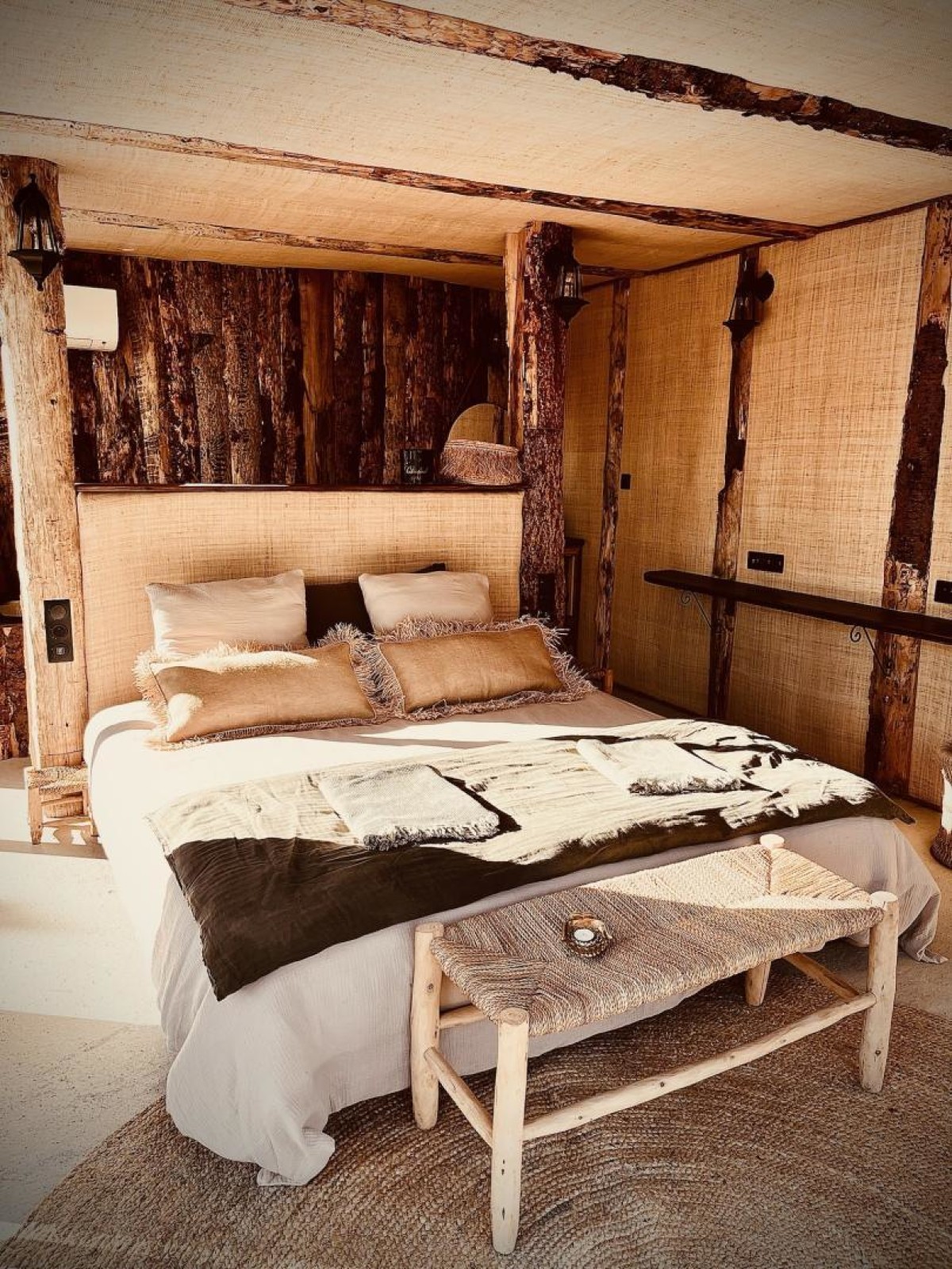 Une parenthèse hors du temps vous attend dans cette ferme privée de 5 000 m2, où un environnement luxuriant et élégant vous offre une vraie parenthèse de détente. Indépendants et entièrement autonomes, les quatre lodges proposent un cadre harmonieux fait de matériaux naturels, avec une décoration atypique qui invite à la déconnexion, au voyage et à l’évasion. Depuis la terrasse privative, vous profitez d’une vue dégagée sur l’oliveraie, idéale pour des repas en plein air. Située à Mauguio, commune réputée pour son marché, sa proximité avec les plages, l’étang de l’Or et le golf, Finca Lessya s’inscrit dans un paysage préservé du sud de la France. Chaque logement, de plain-pied, comprend une salle de bain et WC privatifs, ainsi qu’un espace intérieur fonctionnel : plateau d’accueil (cafetière, bouilloire, réfrigérateur, micro-ondes), chambre équipée de linge en coton, rangements, climatisation réversible et dispositifs de sécurité. Vous pourrez profiter d’un petit-déjeuner continental complet. Les extérieurs sont aménagés avec mobilier, coin repas, cuisine extérieure, barbecue, chaises longues et parasols. Vous accédez à de nombreux équipements : piscine lagon balnéothérapie chauffée avec plage de sable blanc, buses massantes, beds, parasols, serviettes, espace lounge (ouvert d’avril à novembre de 10h à 20h). Une paillote de 200 m2 offre un lieu convivial au cœur des oliviers, accompagnée d’un terrain de pétanque, d’un trampoline, de vélos, et d’un parking gratuit. En option, un espace spa privatisable de 60 m2 propose jacuzzi thérapeutique, sauna, douche, WC et coin coiffure. Des massages signature sont disponibles sur réservation. Les alentours offrent plages, activités nautiques, balades, découvertes de la Petite Camargue, sorties culturelles à Montpellier et Sète, villages typiques, soirées festives et de nombreuses activités de loisirs. Possibilité de table d’hôte selon la saison, livraison Uber Eats et conseils sur les bonnes adresses locales. – Au cœur de la Finca Lessya, le Lodge Prestige de l’Oliveraie offre un cadre paisible et raffiné, avec terrasse privative ouverte sur l’oliveraie et accès direct à la piscine. La chambre séduit par son atmosphère douce et élégante. L’espace nuit s’ouvre sur une salle de bain ouverte, où la baignoire invite à la détente. Les matières naturelles, les lignes épurées et la lumière délicate composent un ensemble harmonieux, propice au repos. Une literie haut de gamme avec lit King size (180×200). La terrasse prolonge naturellement l’espace de vie et permet de savourer pleinement la quiétude du domaine. Petit déjeuner inclus et parking privé complètent cette parenthèse chic et apaisante, idéale pour se ressourcer en toute sérénité.