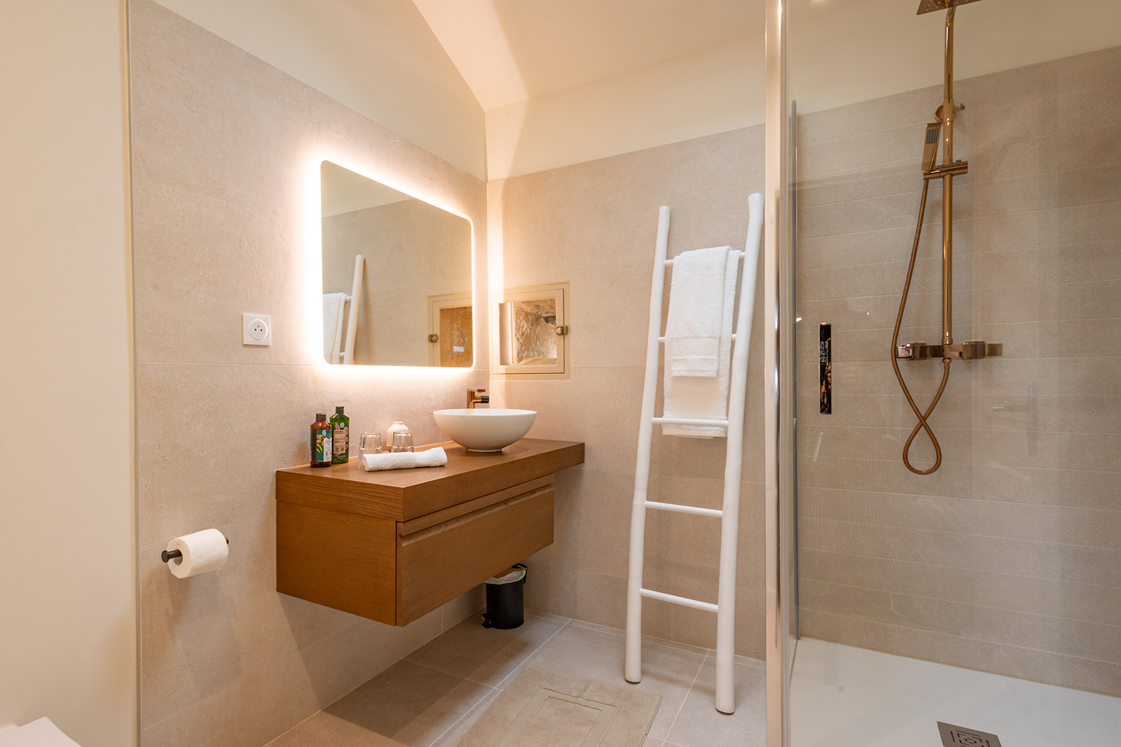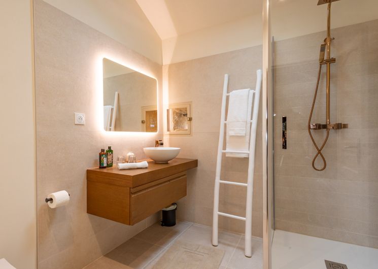 En empruntant l’escalier, vous accederez à un coin télévision qui dessert deux chambres avec vue, ainsi que leur salle d’eau et WC privatifs.