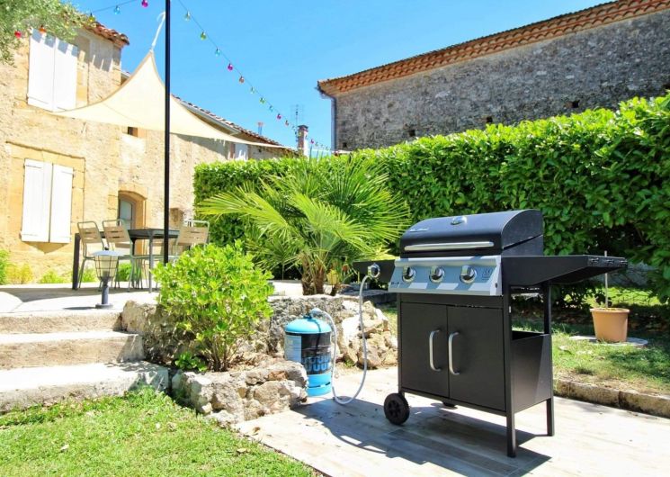 Barbecue à gaz, salon de jardin, bains de soleil, terrain de pétanque au fond du jardin.