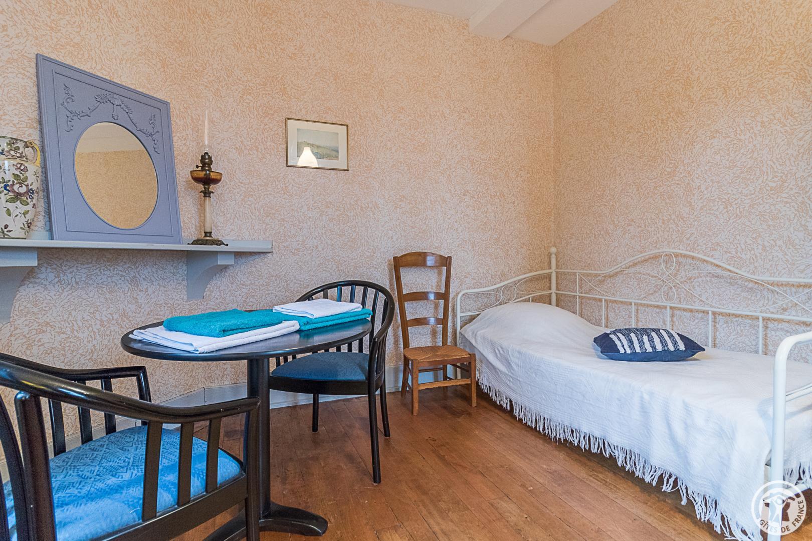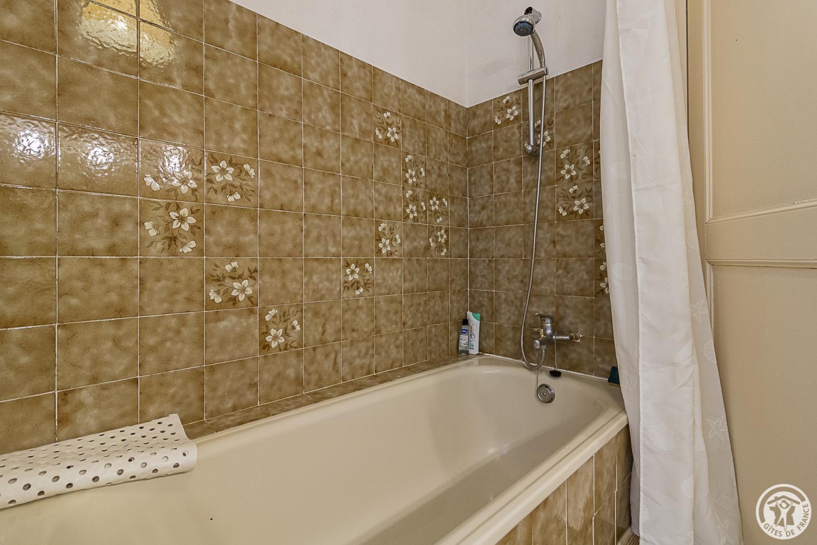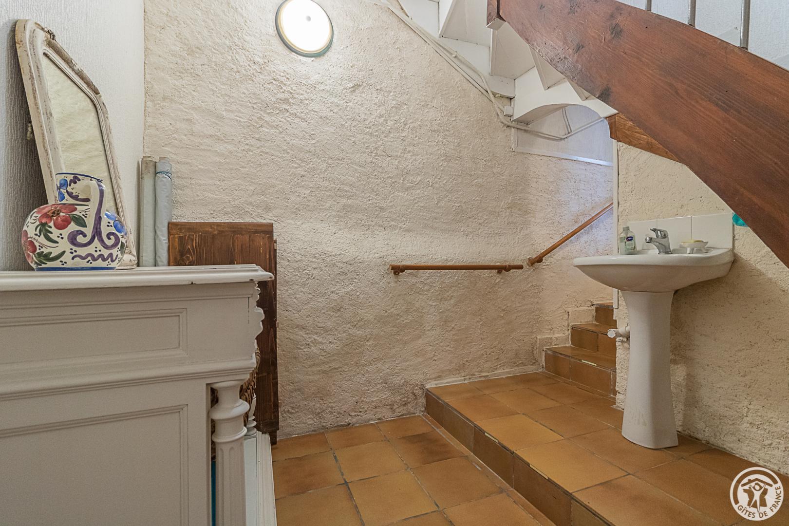 Two staircases lead up to the first floor. The main staircase leads to Bedroom 1 and Bedroom 2, each with 1 x 140cm double bed + 1 x 90cm single bed, and a bathroom. Bedroom 3 (1 double bed 140cm) communicates with Bedroom 2 (adjoining rooms) but can also be accessed via a secondary staircase to be independent. Bedroom 4 is a small room for 1 person (1 bed 120cm) at the top of the secondary staircase, which must be crossed to access Bedroom 3.