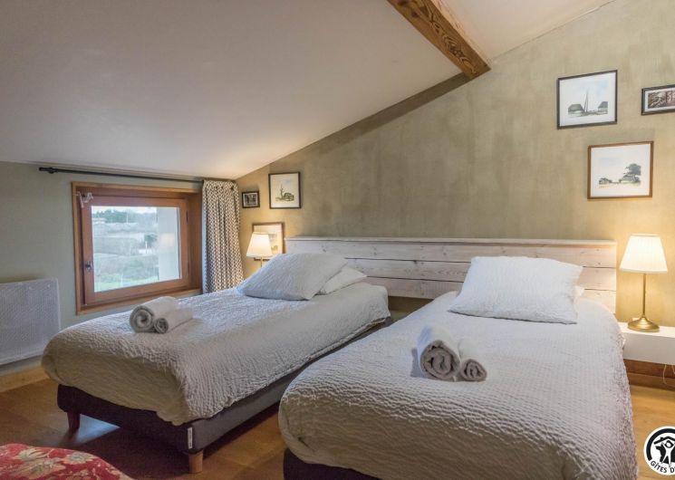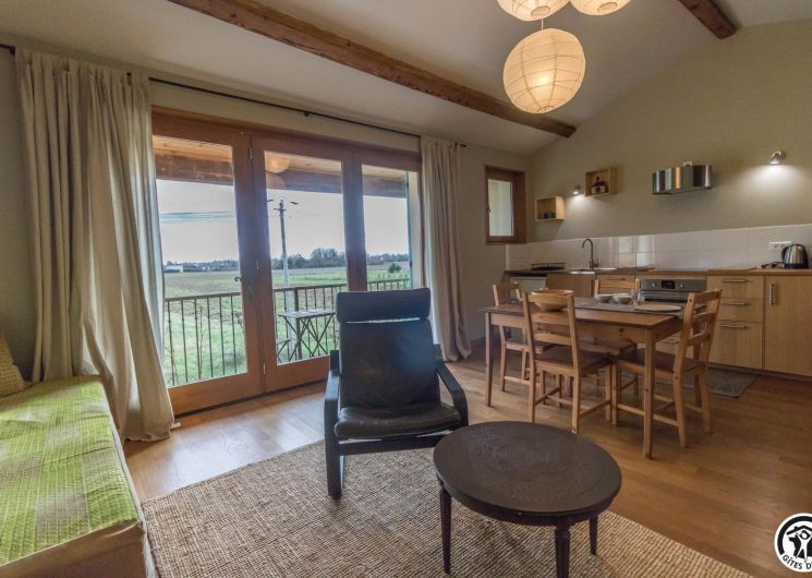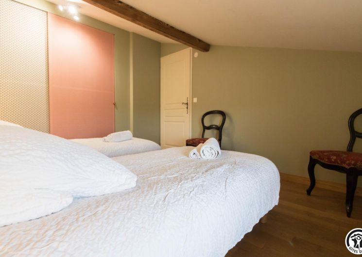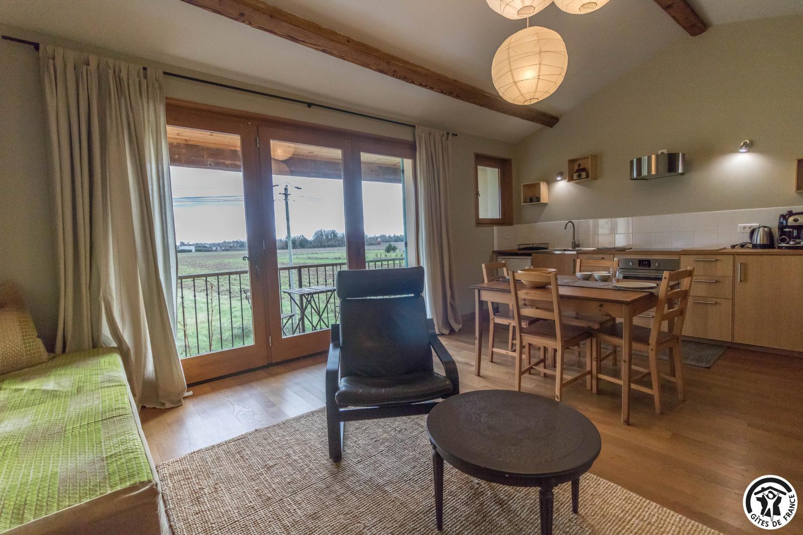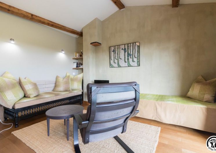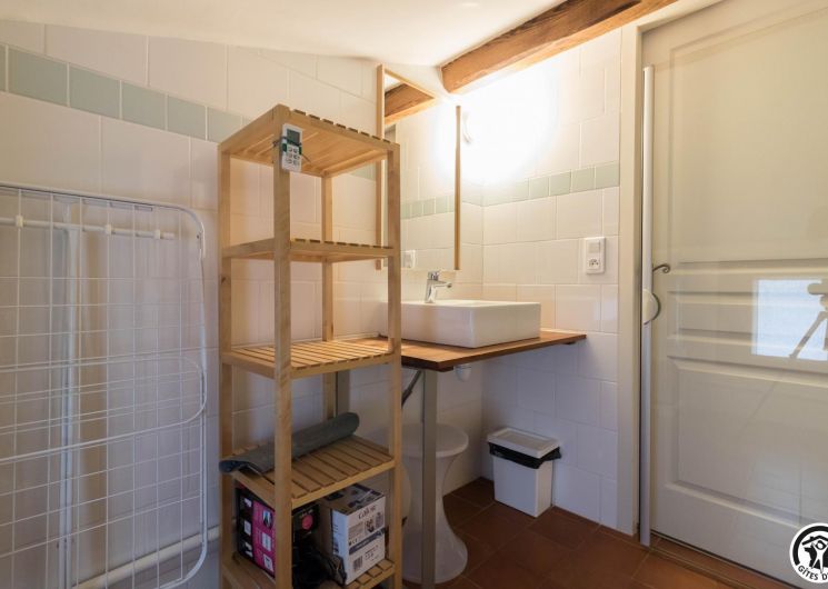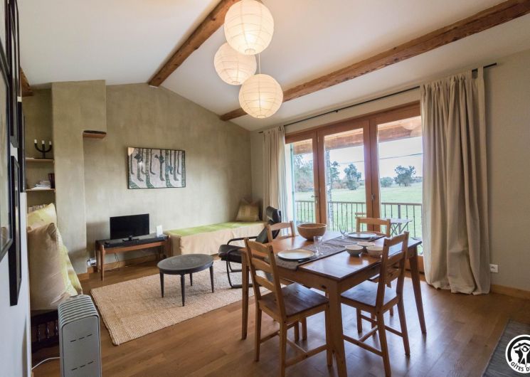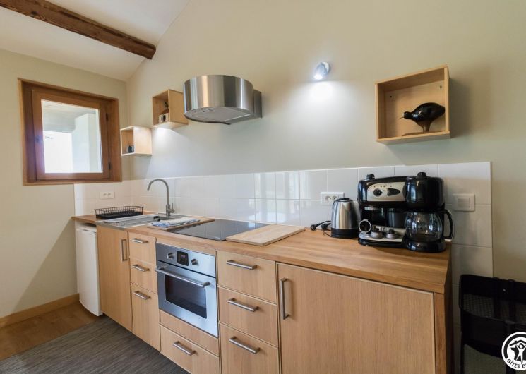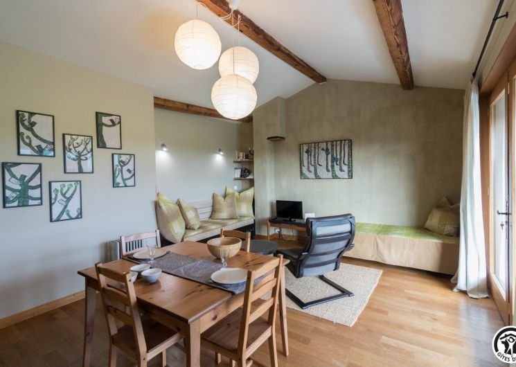 Gîte on the first floor: entrance, living room (80cm bed) with kitchenette opening onto a south-facing balcony, attic bedroom (2 twin 90cm single beds), shower room, WC.