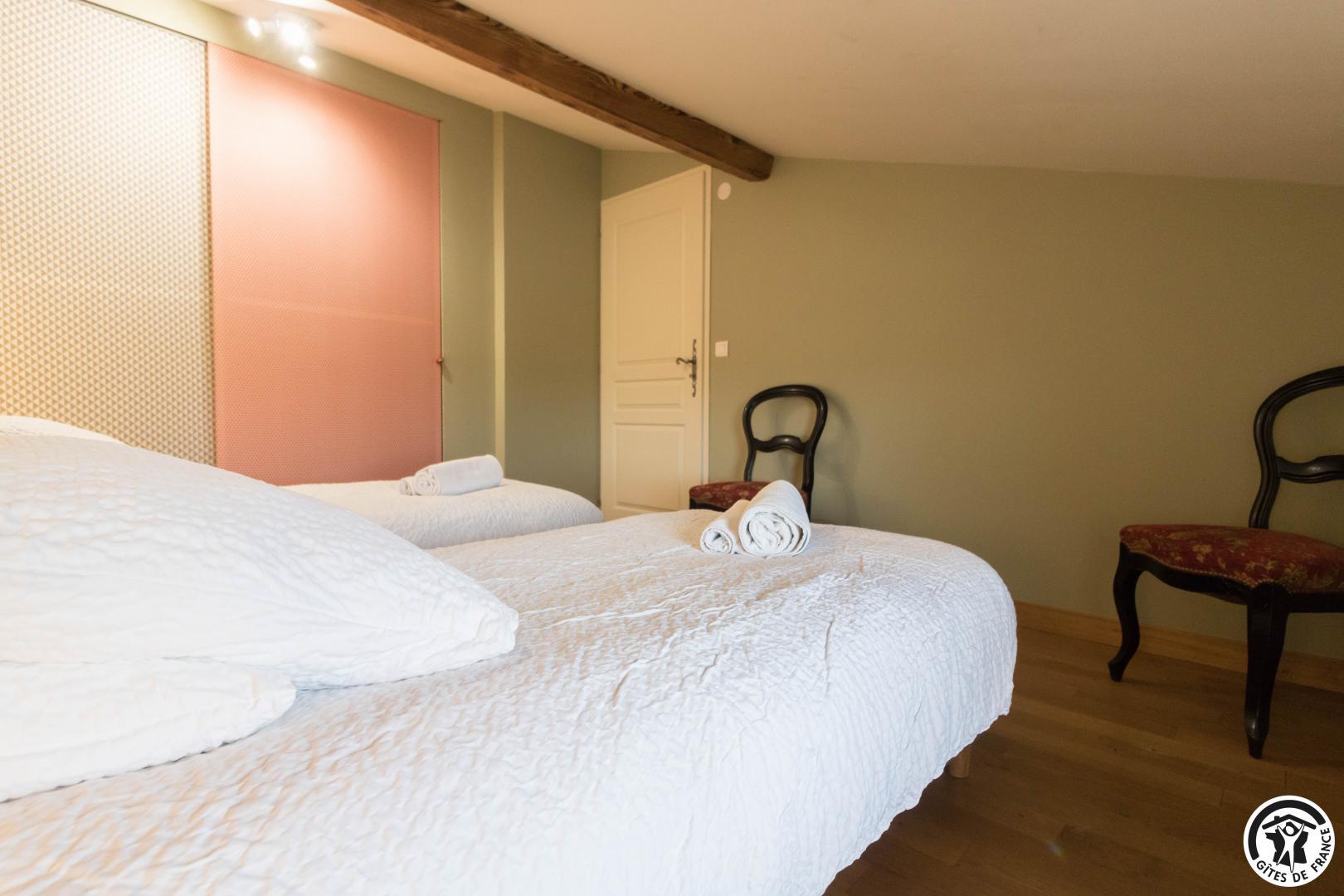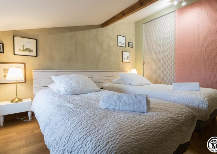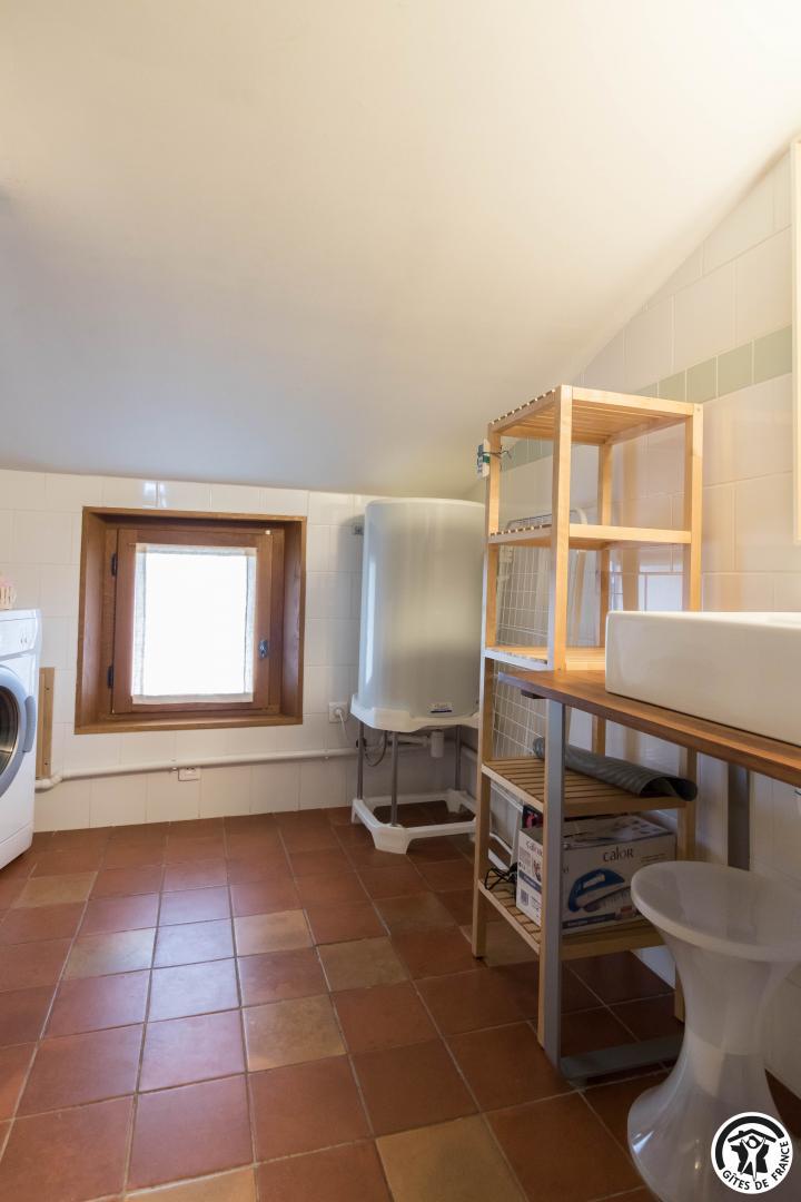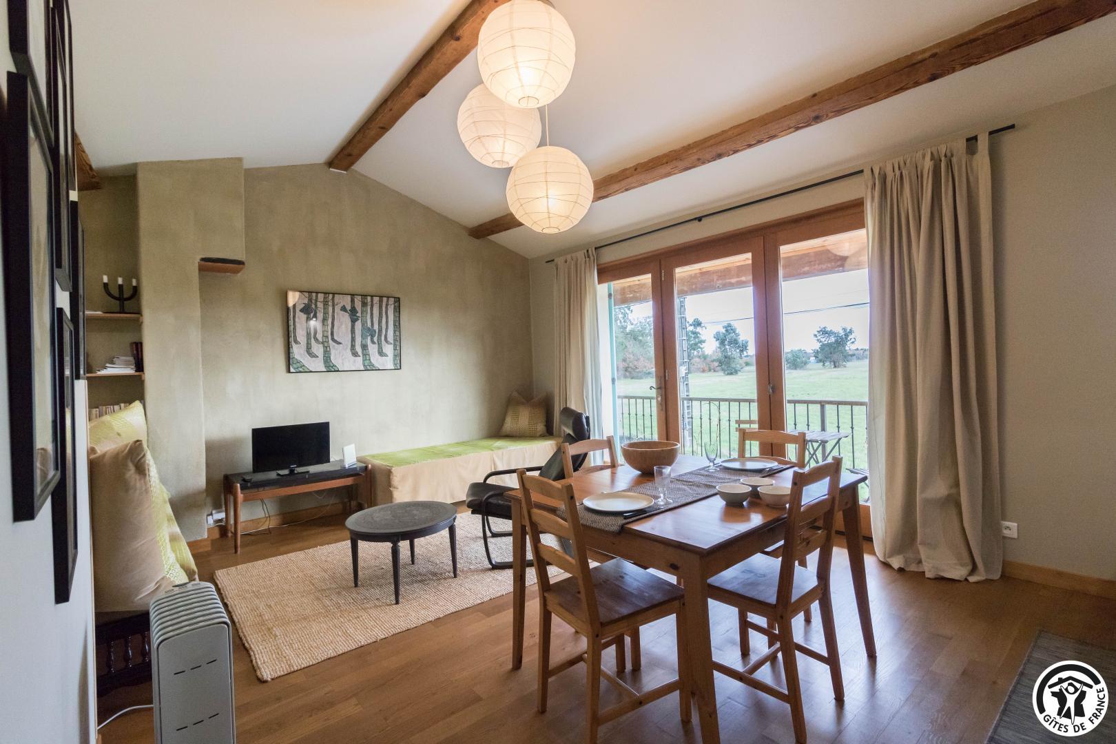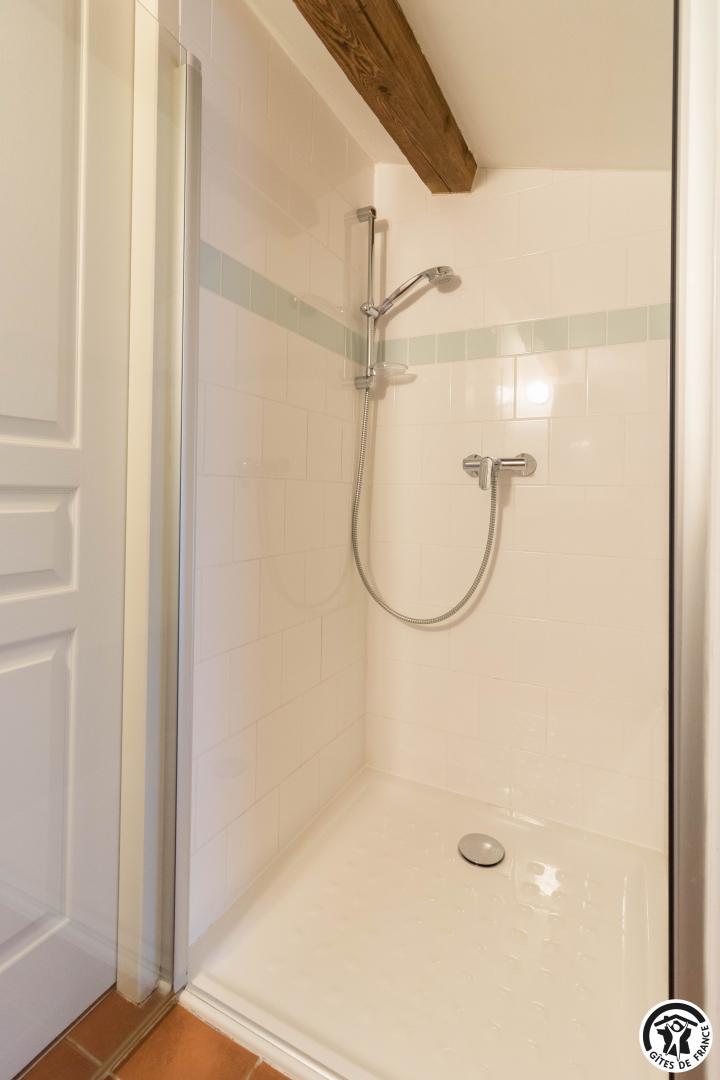Gîte on the first floor: entrance, living room (80cm bed) with kitchenette opening onto a south-facing balcony, attic bedroom (2 twin 90cm single beds), shower room, WC.