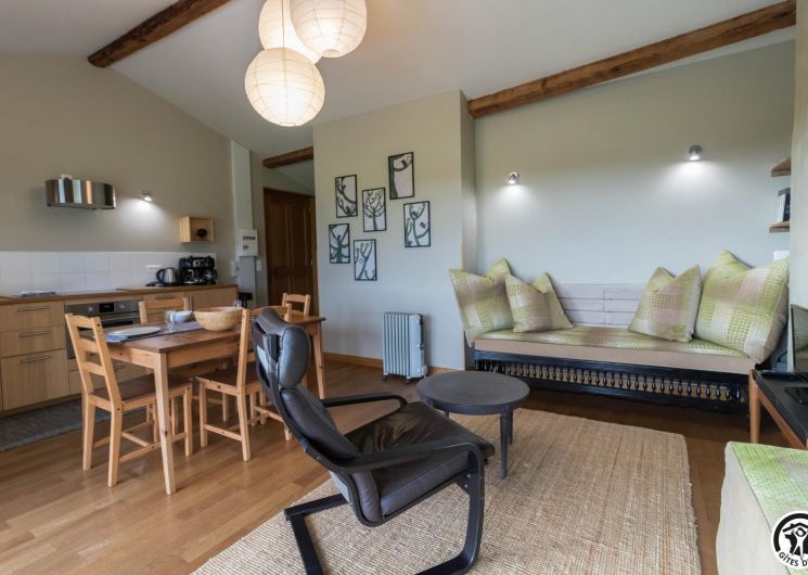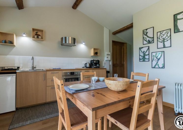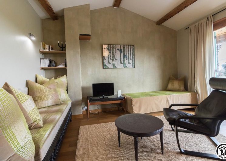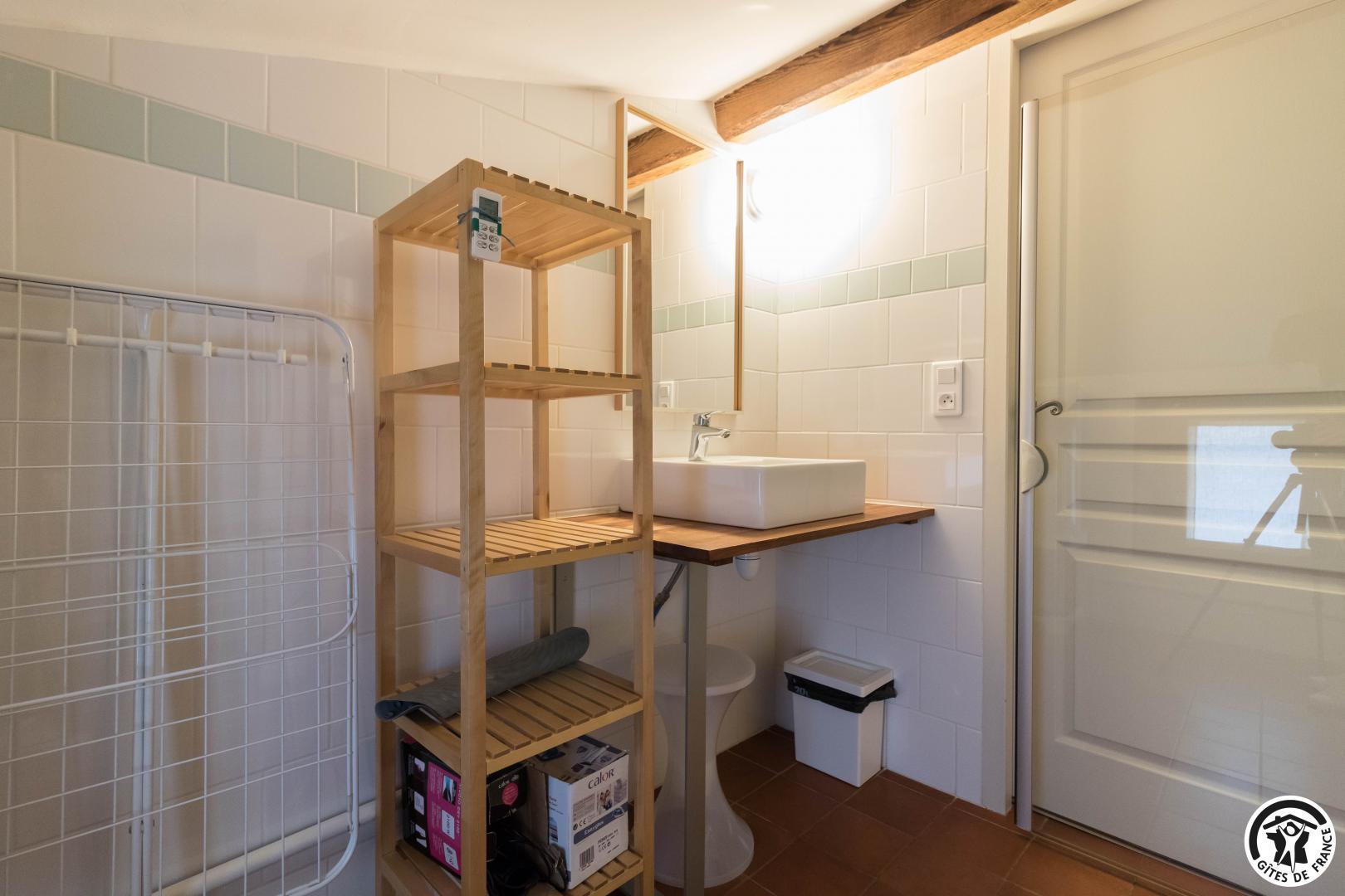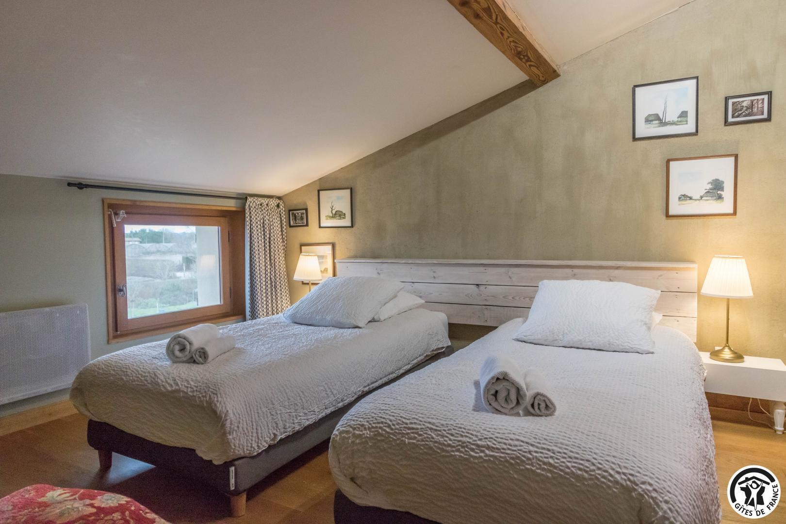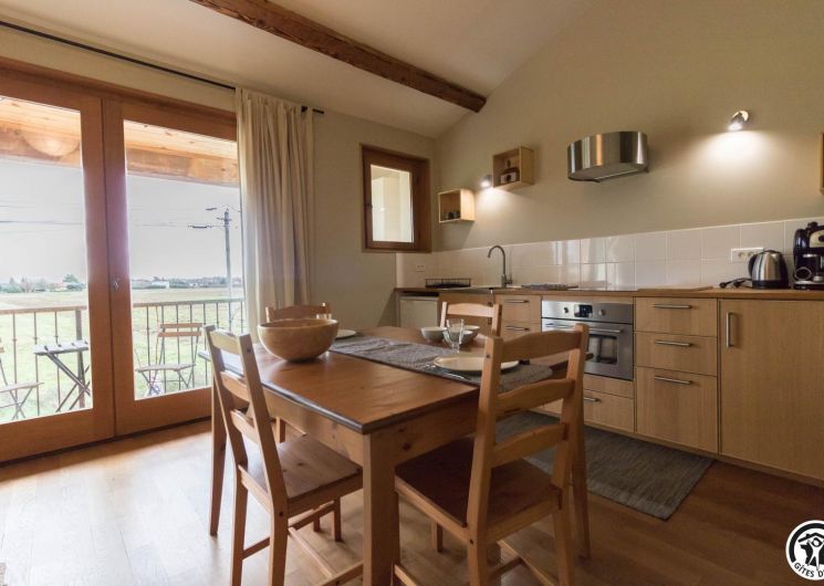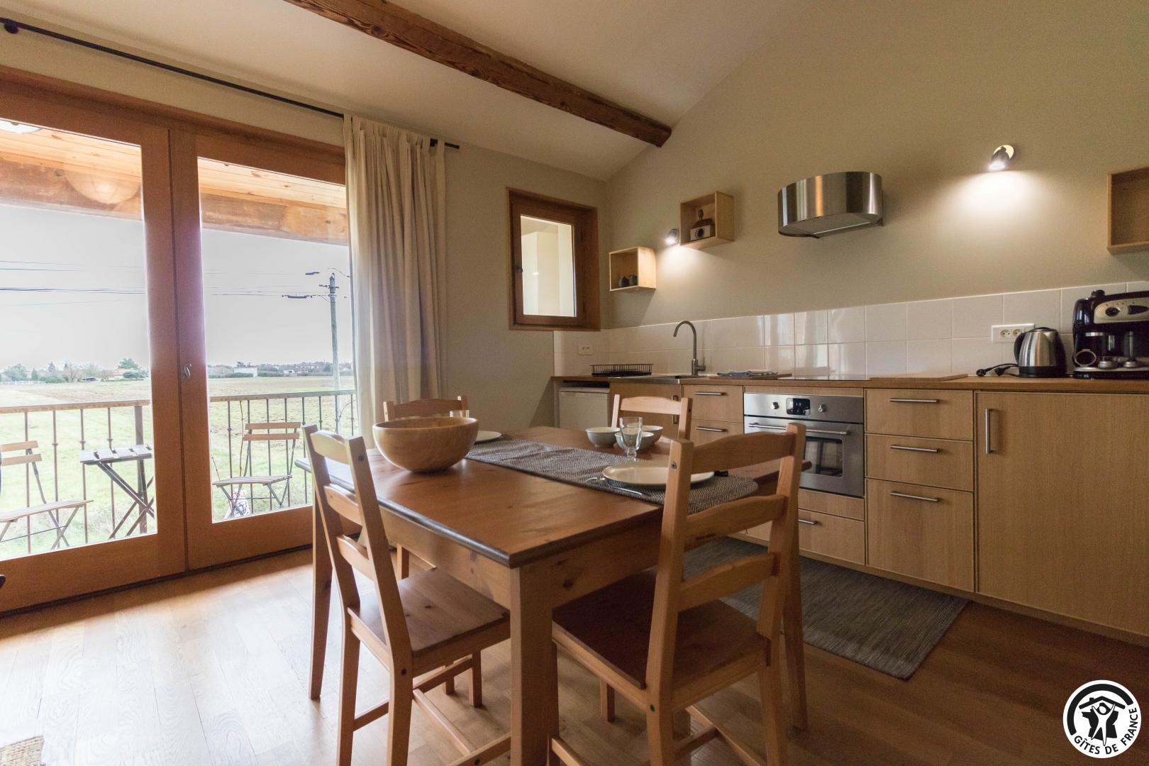 Gîte on the first floor: entrance, living room (80cm bed) with kitchenette opening onto a south-facing balcony, attic bedroom (2 twin 90cm single beds), shower room, WC.