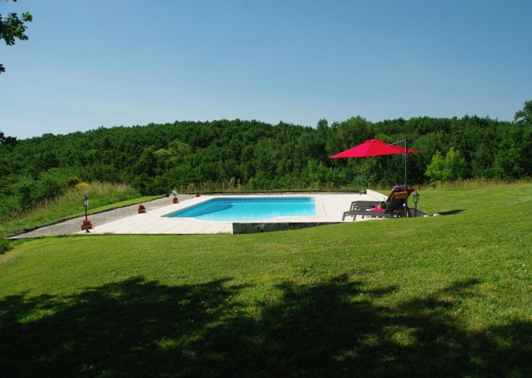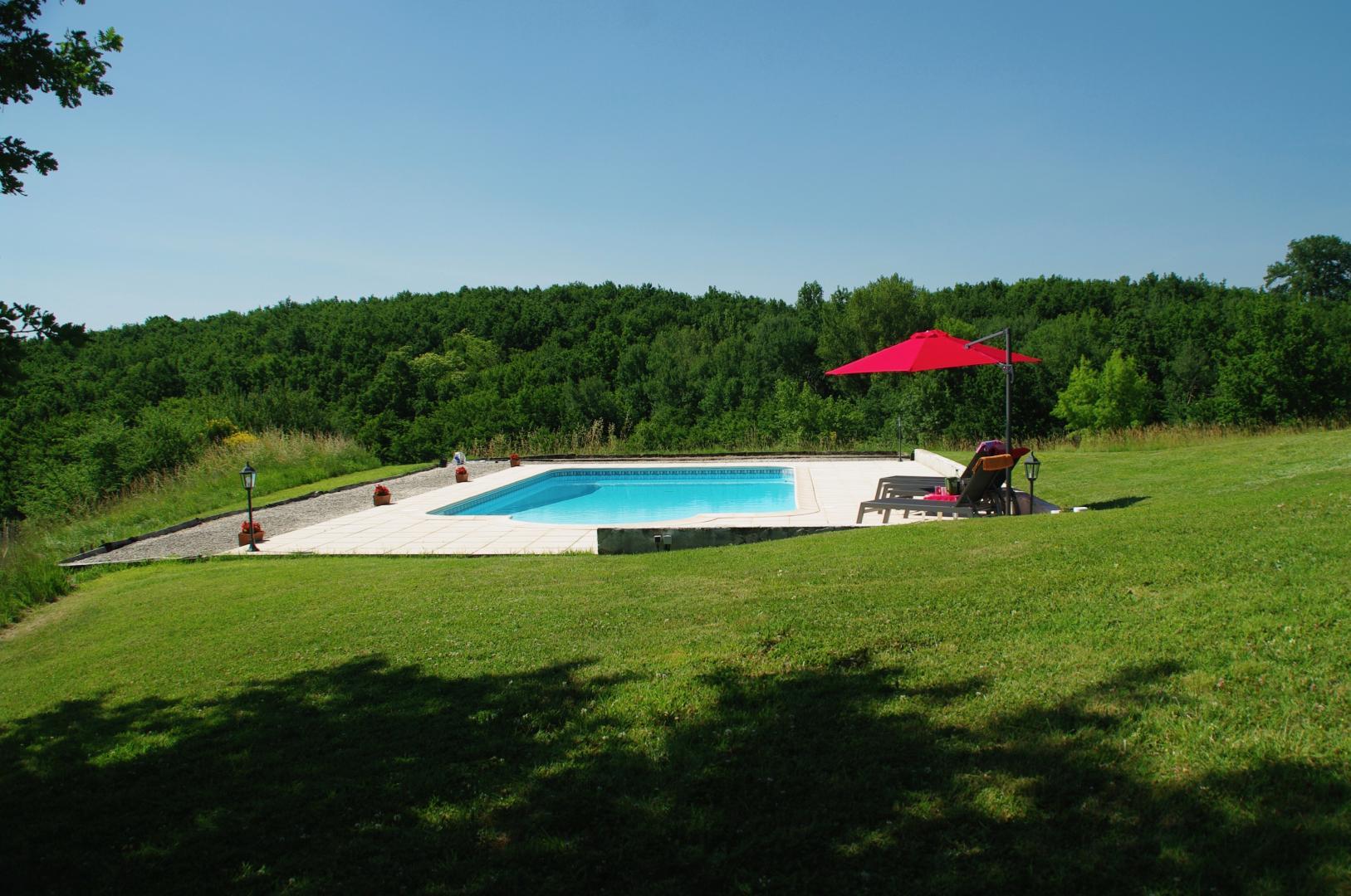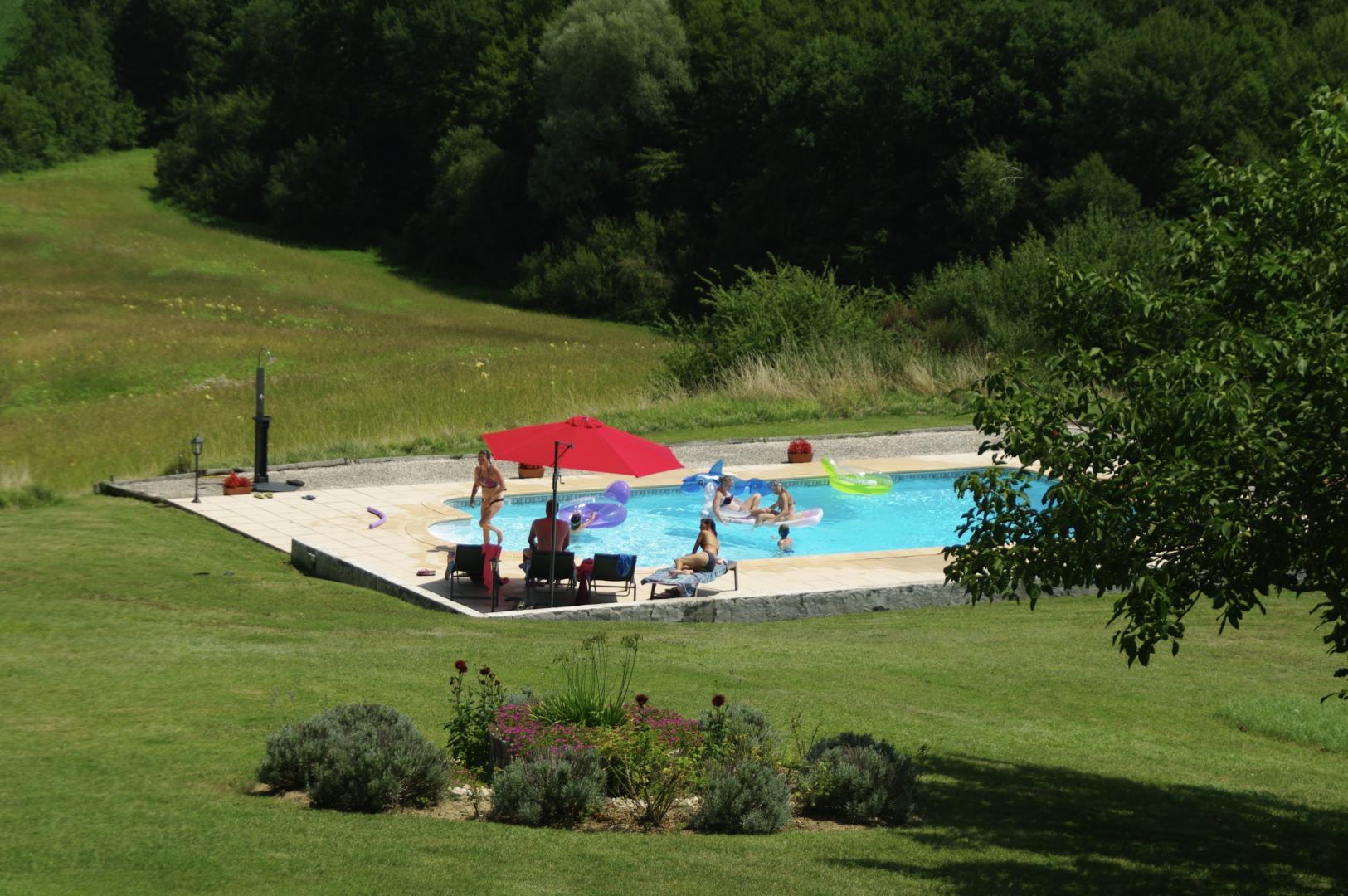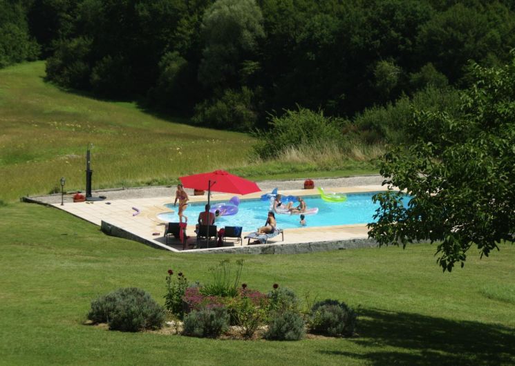 À l’extérieur, profitez d’une grande terrasse couverte avec salon de jardin et d’une jolie vue sur la piscine et la campagne vallonnée. Le jardin partagé propose un boulodrome et un sauna à côté de la piscine privative (12 x 6 m, profondeur de 1 à 2,20 m, sécurisée par alarme). Parking à proximité immédiate du gîte.