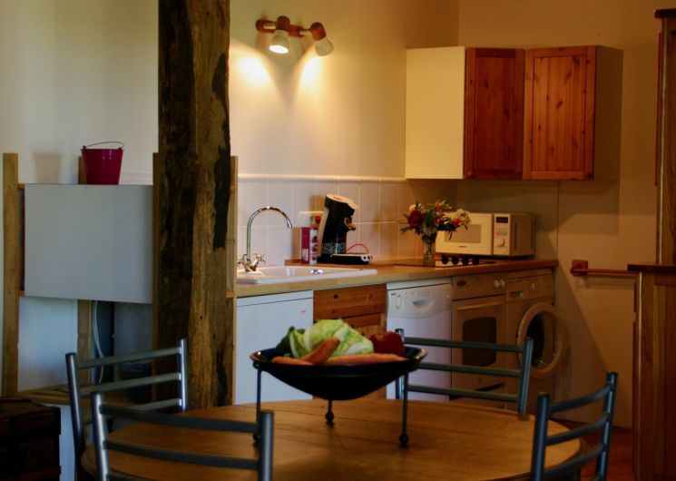 Le gîte, aménagé dans la grange d’un ancien corps de ferme de La Dague Haute, propose une ambiance moderne et chaleureuse. Au rez-de-chaussée, vous trouverez une cuisine ouverte entièrement équipée (four, micro-ondes, lave-vaisselle, réfrigérateur, congélateur, bouilloire, cafetières), un salon avec canapé et télévision, une salle à manger conviviale et des toilettes indépendantes.