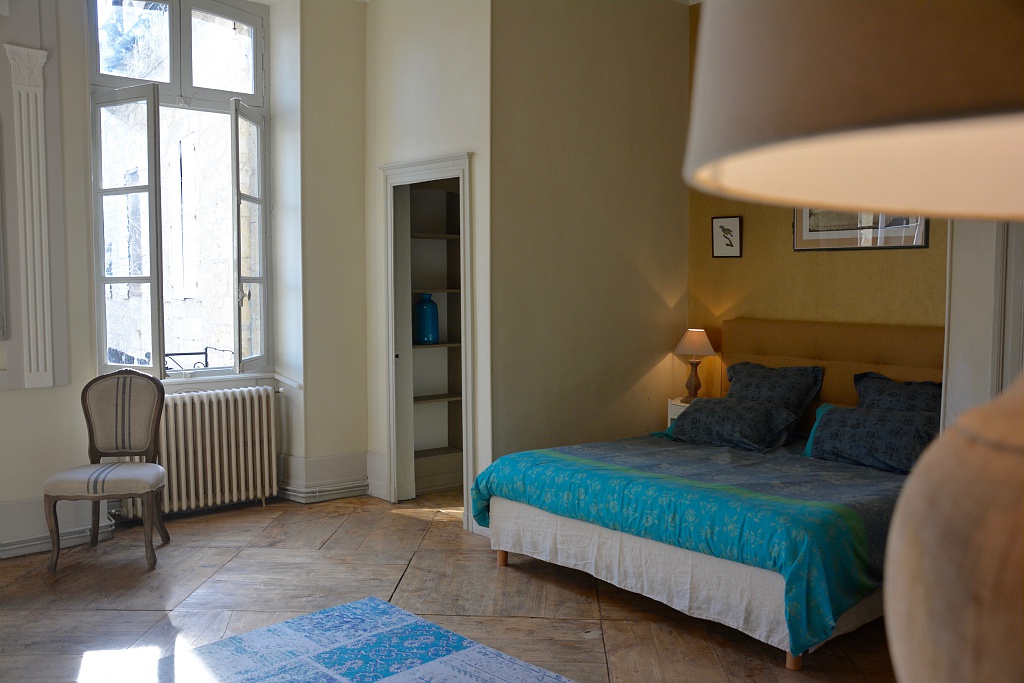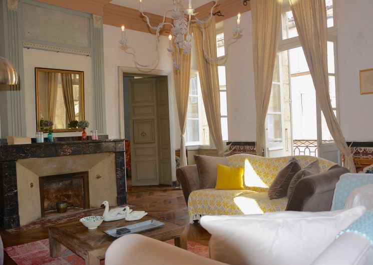 Appartement de prestige en face de la cathédrale de Lectoure, au 1er étage d’un immeuble ancien, avec des éléments de décor 19ème, pièces spacieuses, 2 grandes chambres, 2 salles de bain, 2 balcons