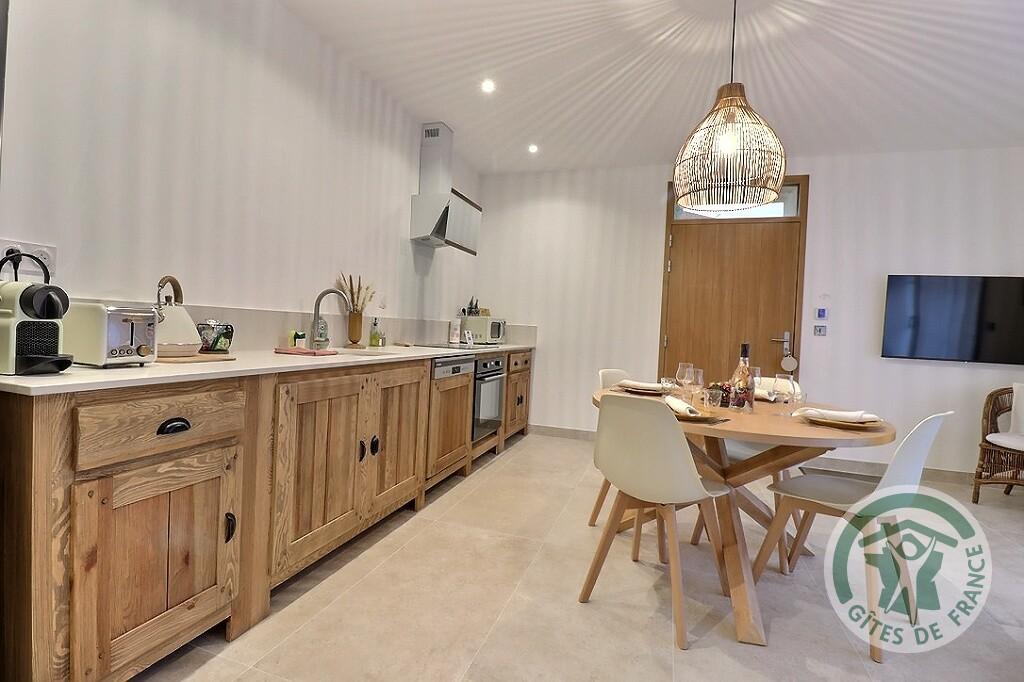 This 58 m2, single-storey gîte can accommodate up to 4 people in a typical farmhouse. Spacious and bright, it offers a warm atmosphere combining modern comfort and rural charm. It comprises two bedrooms, each with a double bed (160 cm) that can be converted into two single beds (80 cm), a living room with fully-equipped kitchen, a bathroom with shower and separate toilet. A private terrace extends the living space, allowing you to take full advantage of outdoor meals and warm Camargue evenings.