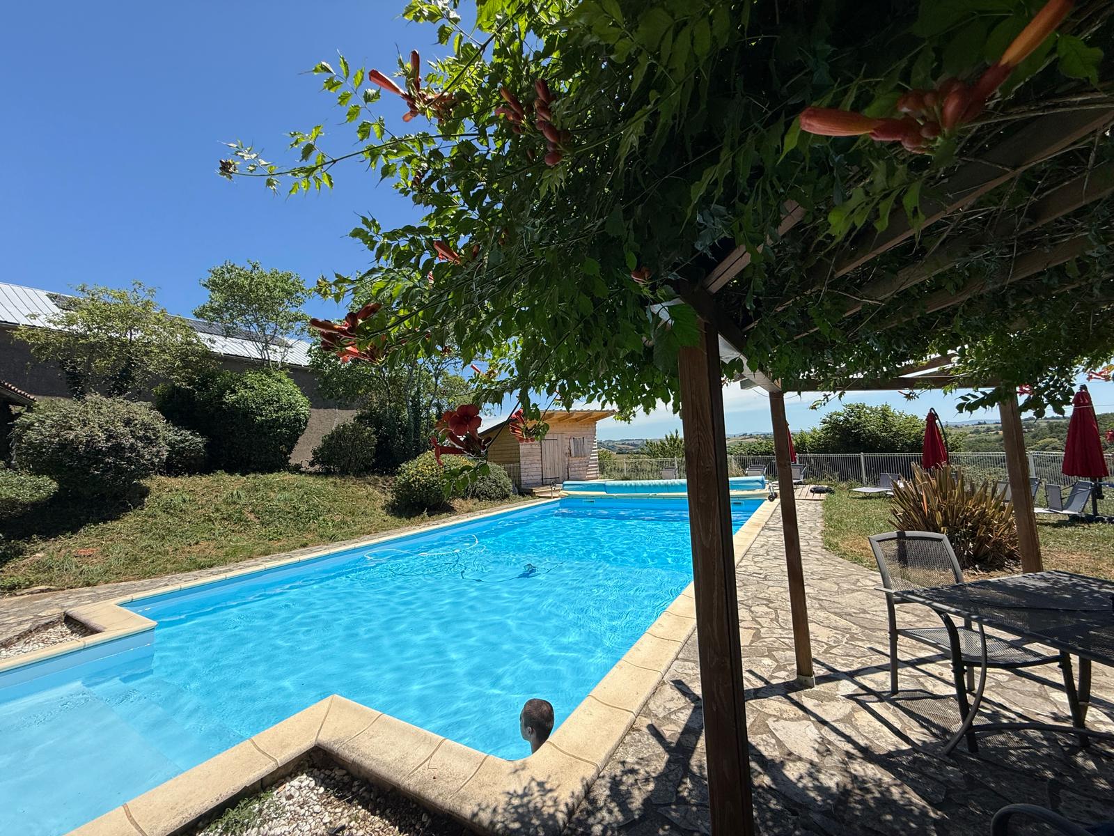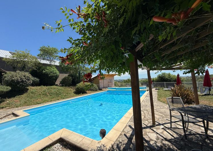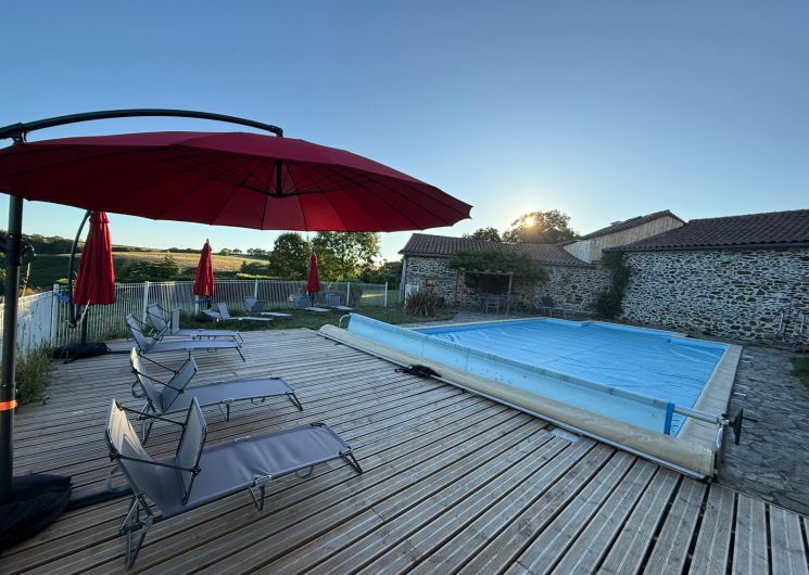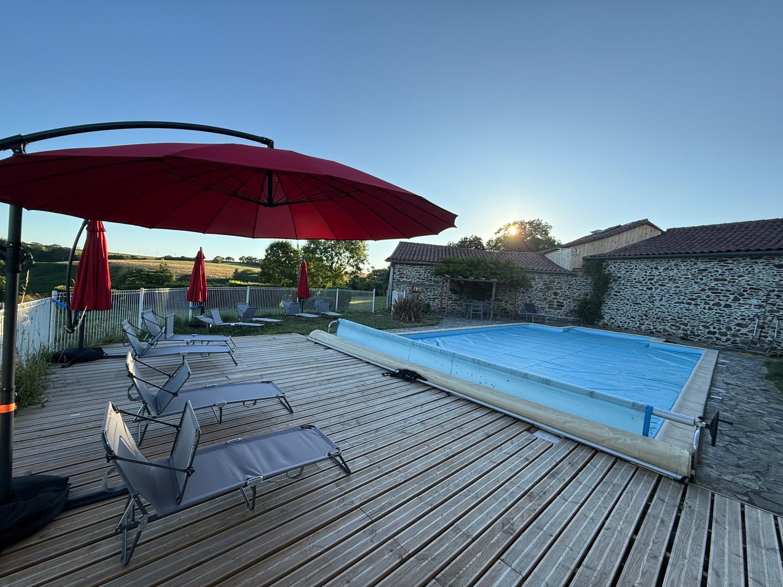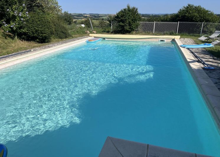 Extérieur : piscine et son poolhouse avec vue sur la campagne dégagée et dans un calme impressionnant. Dotée de dimensions généreuses (12x6m), en retrait de la maison et du gîte pour pouvoir en profiter pleinement, elle est équipée d’une terrasse et d’un poolhouse avec douche et wc. Piscine ouverte de mi-mai à fin septembre.