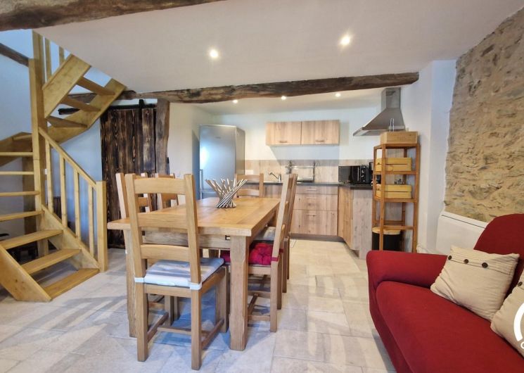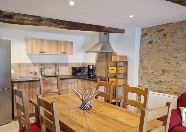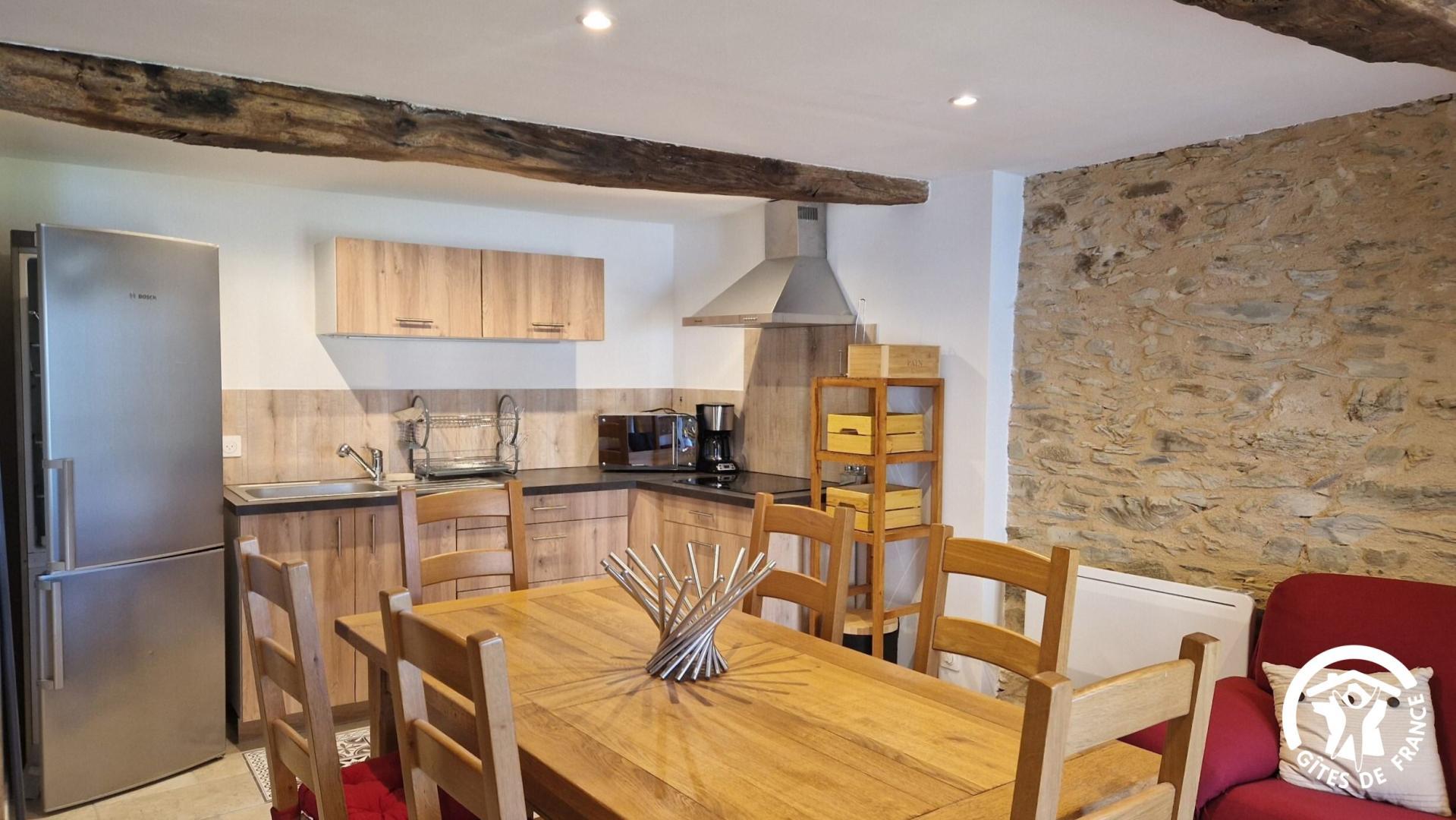 – Cuisine équipée avec réfrigérateur et congélateur, cafetière filtre, grille-pain, bouilloire, micro-ondes combiné four. Cuisine ouverte sur le séjour avec table à manger et canapé, tv.