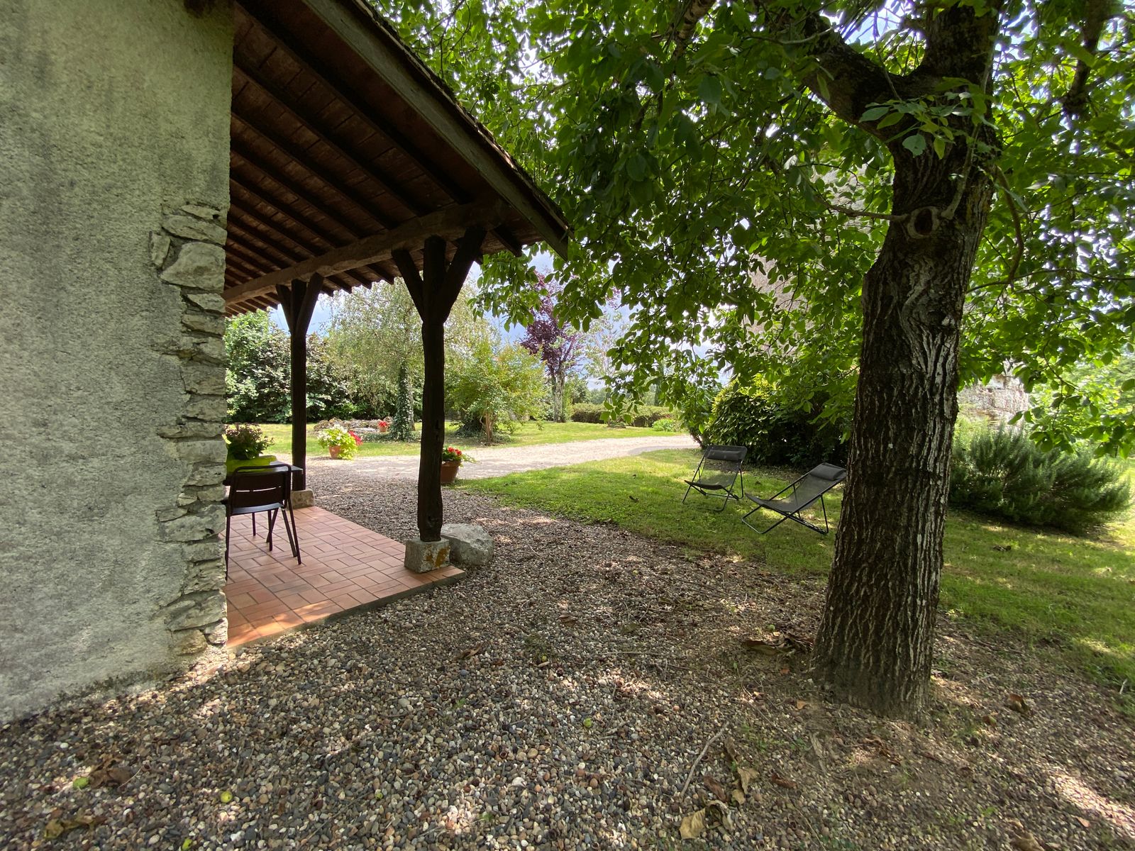Terrasse couverte privée (15 m2) avec transats. Parking privé.