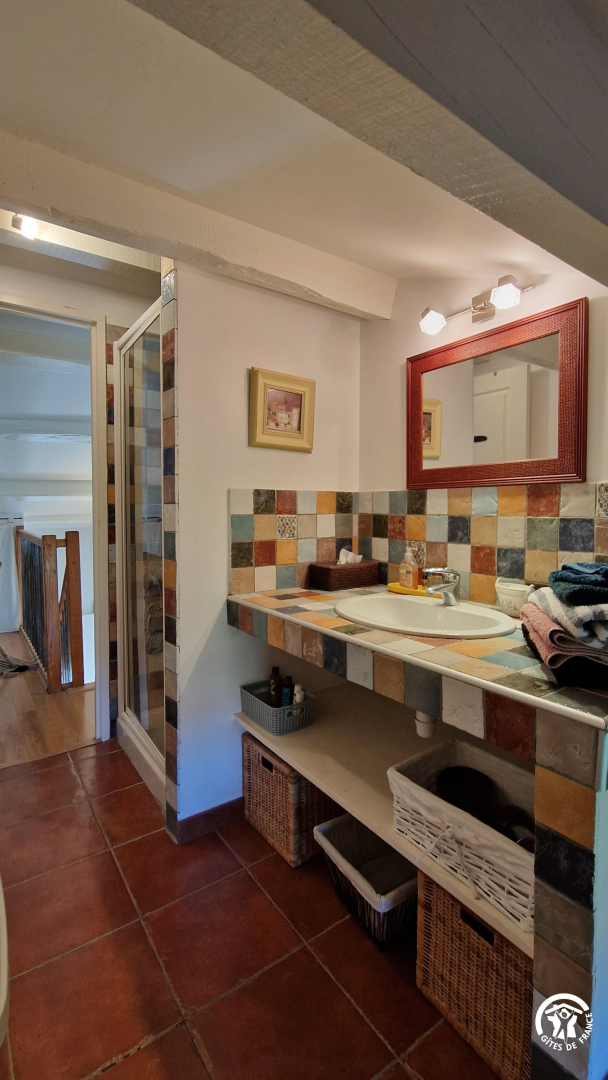A l’étage, une chambre ouverte sur l’escalier et climatisée équipée d’un lit double en 140x190cm et un lit simple en 90x200cm; ainsi qu’une salle d’eau (douche et vasque).