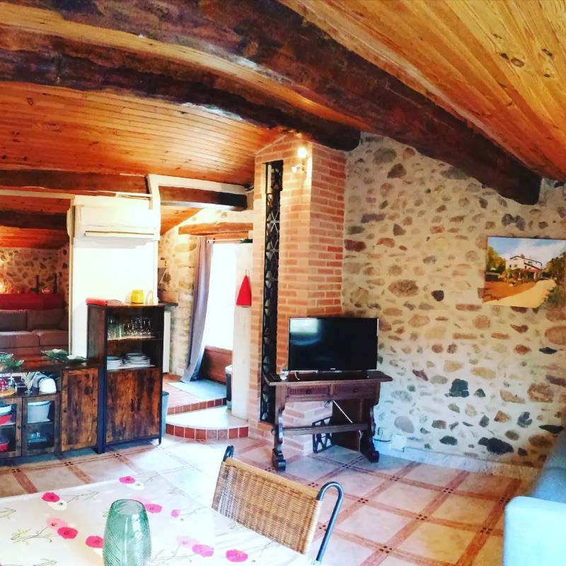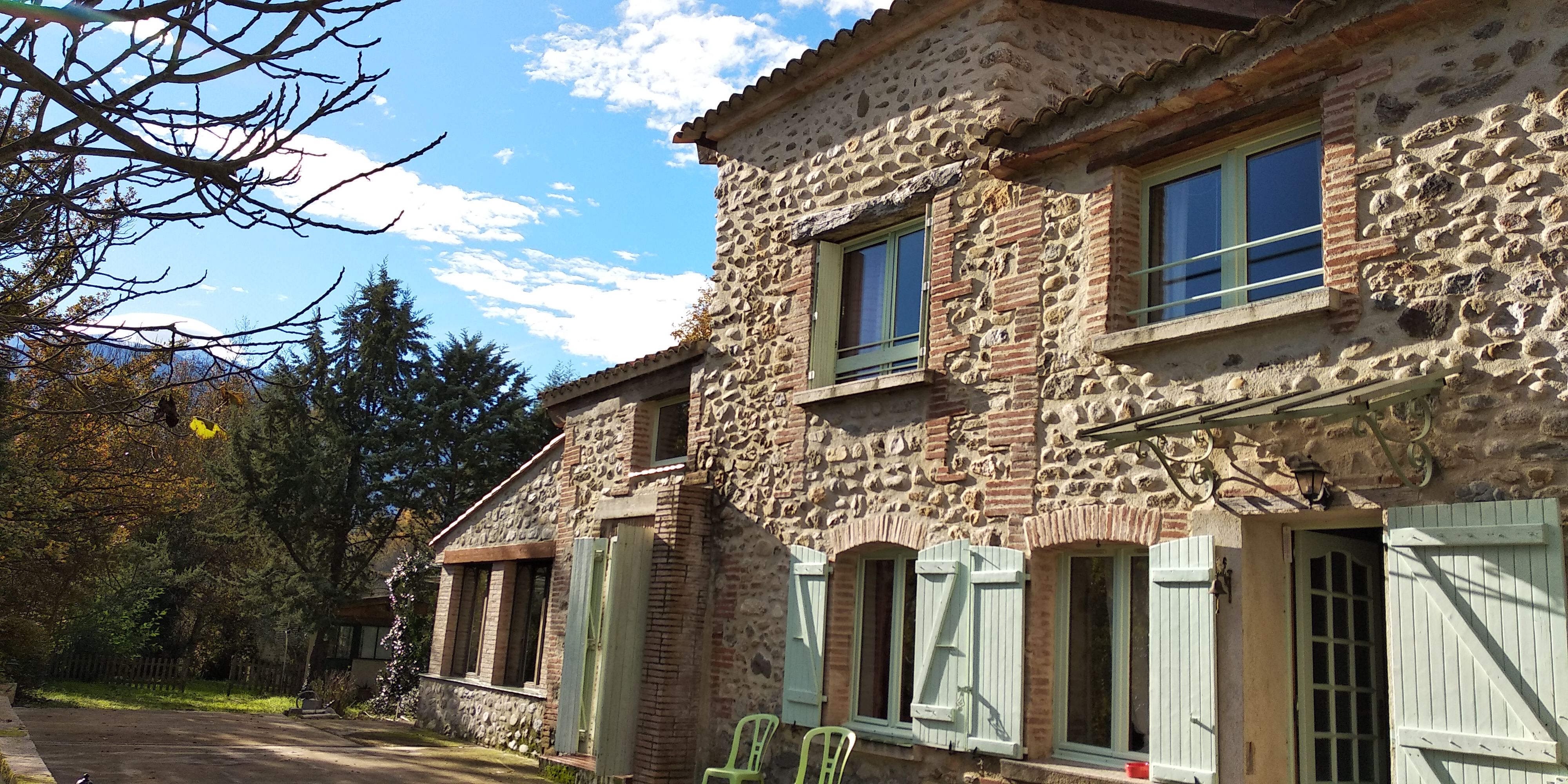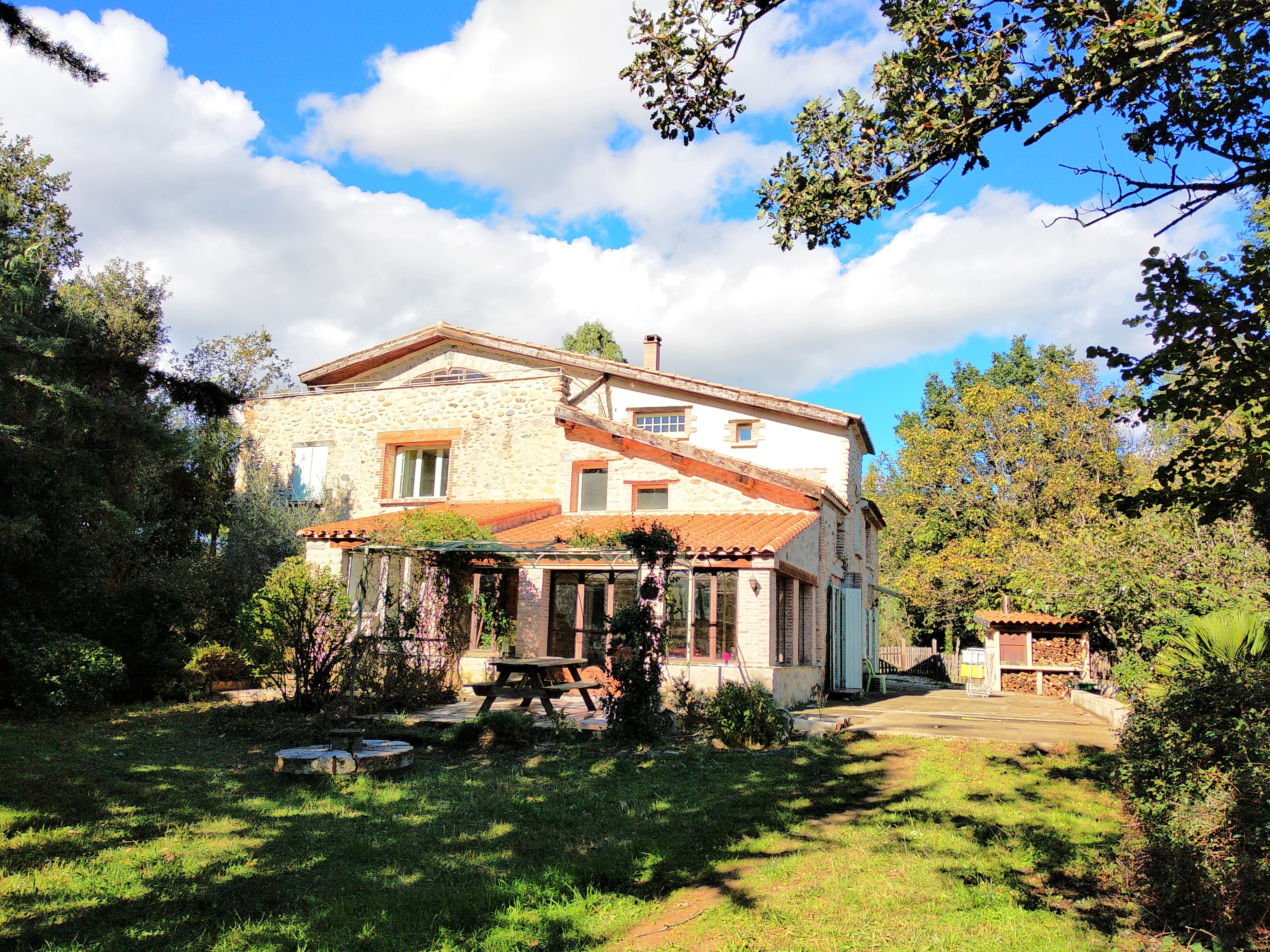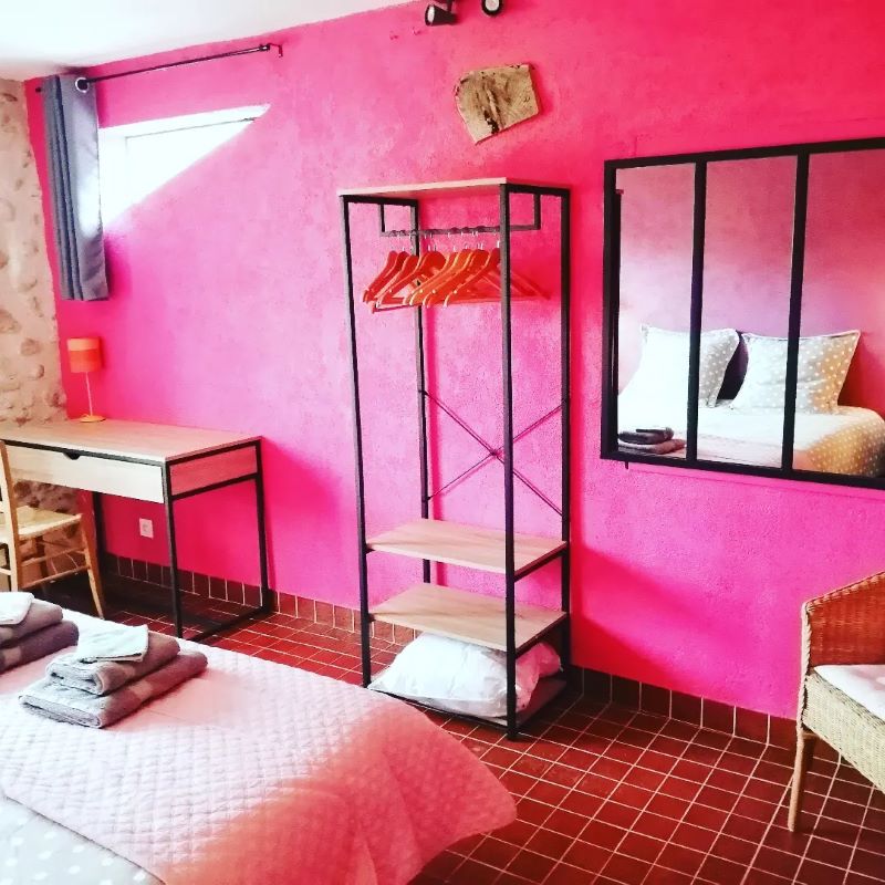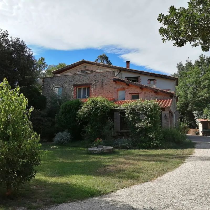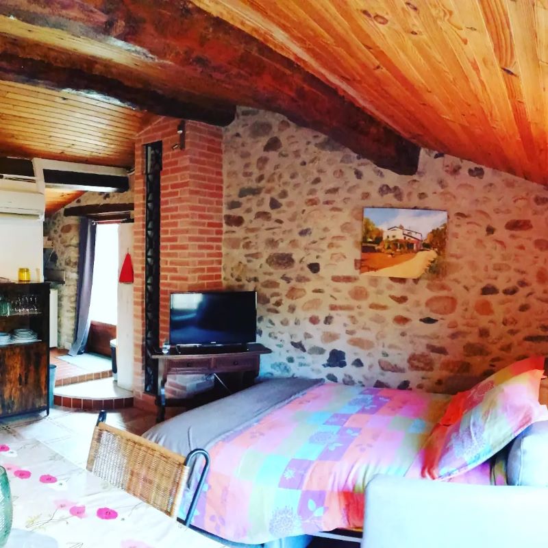 Large stone farmhouse (former mill) comprising two gîtes adjoining the owners’ residence. 1st gîte, 1st floor: living room with kitchenette and extra bed (2 people), 1 bedroom (1 double bed), shower room (wc). Large private terrace. Shared laundry room. Large, wooded, unfenced grounds (private parking in the property). Petanque pitch. Guest room also on site.