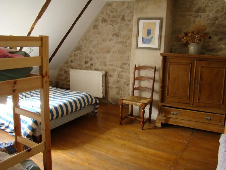 Two level house : Ground floor, living room with kitchen (dishwasher, microwave, freezer). Upstairs, 3 rooms with mansard roof (1 bed 140cm + 2 beds 90 cm superimposed + 1 bed 90cm; 1 bed 140cm + 1 bed 80cm, 1 bed 140cm). 2 shower rooms, toilets, wood burning central heating and an extra electric heating for the mid-season.