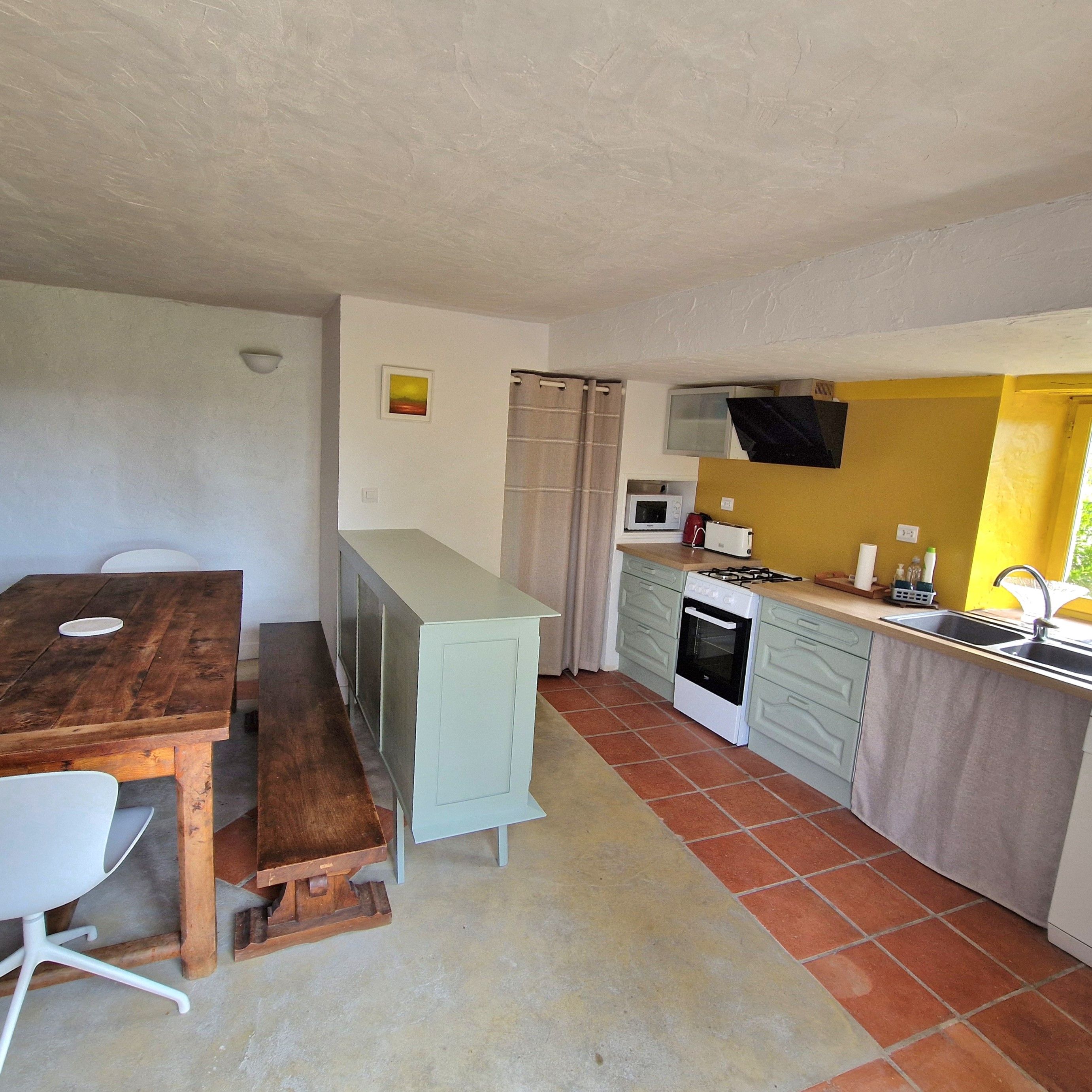1 Communal room with fully-equipped kitchen: double sink, fridge, gas cooker, coffee maker, toaster. Crockery and cooking utensils are provided for a maximum of 12 people.