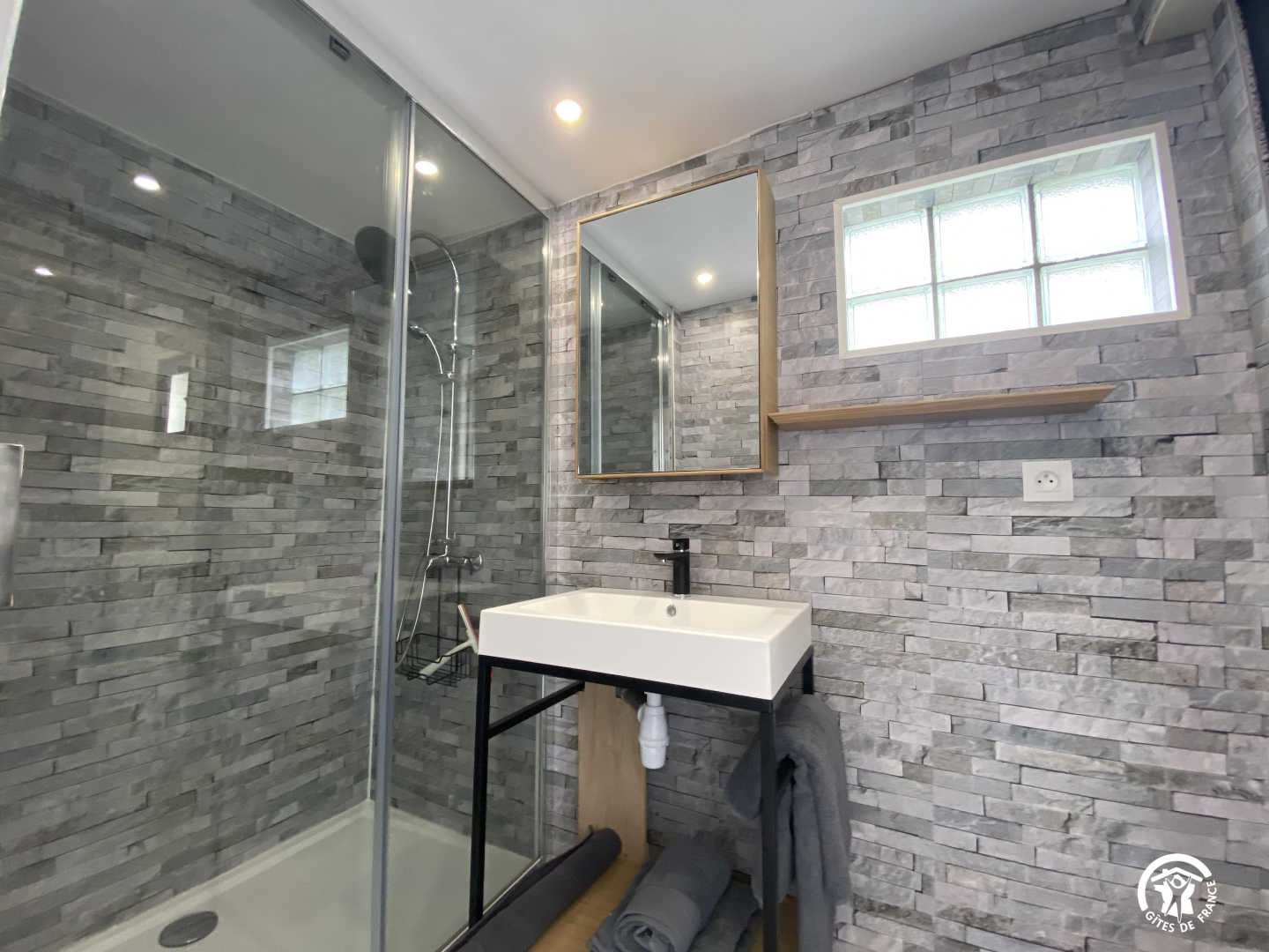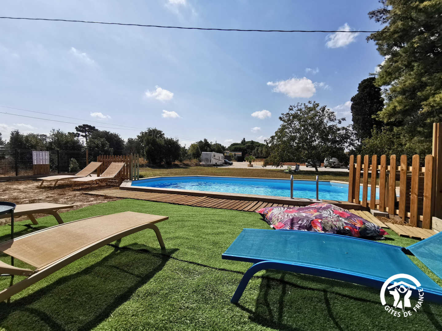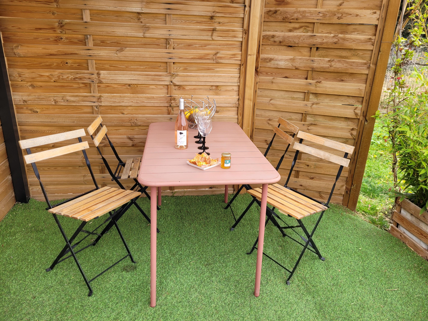 Ground floor: Veranda opening onto a private 8 m² terrace with garden furniture and plancha. Fitted kitchen: freezer, microwave, dishwasher with dining area. Sitting room with a 140 x 190 double sofa bed, leading to a bedroom with a 140 x 190 single bed. Shower room (wc) Mobile air conditioning available. Two shared washing machines in a lean-to outside the property. Secure parking is available, as is a covered shelter for your motorbikes. The property includes the owners’ residence, an unusual boat, 3 gîtes and a guest room. Take advantage of the shared, unheated above-ground swimming pool (8.57 x 4.57 x 1.45), open from mid-May to mid-October, with opening hours from 10am to 8pm. There’s also a large communal garden and a private terrace for unforgettable moments of conviviality.