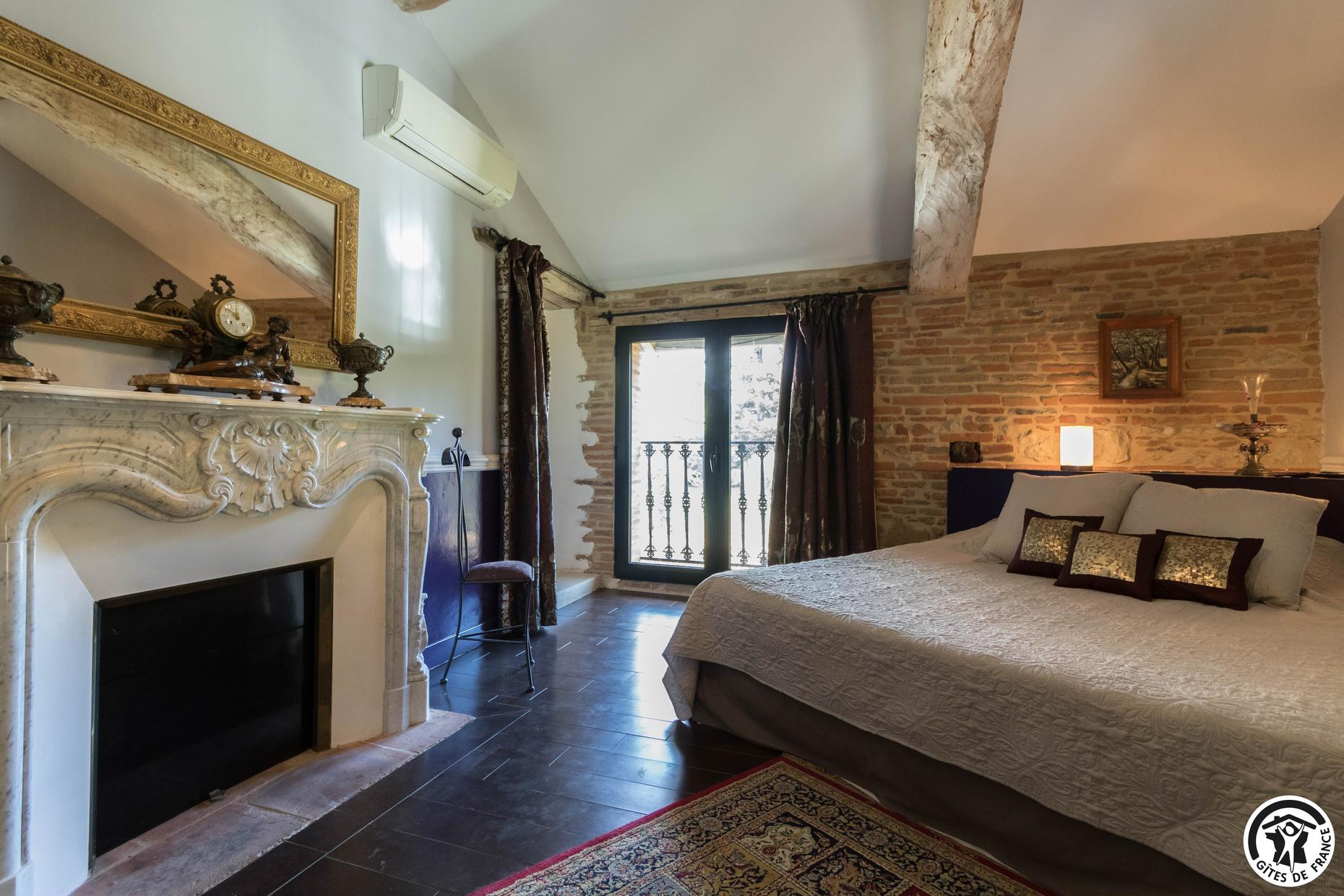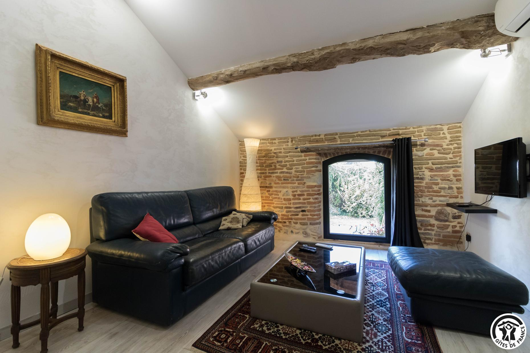 – Ground floor: lounge, large living room opening onto the terrace overlooking the Tarn (pool table). Soleil Levant” bedroom (180*200cm double bed, TV, desk) with large bathroom/WC (corner bath + jet shower) and possibility of extra bed.
