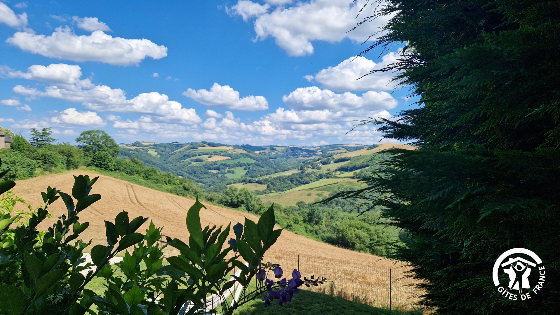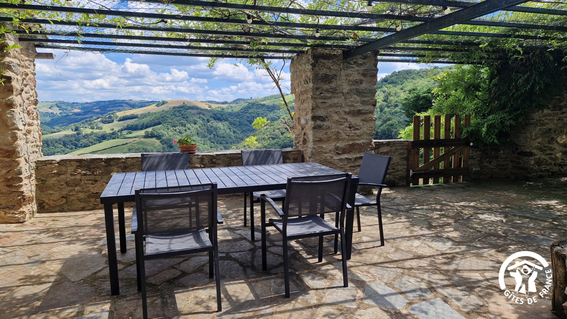 A l’extérieur : en face du gîte, une terrasse ombragée avec table privative à côté des autres tables (pour les autres gîtes), accès au barbecue à bois et le tout avec une vue magnifique sur la vallée !