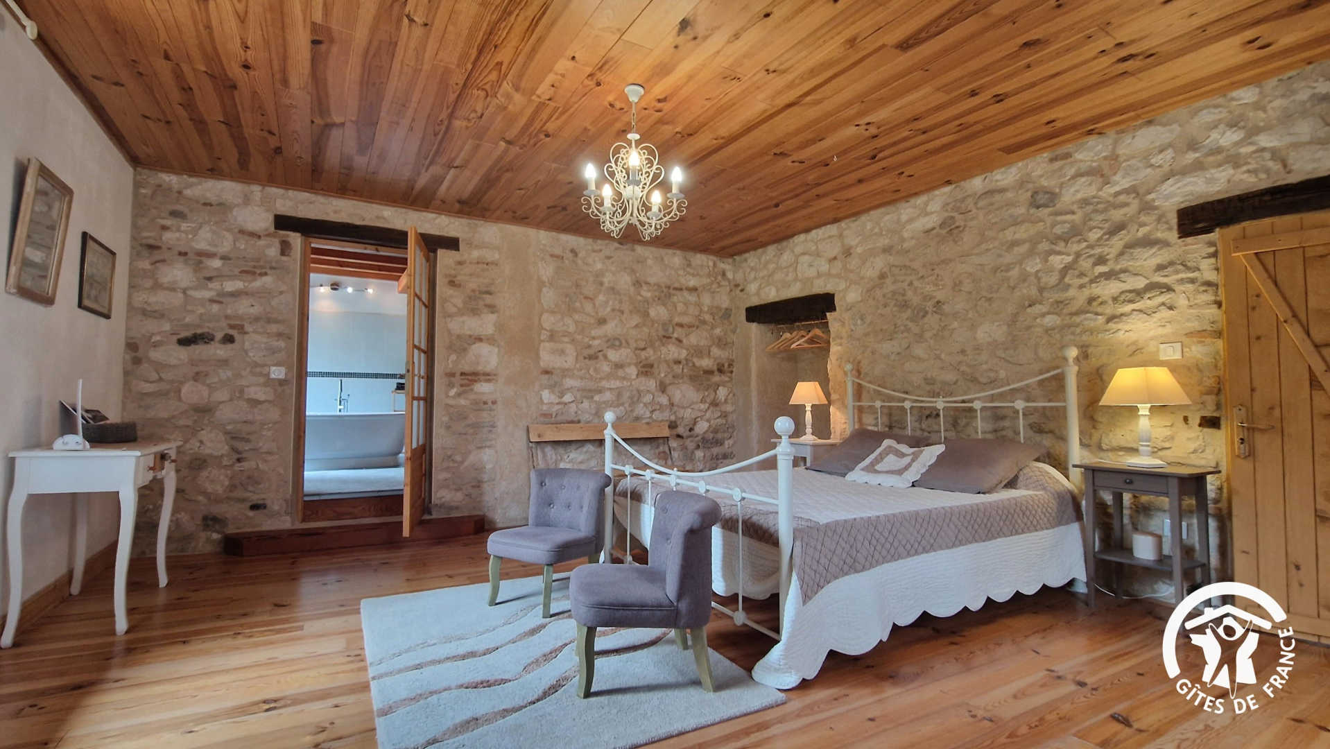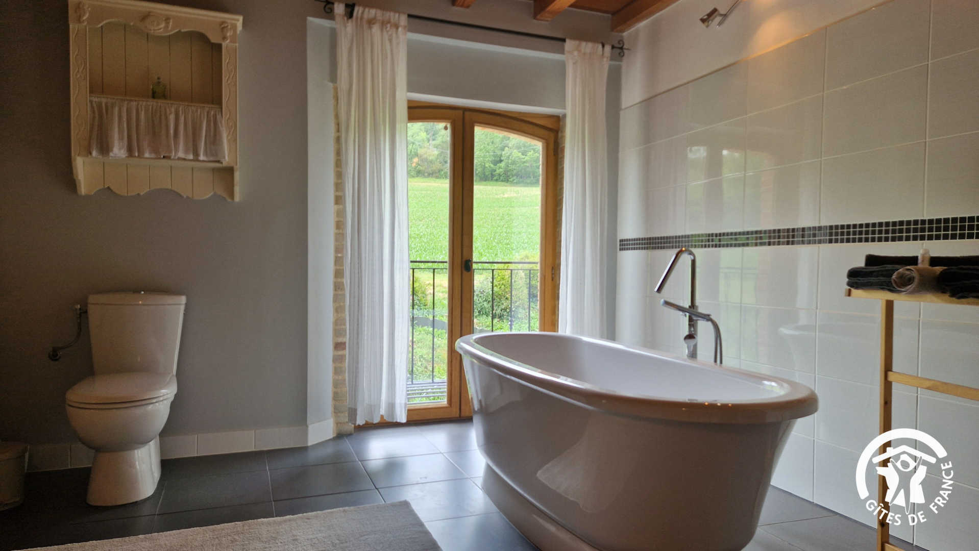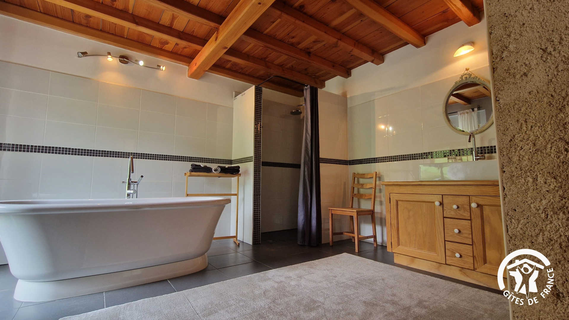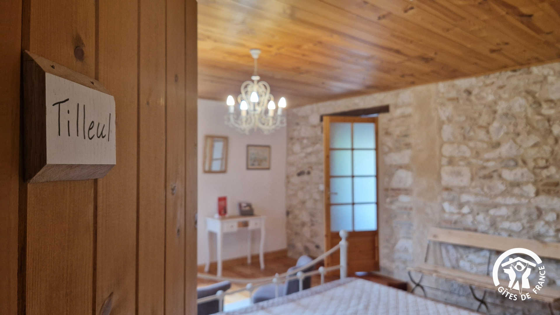 – Tilleul : une grande chambre pour 2 personnes avec lit double en 160cm et grande salle de bain avec baignoire face aux champs, douche, wc et vasque.