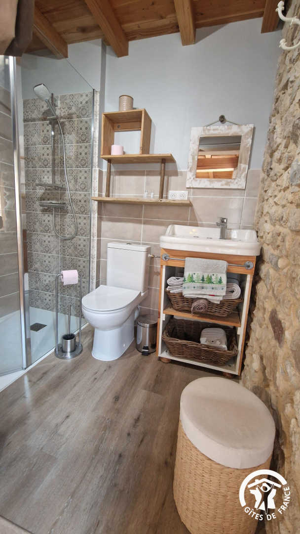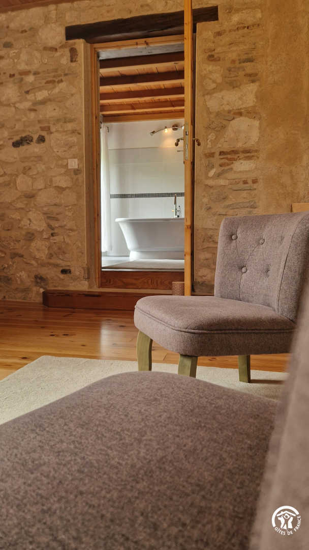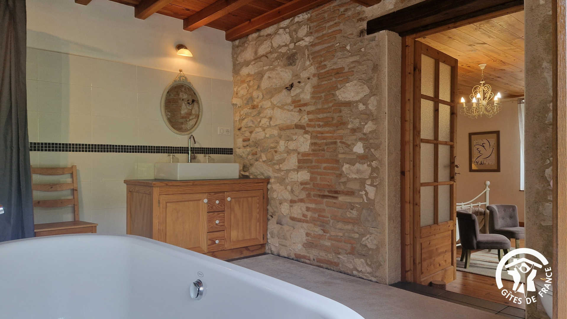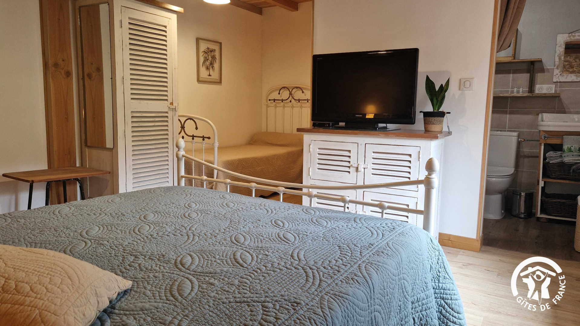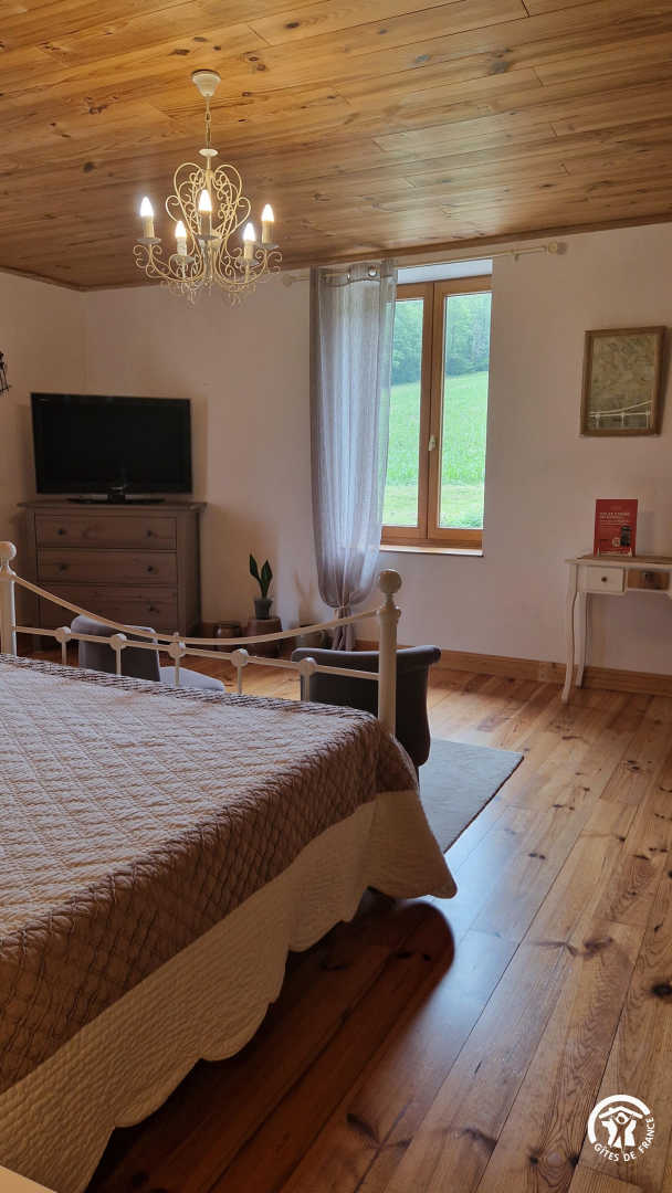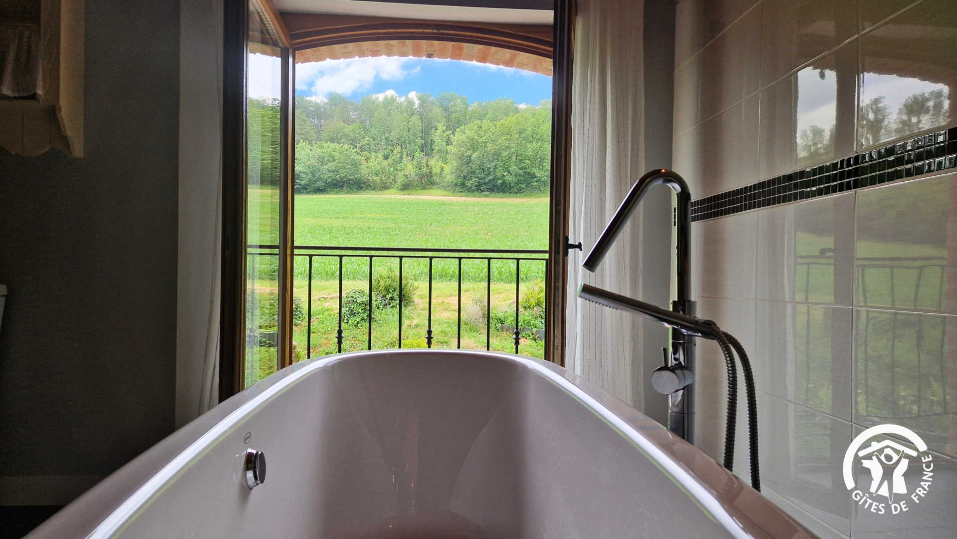 – Tilleul : une grande chambre pour 2 personnes avec lit double en 160cm et grande salle de bain avec baignoire face aux champs, douche, wc et vasque.