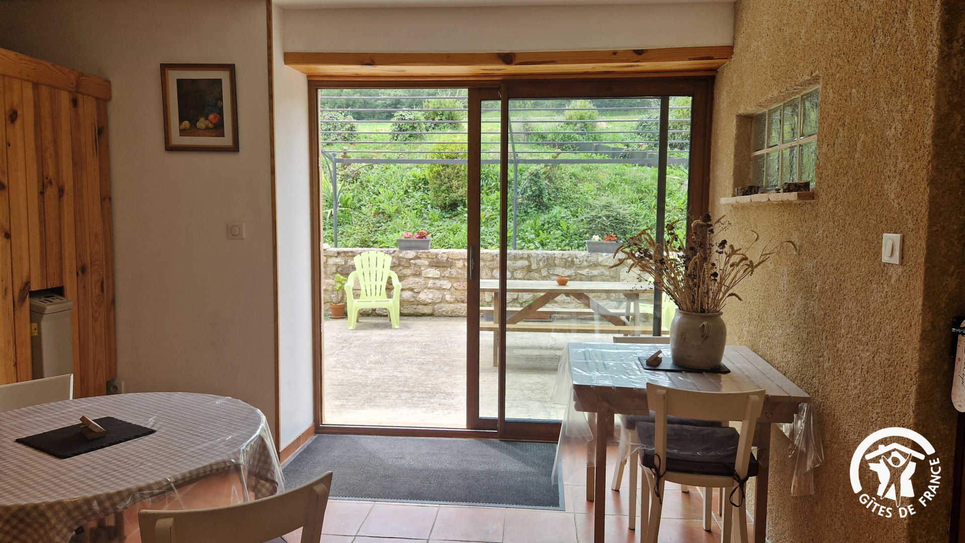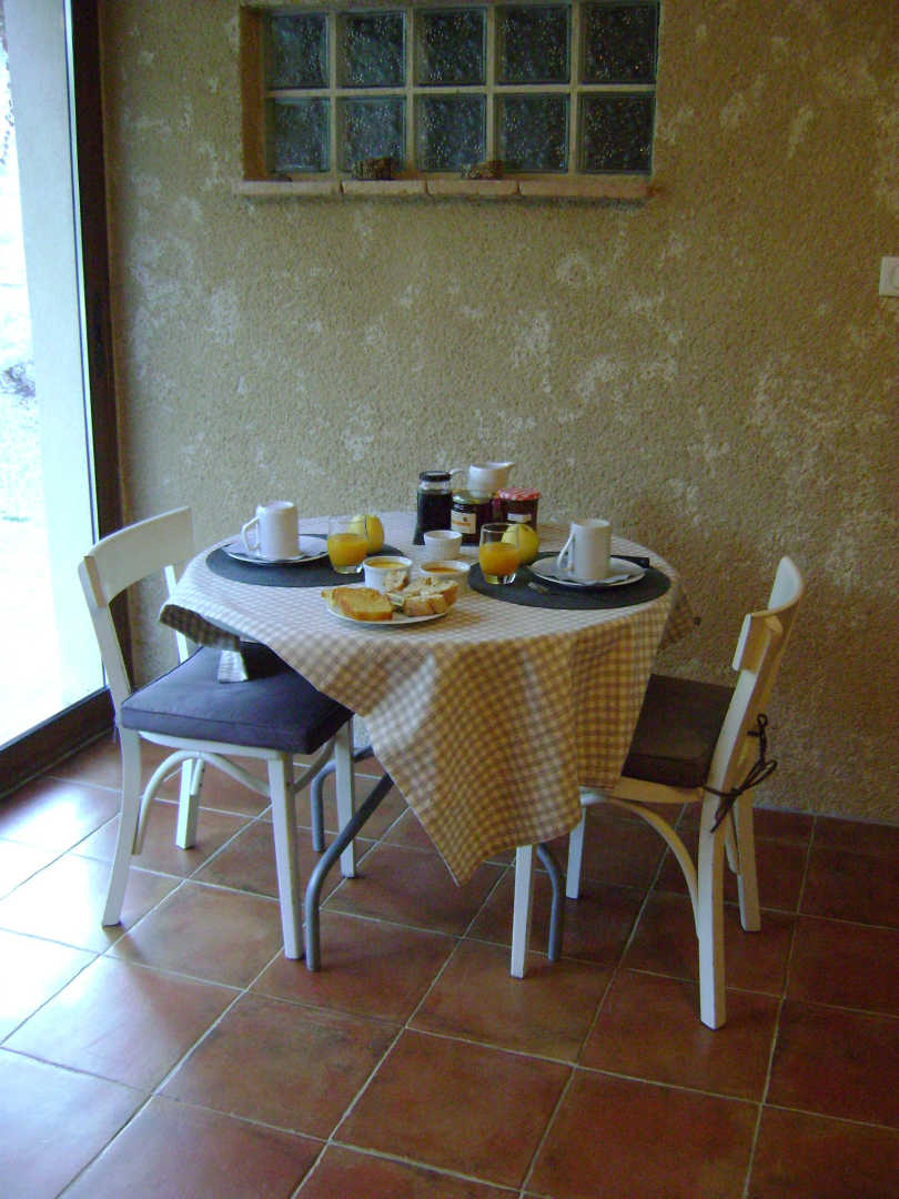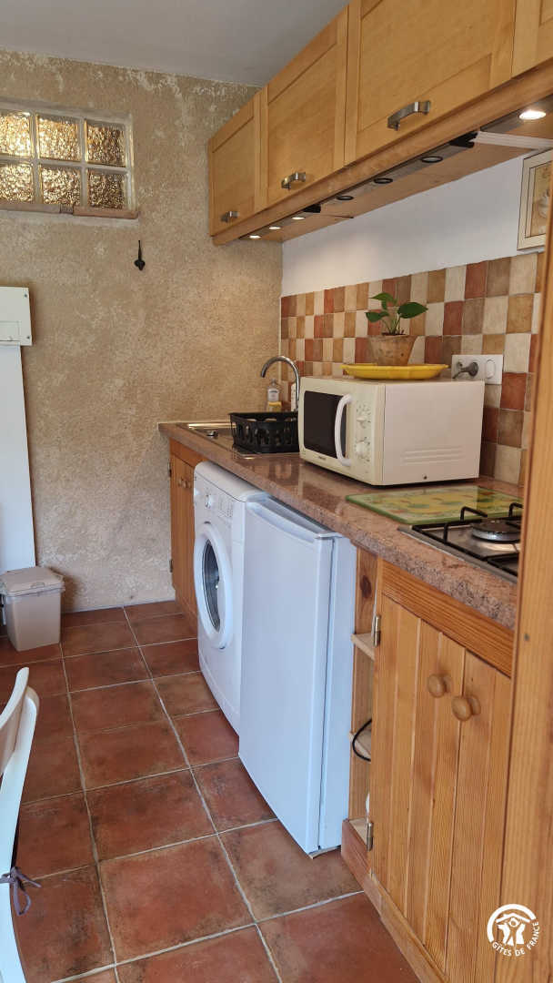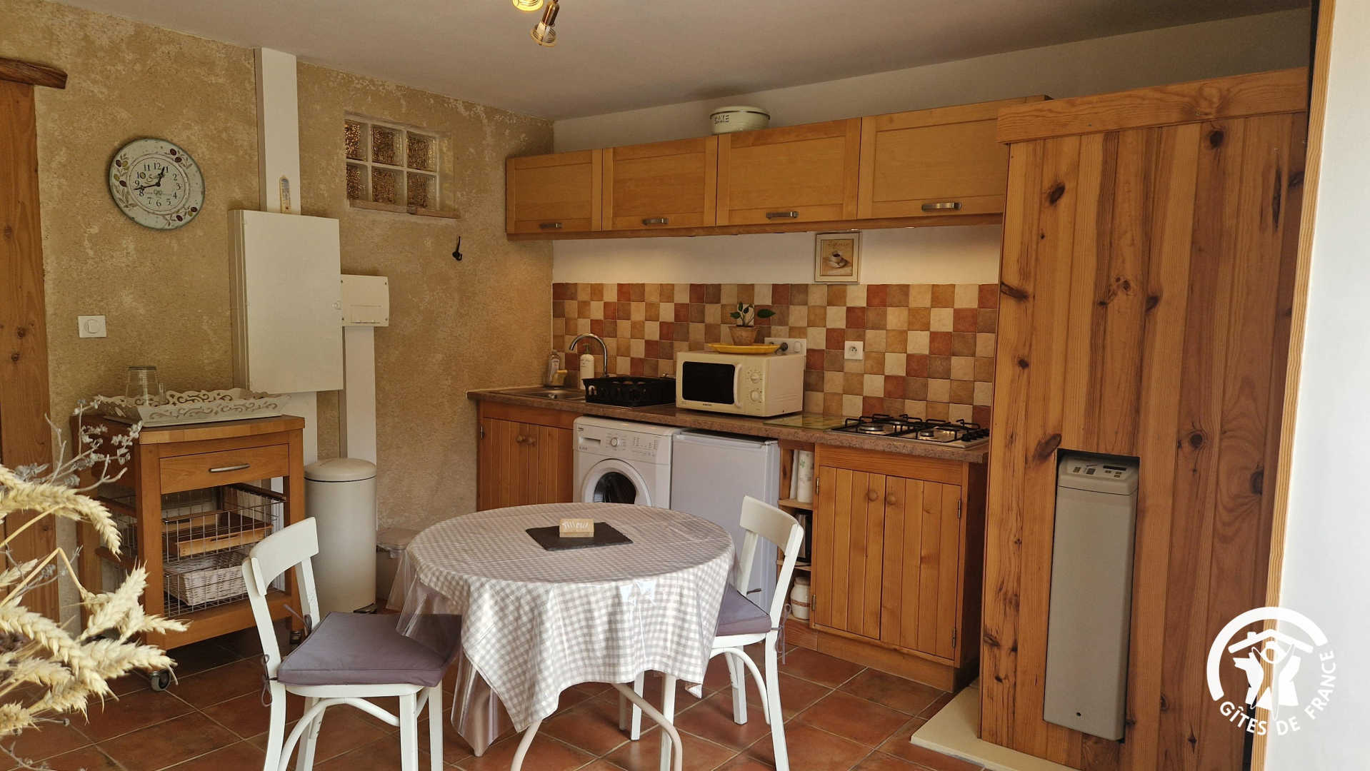 Vous aurez accès à une cuisine entièrement dédiée, pour un repas d’appoint avec plaque de cuisson, petit réfrigérateur, bouilloire, micro-ondes. C’est ici que vous prendrez le petit déjeuner, ou sur la terrasse aux beaux jours, petit déjeuner fait maison, essentiellement composé de produits locaux.