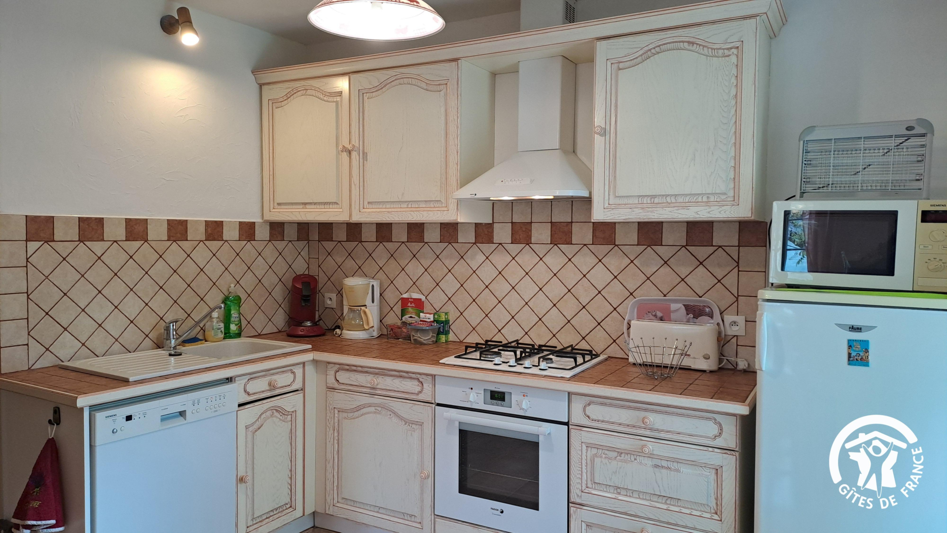 – Séjour : cuisine ouverte avec table à manger, petit espace salon avec canapé convertible, TV et fibre. Cuisine équipée d’un lave-vaisselle, réfrigérateur avec freezer, four, grille-pain, cafetière à filtre et à dosettes Senseo®, micro-ondes et mixeur.