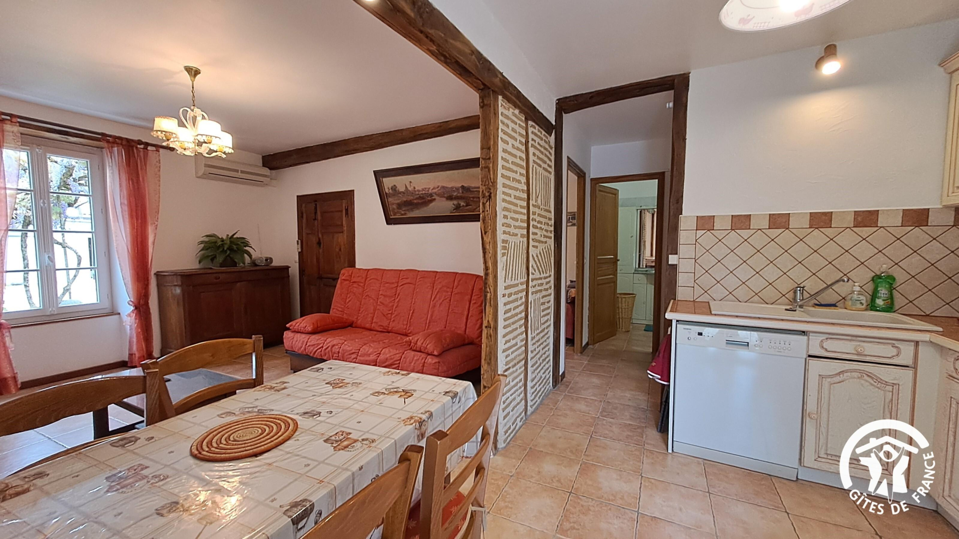 Gîte climatisé et de plain-pied. Possibilité d’accueillir 2 personnes supplémentaires avec le canapé convertible dans le séjour. Un lit d’appoint peut aussi être mis à disposition dans la chambre pour un enfant.