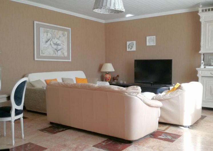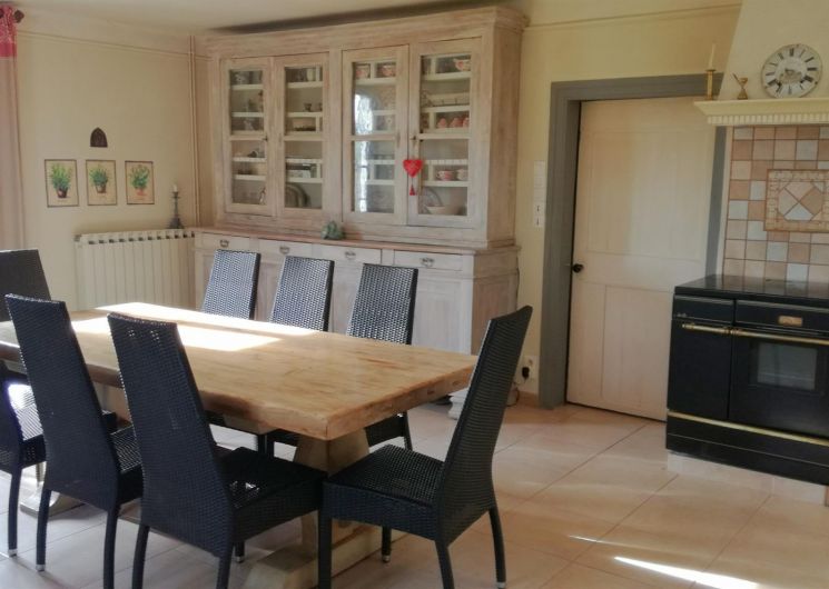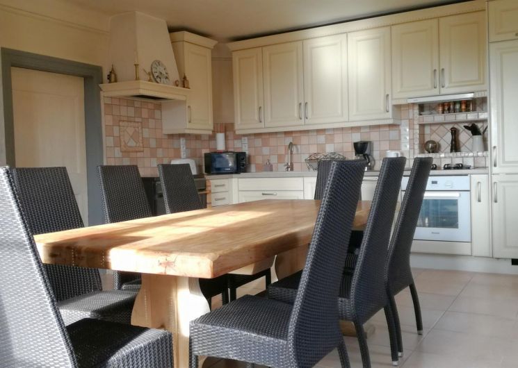 – Au rez-de-chaussée, une grande cuisine de 30m² toute équipée avec grande table et chaises (équipement électroménager complet, avec même un Mr Cuisine), une buanderie, un WC et un grand salon (canapé convertible, TV, jeux de société ).