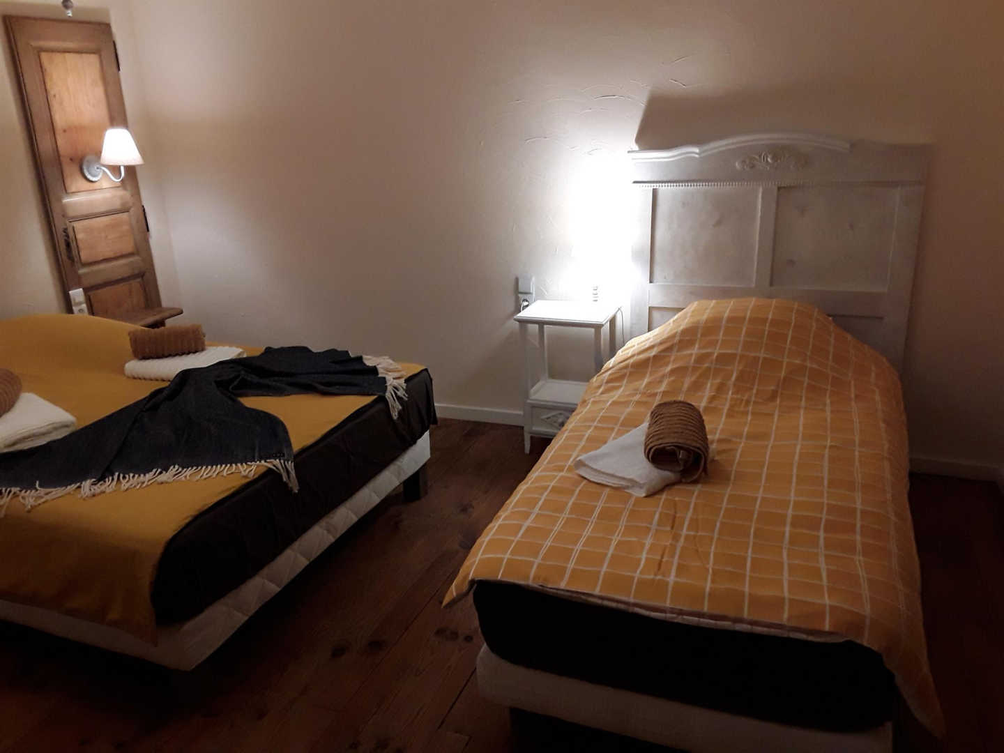 Une chambre avec lit double en 140, la seconde avec lit double et 140 et lit simple en 90. Salle d’eau privative (douche, vasque, …