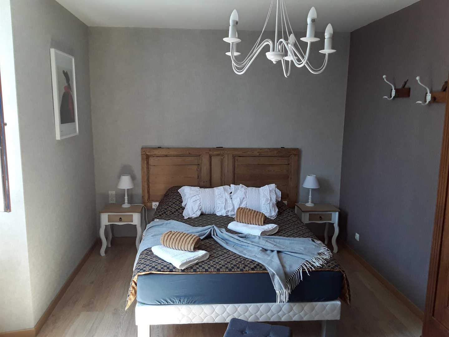 Une chambre avec un lit double en 140, la seconde avec un lit double et 140 et un lit simple en 90. Salle d’eau privative (douche, vasque, wc).