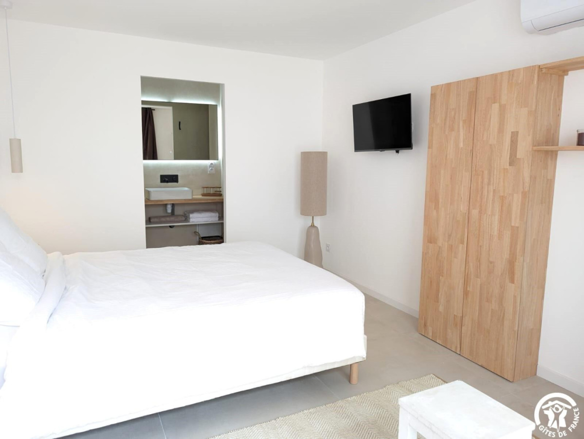 Trois chambres doubles sont à disposition dans une ancienne bâtisse refaite à neuf, avec chacune une terrasse commune surplombant la cuisine vous permettra de déguster un petit déjeuner local et fait maison. Vous pourrez également profiter d’une belle pièce de vie commune avec canapés et télévision, d’une salle commune pour prendre vos petits-déjeuners continentaux (viennoiseries, pain perdu maison, thé, café, fruits…) avec un coin cuisine avec micro-ondes et réfrigérateur/congélateur, ainsi qu’un WC. Une belle piscine chauffée à 24° vous attend, ainsi que des transats tout autour et un petit salon extérieur façon Riad. Des vélos sont disponibles à la location avec supplément sur place. 2 places de parking sont à disposition sur demande et avec supplément (10€/jour). Un spa et un sauna sont également disponibles sur demande pour des séances d’une heure, à voir avec les propriétaires. Chaque chambre dispose d’un lit double 160*200, d’une salle de douche/wc, de la climatisation, d’une télévision, du nécessaire de toilette, d’un service thé/café et d’une terrasse privative donnant sur la piscine. La position du gîte vous permettra de profiter des atouts de la ville de Sète à pied. Faites une balade sur le Mont Saint Clair et admirer la vue imprenable sur Sète, l’étang de Thau, la mer et les environs. Entre Méditerranée et Etang de Thau vous aurez un vaste choix de baignades, activités nautiques, sorties en bateau… Pour des soirées concerts, renseignez-vous sur la programmation du Théâtre de la Mer, théâtre à ciel ouvert avec une vue magique sur la mer. Vous pourrez également rejoindre les plages et animations des stations balnéaires alentours comme Balaruc, , Marseillan, ou encore Agde. A quelques minutes, vous pourrez rejoindre Pézenas, vous balader dans ses ruelles médiévales ses boutiques d’artisanat. Pour des balades à pied ou à vélo, vous pourrez emprunter la piste cyclable de Sète qui rejoint Marseillan, Agde et Béziers en bordant le Canal du Midi. – Lumineuse chambre double avec salle de bain (douche italienne et toilette). Vous disposez également d’une petite table basse et fauteuils pour prendre un petit-déjeuner en toute intimité si vous le souhaitez ou alors sur votre terrasse privative. La chambre dispose d’une télévision et de la climatisation. Une cafetière Nespresso et une bouilloire sont à disposition. Linge de toilette (serviette de bain et de piscine) est fourni ainsi que le nécessaire de toilette.