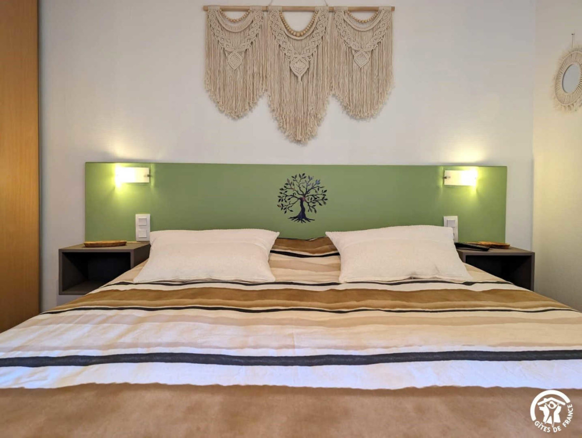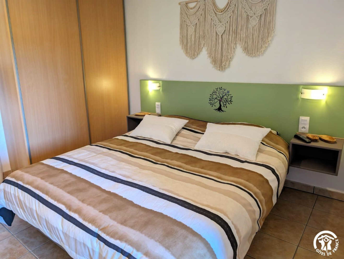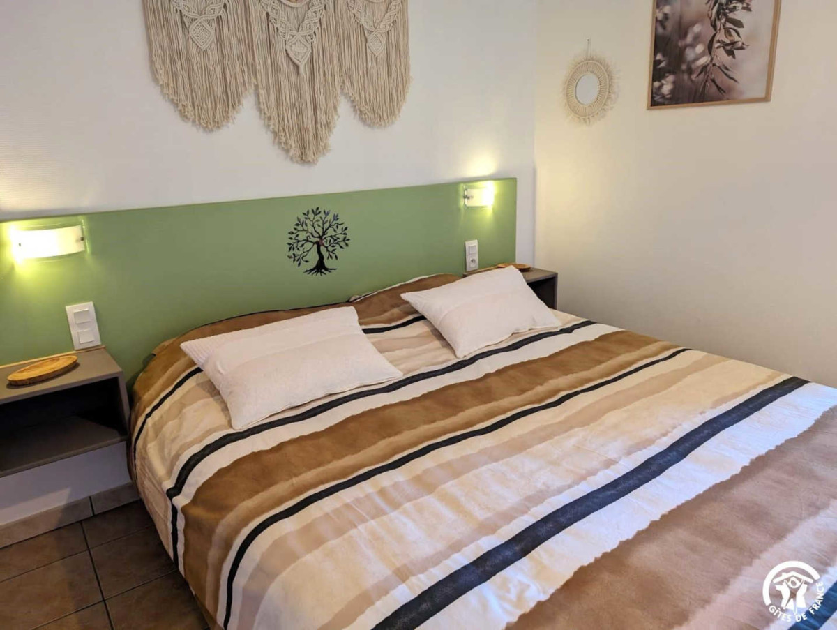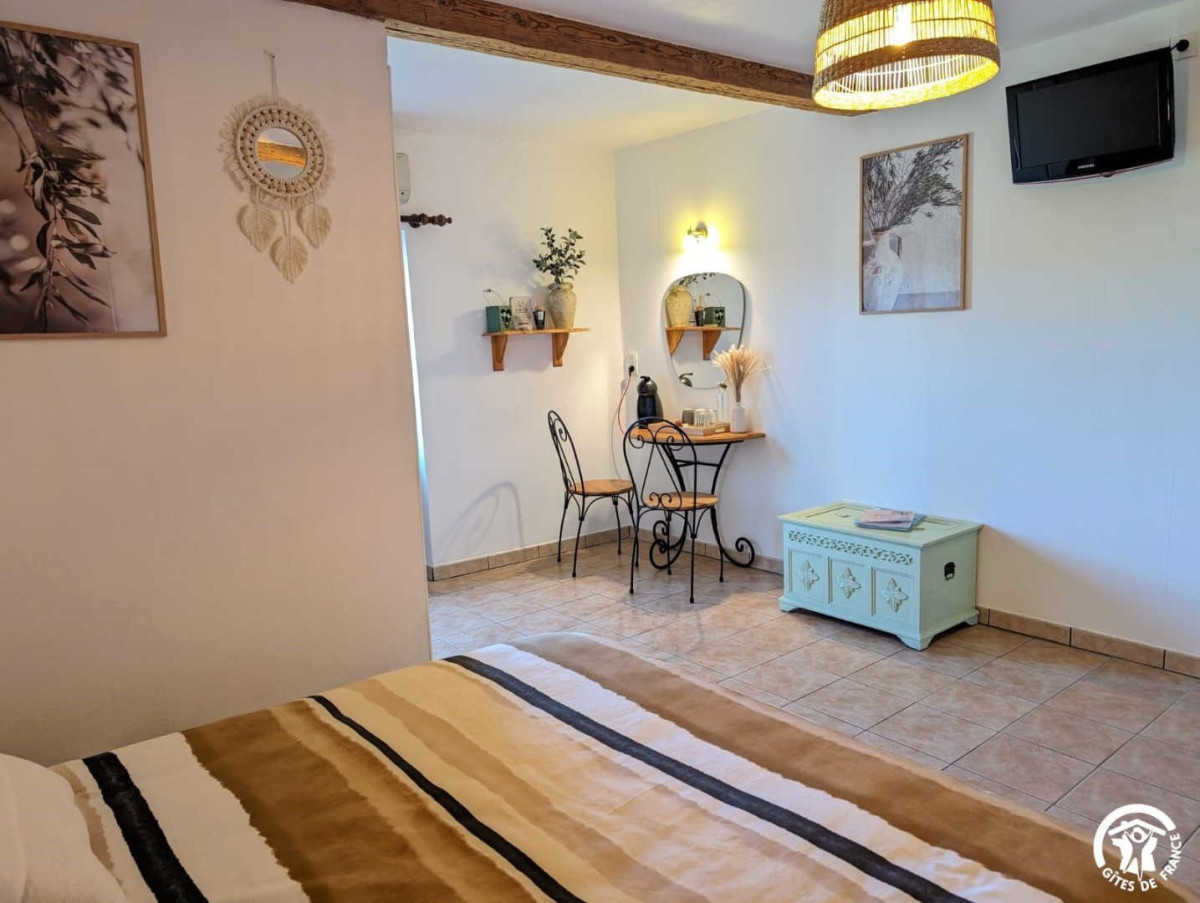 5 chambres, avec différentes thématiques, sont dédiées à l’accueil des visiteurs. Chacune bénéficie de la climatisation et est équipée d’une table avec des fauteuils, d’une télévision ainsi que d’un sèche-cheveux. De plus, elles disposent toutes d’une salle de douche et de toilettes privatives pour votre confort. Vous pourrez prendre vos petits-déjeuners dans une grande salle de caractère, servis de 8h00 à 10h30 selon vos souhaits. Celle-ci comporte également un petit coin télévision, avec aussi des jeux de société pour petits et grands à disposition. Sophie et Stéphane proposent aussi la table d’hôtes sur demande. Un menu à 23 euros, entrée, plat et dessert est proposé. C’est une cuisine familiale composée de produits frais, régionaux, le tout maison. Le 1er verre de vin avec le repas est offert. Sur la terrasse commune, vous pourrez profiter d’une piscine chauffée (grâce à des panneaux solaires) ouverte de mai à octobre de 9h00 à 21h00 et vous détendre sur les transats. Un espace restauration avec sa cuisine d’été surplombe la piscine et vous accueillera chaleureusement à tout moment de la journée, pour vos petits déjeuners, vos repas du soir ou encore un verre en terrasse. Jaccuzi disponible en haute saison / hors saison sur demande avec un supplément de 10 euros par jour *horaire: 17h-22h Caution animaux à 50€. ATTRAITS TOURISTIQUES : La ville médiévale de Minerve, située à seulement quelques kilomètres, offre un paysage pittoresque avec ses ruelles pavées et ses vestiges historiques. Les amateurs de vin seront ravis de visiter les domaines viticoles de la région, tels que le Château de Siran. Vous pourrez explorer les ruines romaines de l’Oppidum d’Ensérune. Les gorges du Brian et le lac de Jouarres offrent des possibilités de randonnée, de kayak et de baignade dans un cadre naturel préservé. Enfin, ne manquez pas de visiter le village de Bize-Minervois, réputé pour ses charmantes ruelles bordées de maisons en pierre. – Chambre à deux lits, douche ou baignoire, WC, 1 chambre