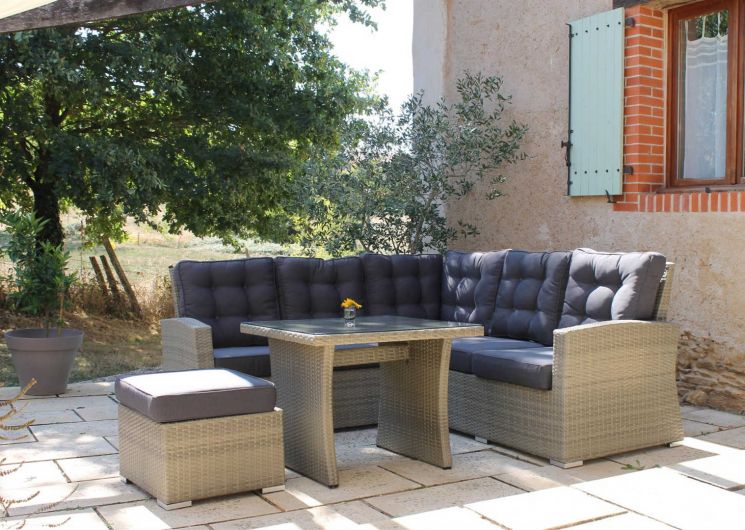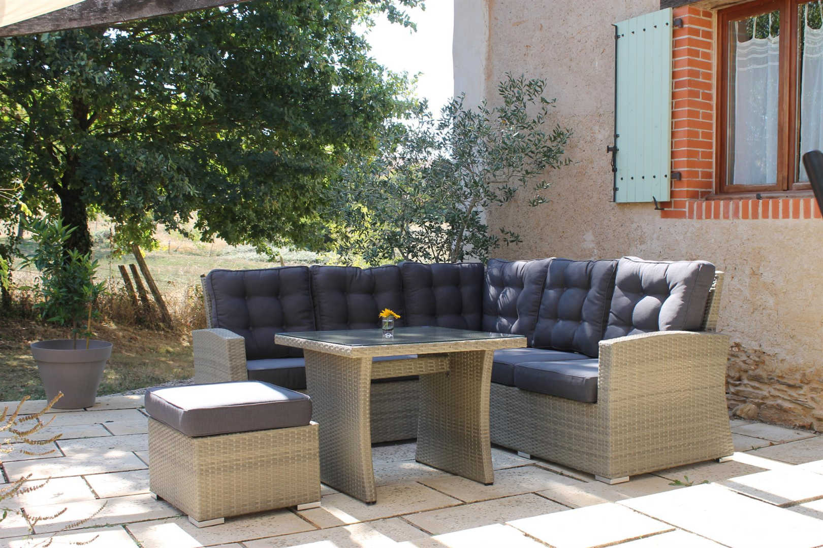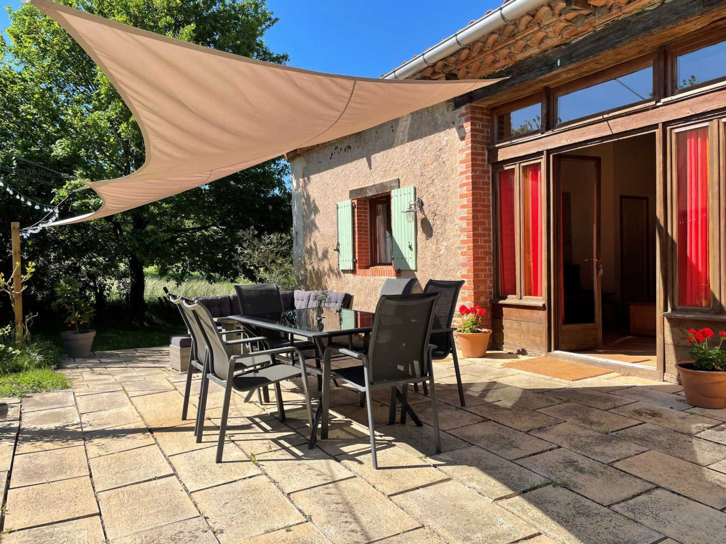 Devant la pièce de vie, la terrasse et voile d’ombrage aux beaux jours. Salon de jardin et barbecue.