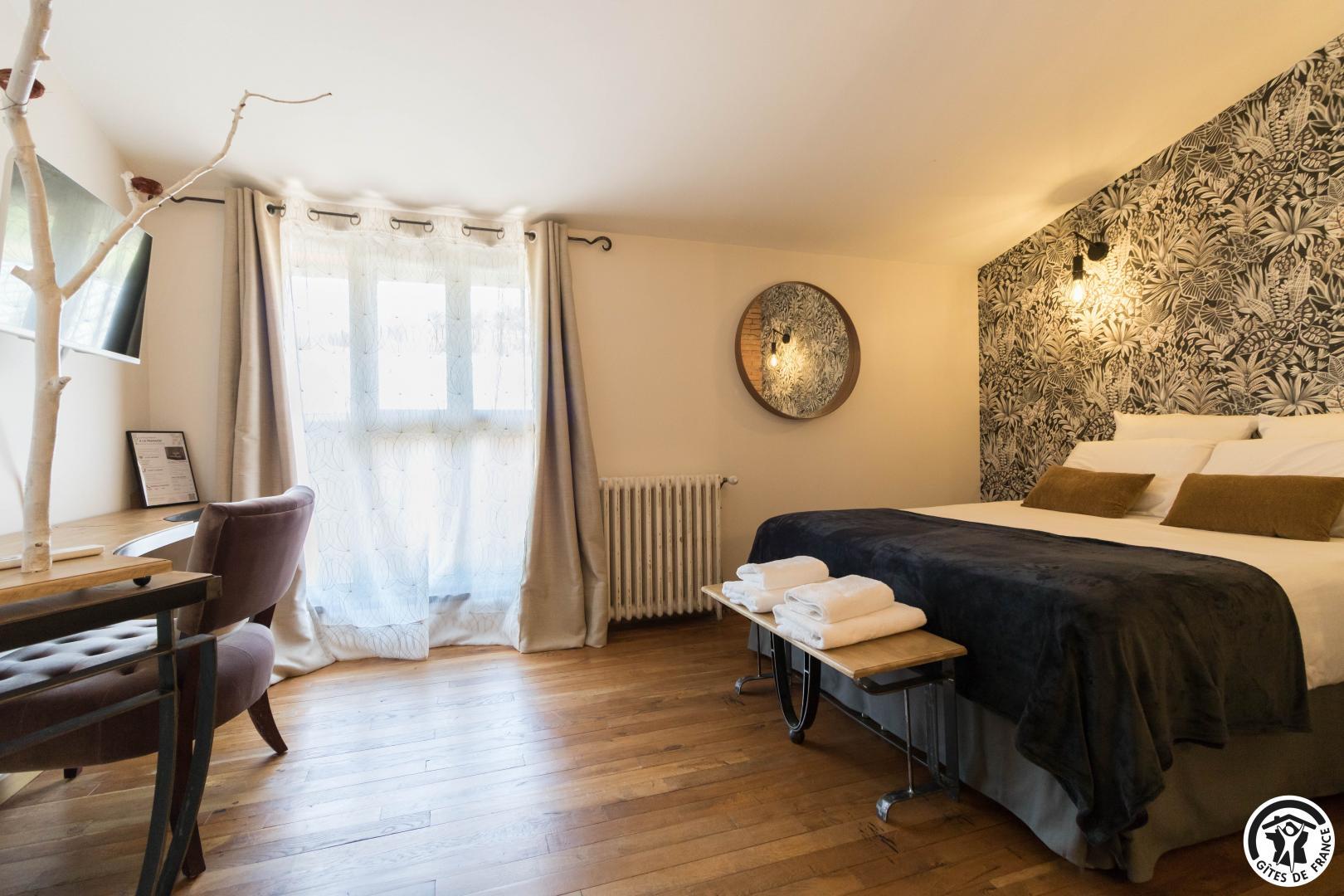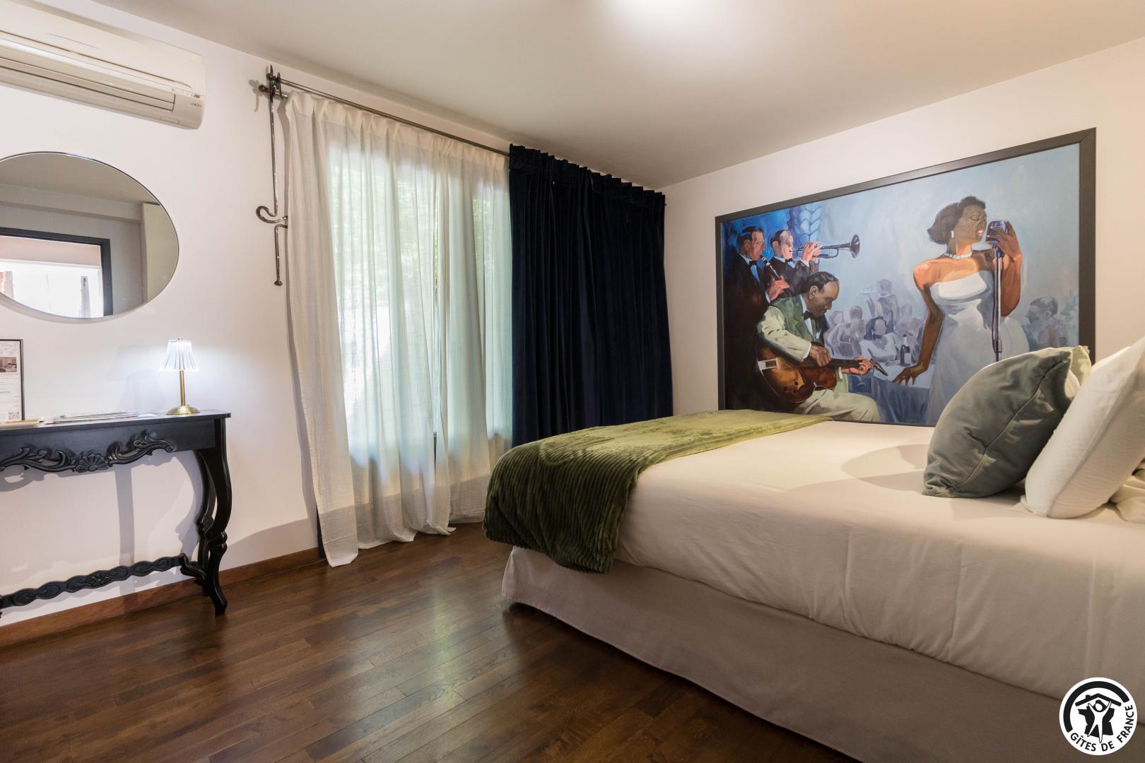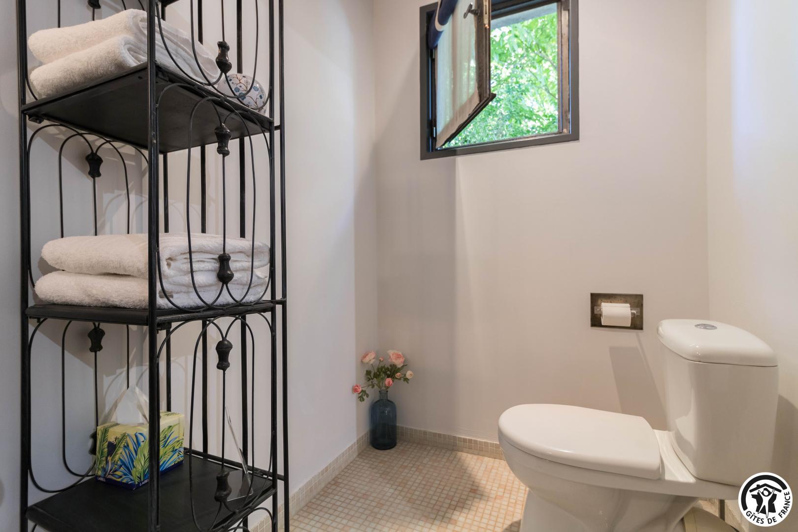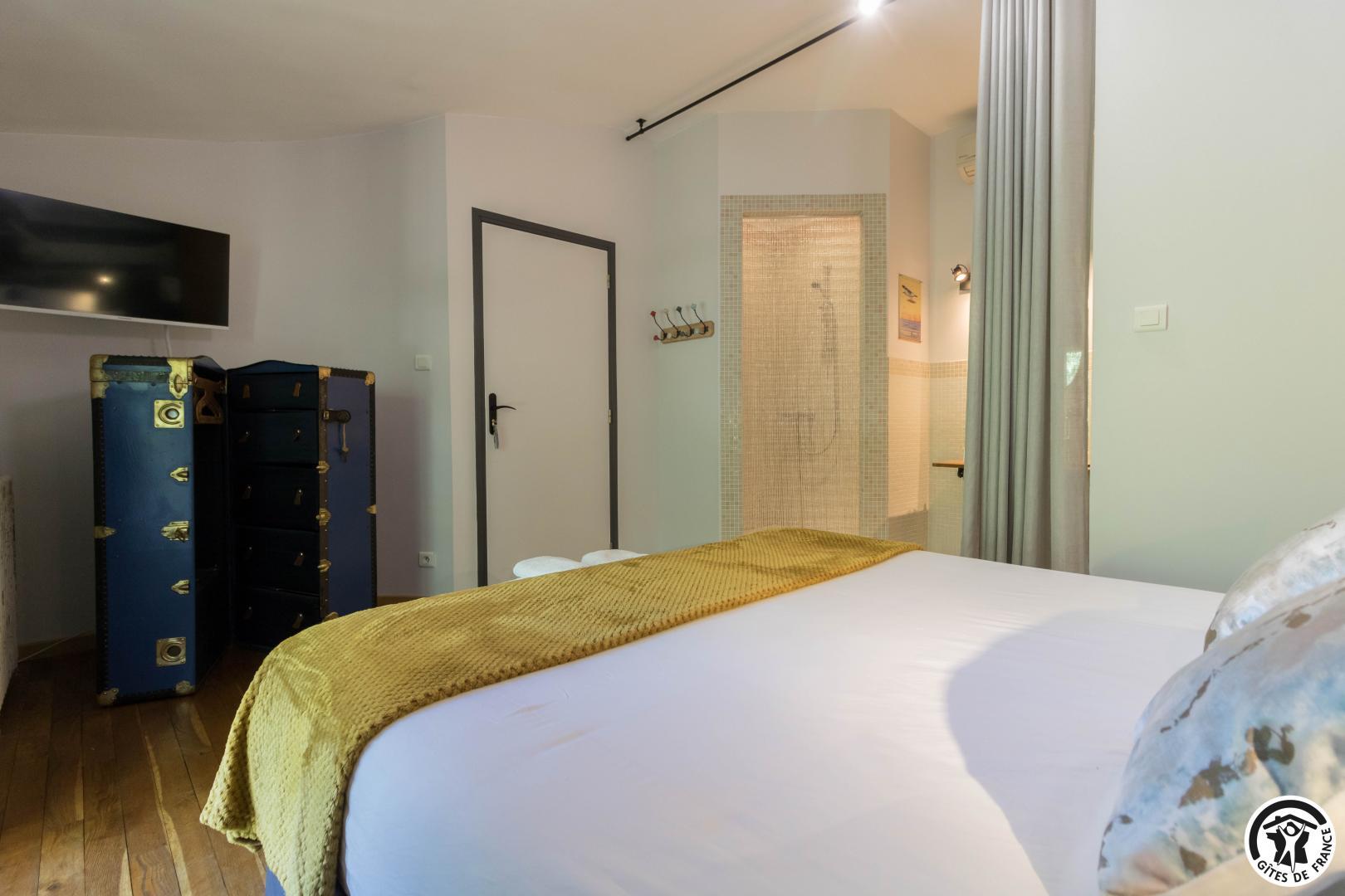 Each room has a large 160*200cm double bed (2*90cm twin Nougaro beds), reversible air conditioning, a TV and a bathroom with separate WC.