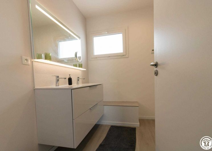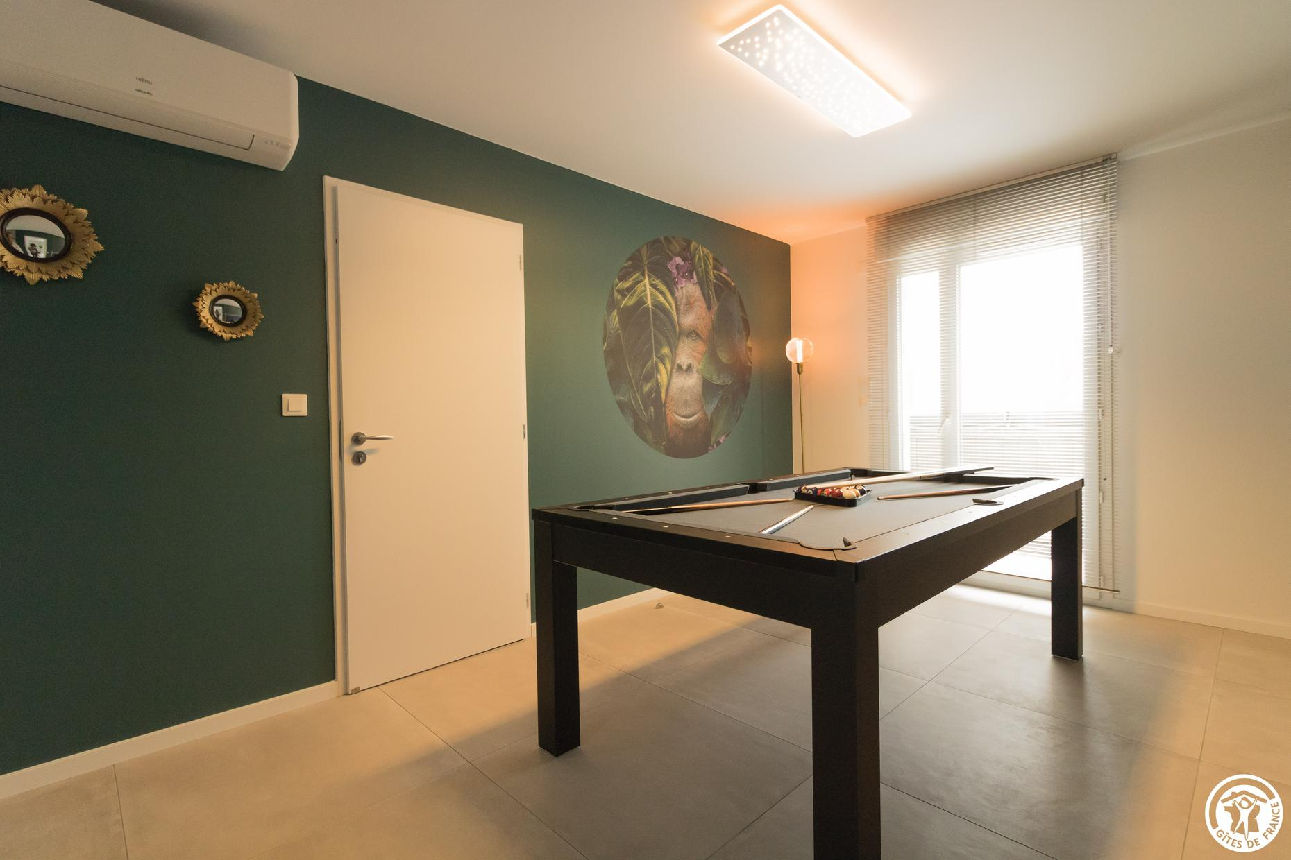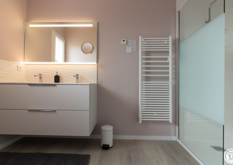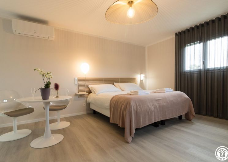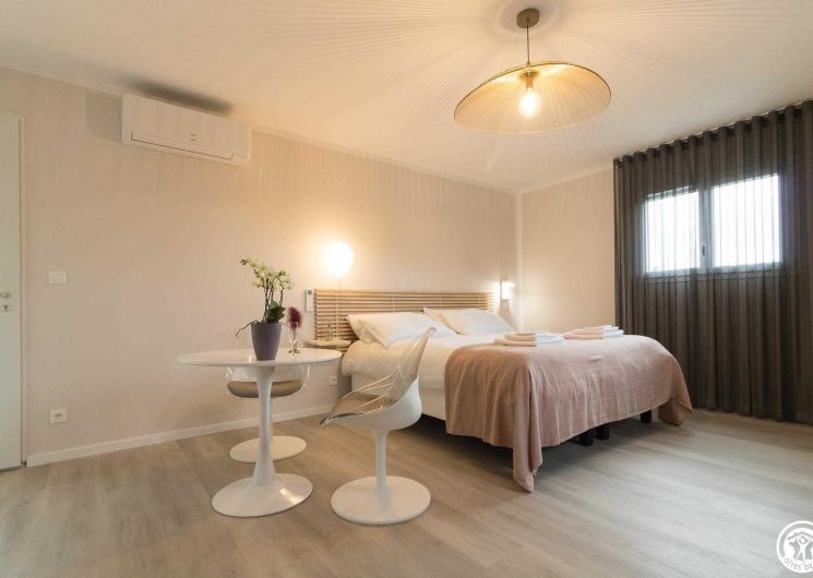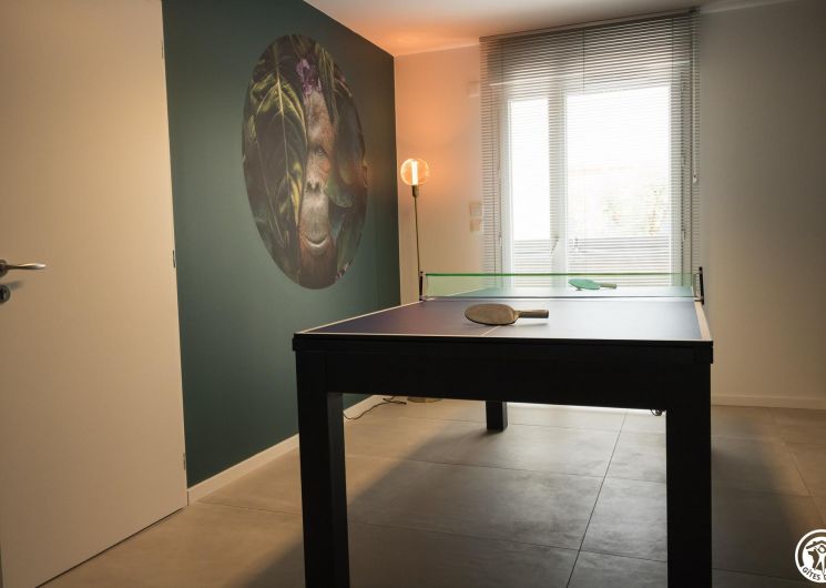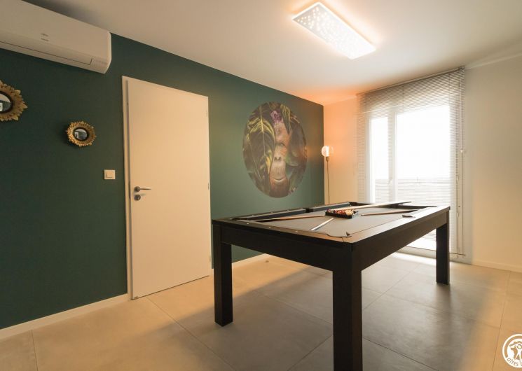 The entrance hall opens onto the games or seminar room (pool table that can be converted into a ping-pong table or seminar table), WC with washbasin, very large living room with integrated kitchen, dining area and lounge area with wood-burning stove, this living room opens onto the large terrace where you can enjoy either the Spa, the relaxing lounge or the garden furniture to enjoy your meals outside (plancha and pizza oven). Two duplex bedrooms, each with a sofa bed for 2 people and a desk on the ground floor, and a bedroom (1 x 160cm bed for 2 people), separate toilet and shower room on the first floor. A large bedroom accessible via the ground floor of a duplex, with separate toilet and shower room. The 25m² bedroom has a 180cm double bed and a sitting area. Accessible from the outside, the 4th bedroom (35m²) has a sitting area, 1 x 180cm double bed, a desk, a shower room and a separate toilet.