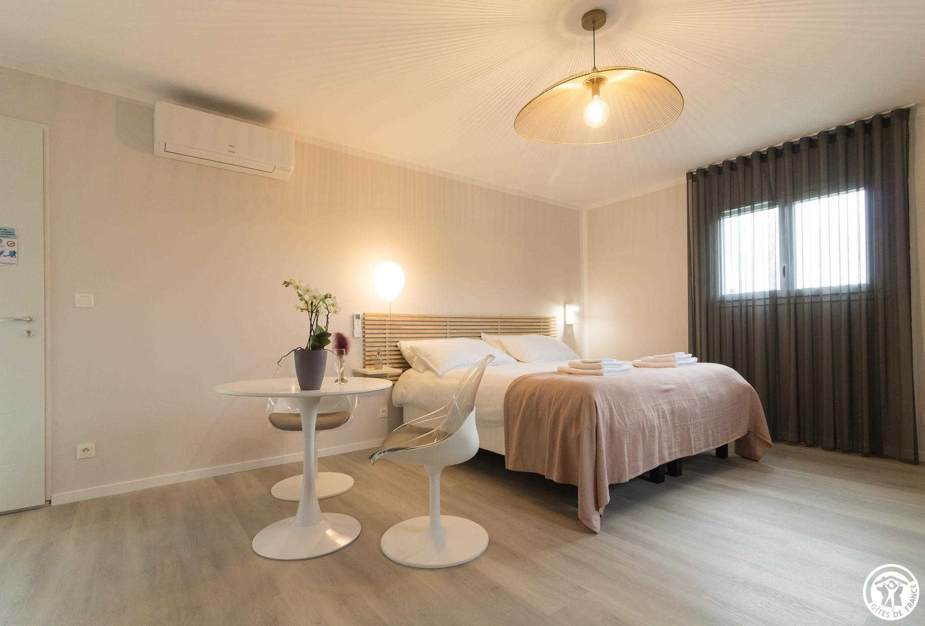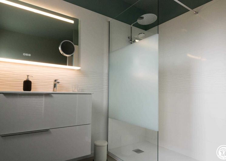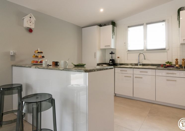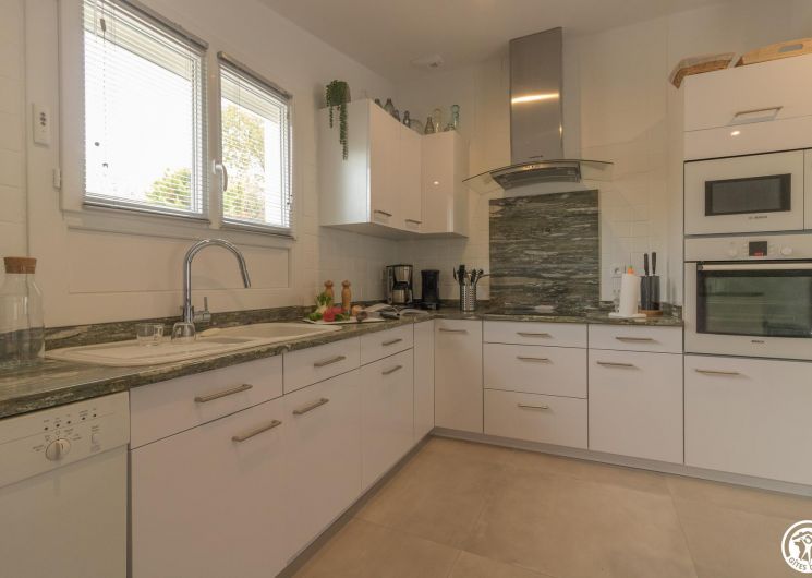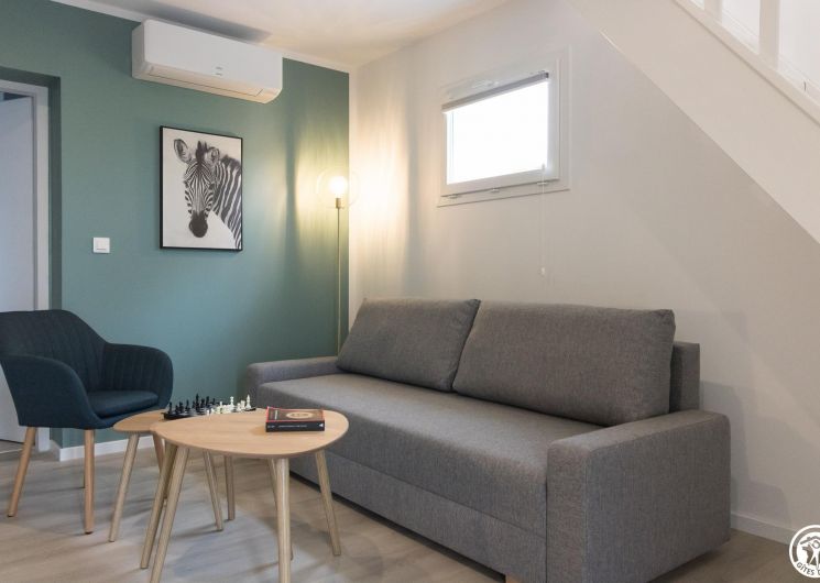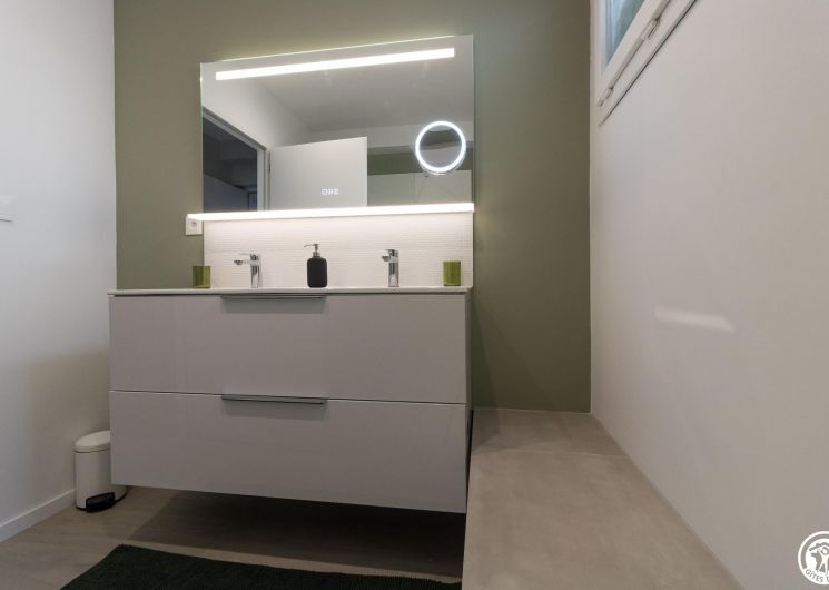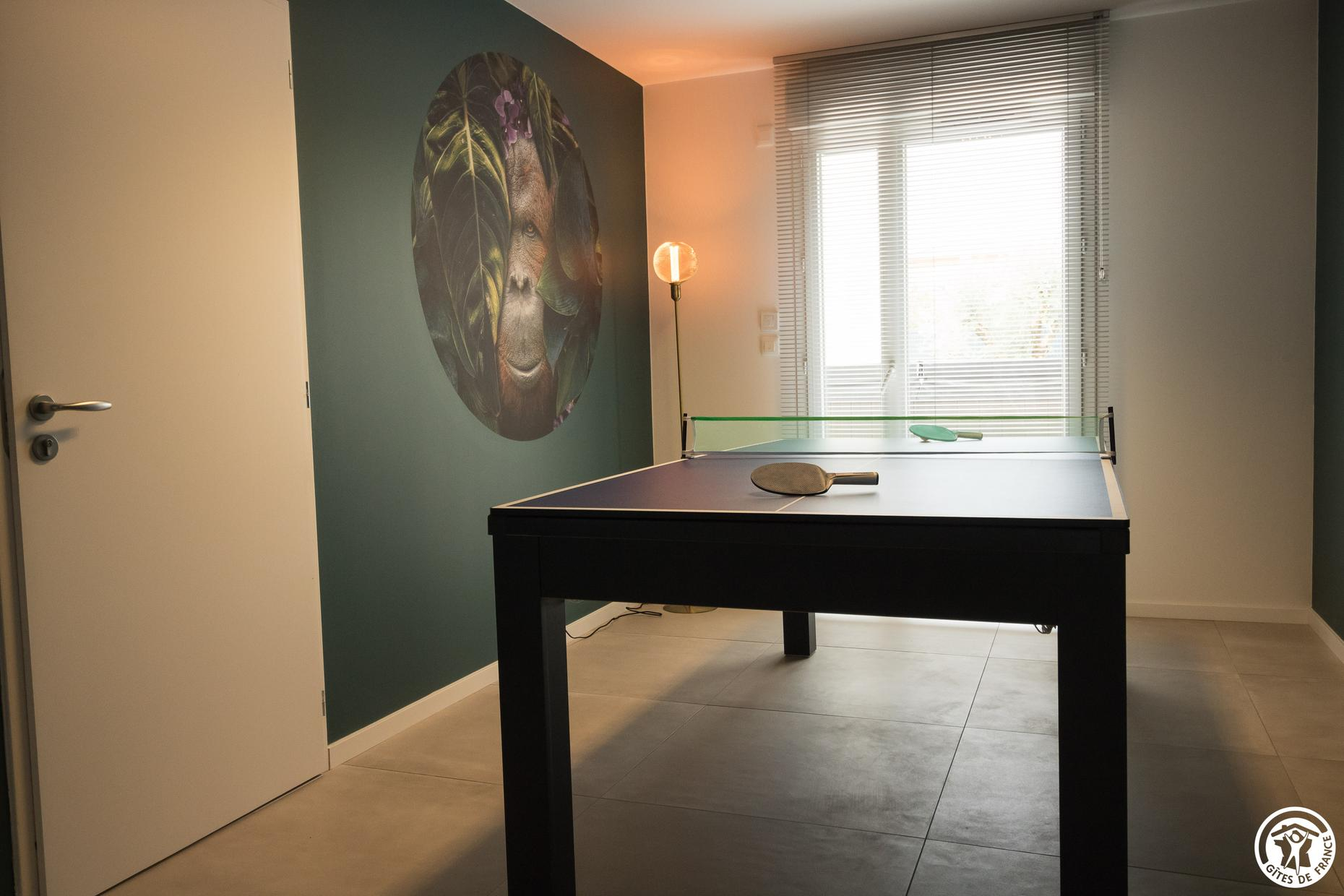 The entrance hall opens onto the games or seminar room (pool table that can be converted into a ping-pong table or seminar table), WC with washbasin, very large living room with integrated kitchen, dining area and lounge area with wood-burning stove, this living room opens onto the large terrace where you can enjoy either the Spa, the relaxing lounge or the garden furniture to enjoy your meals outside (plancha and pizza oven). Two duplex bedrooms, each with a sofa bed for 2 people and a desk on the ground floor, and a bedroom (1 x 160cm bed for 2 people), separate toilet and shower room on the first floor. A large bedroom accessible via the ground floor of a duplex, with separate toilet and shower room. The 25m² bedroom has a 180cm double bed and a sitting area. Accessible from the outside, the 4th bedroom (35m²) has a sitting area, 1 x 180cm double bed, a desk, a shower room and a separate toilet.