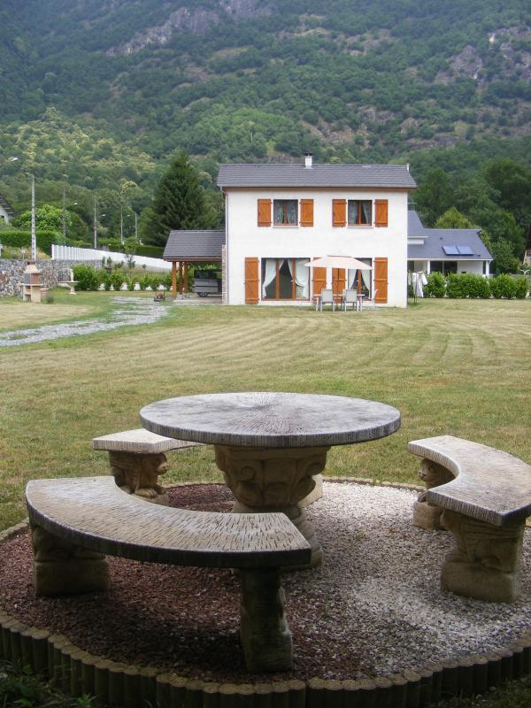 La résidence Loreleï, récente et indépendante, vous accueille au pied de la montagne, à proximité de la station de Luchon. Vous apprécierez son jardin clos de 2500m², sa cheminée à insert idéale en hiver, et sa cabine à hydro-massage et hammam ! Aire de stationnement dans le parc (dont 1 place couverte). RDC : WC/lave-mains, cellier, séjour, cuisine ouverte. 1er étage : 2 chambres (1 lit 2 pers. en 140) (1 lit 2 pers. en 140 en mezzanine et 2 lits 1 pers. en 90) avec TV écran plat, salle d’eau (cabine hydro-massage/hammam) et WC. Chauffage électrique. Réfrigérateur américain, sèche-linge, TV écran plat 127cm, portable à carte sur demande, Wifi en supplément. Draps et linge de toilette inclus.