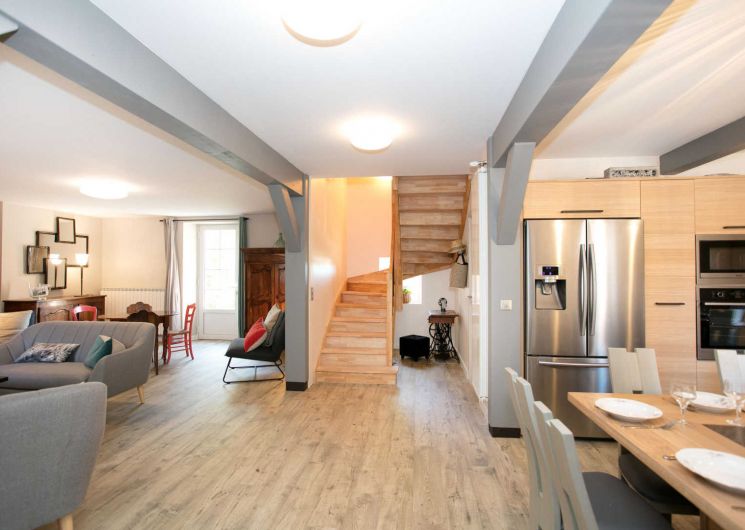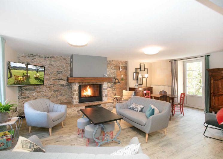 – Séjour avec cuisine ouverte sur table à manger et espace salon avec cheminée et TV connectée