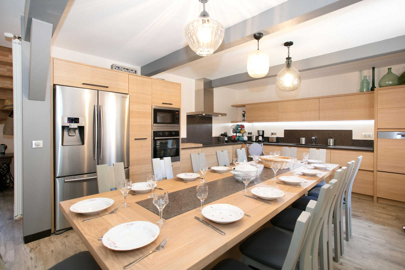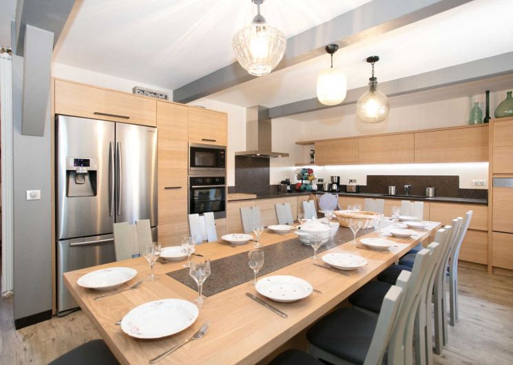 * Cuisine toute équipée : grand frigo américain, micro-ondes, four, bouilloire, grille-pain, cafetière Senseo® et Nespresso®, lave-vaisselle, 2 appareils à fondue, 2 appareils à raclette, hachoir, batteur électrique…