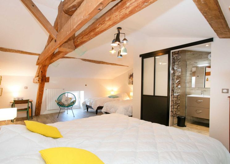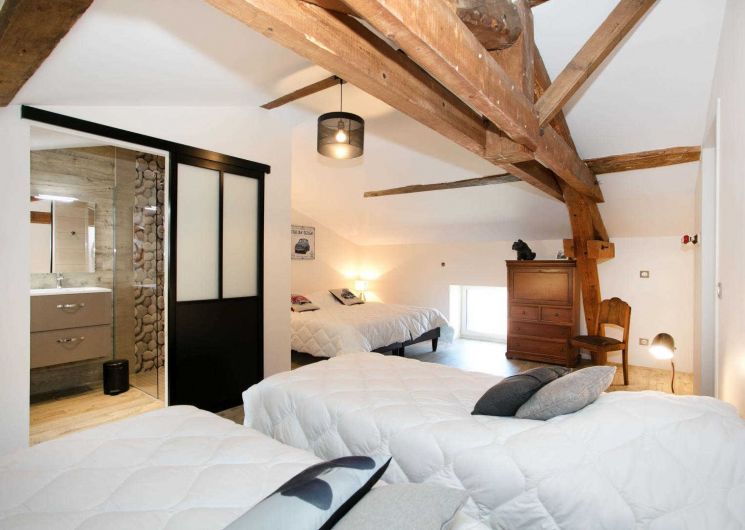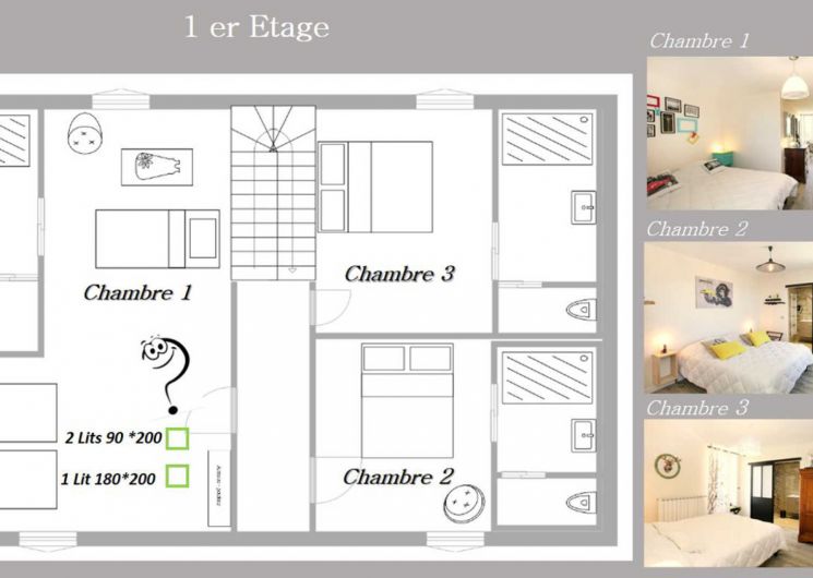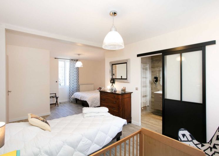 – 3 chambres, dont deux avec lit en 160cm et la dernière avec 3 lits simples en 90cm jumelables et lit bébé
