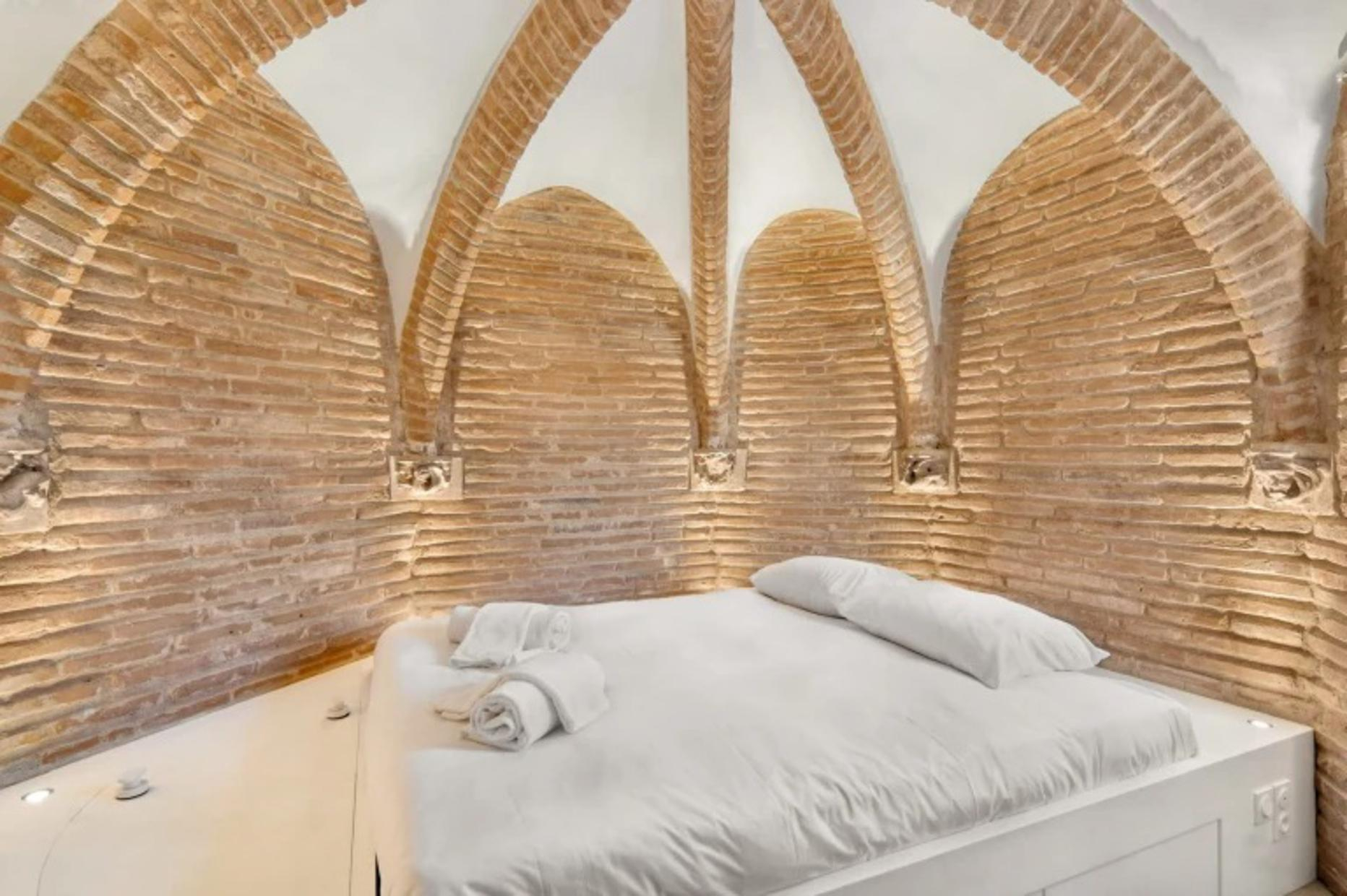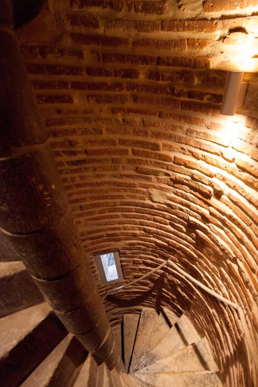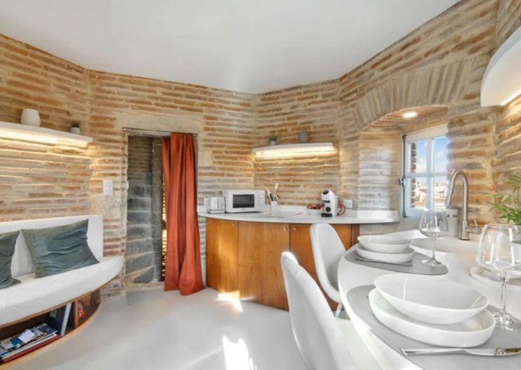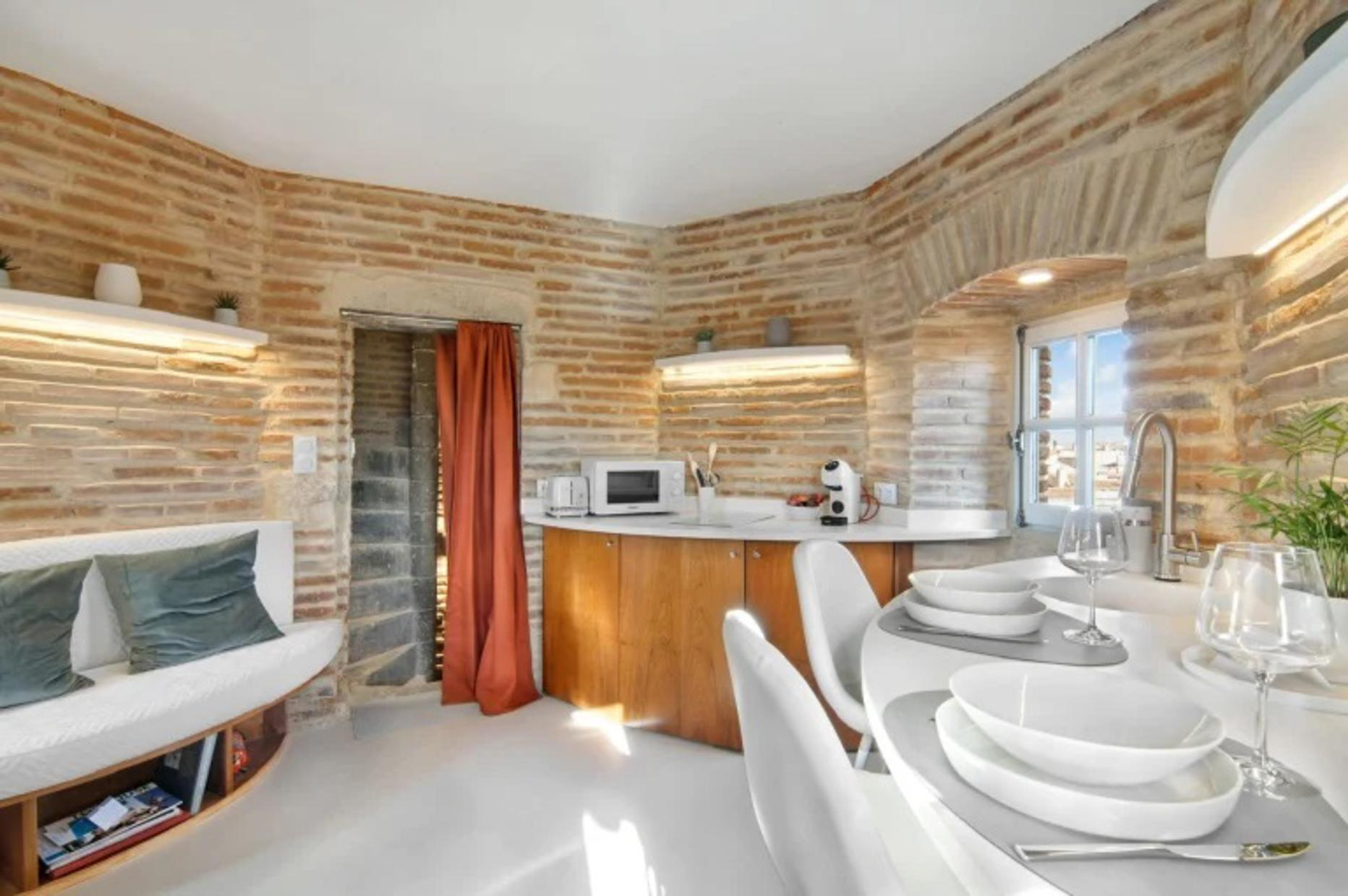 The top-of-the-range triplex flat is accessed by a 110-step spiral stone staircase (rope handrail). Located at the top of the tower, it faces the inner courtyard (facades and entrance currently being renovated). The three superimposed rooms are circular and measure around 9m² each. Their ribbed ceilings are remarkable. On the lower level of the flat: the shower room with toilet. On the upper level: the double bedroom with a 160cm double bed. On the top level: the living room with kitchenette and lounge area, with uninterrupted views over the rooftops through three windows, each of which looks out over a different part of the city like an orientation table; on a clear day, you can even see the Pyrenees!