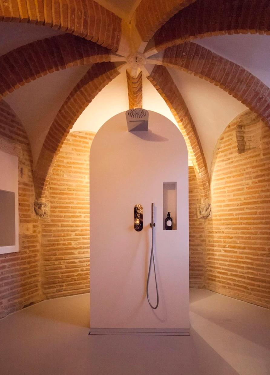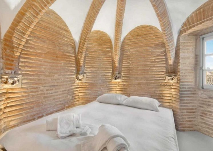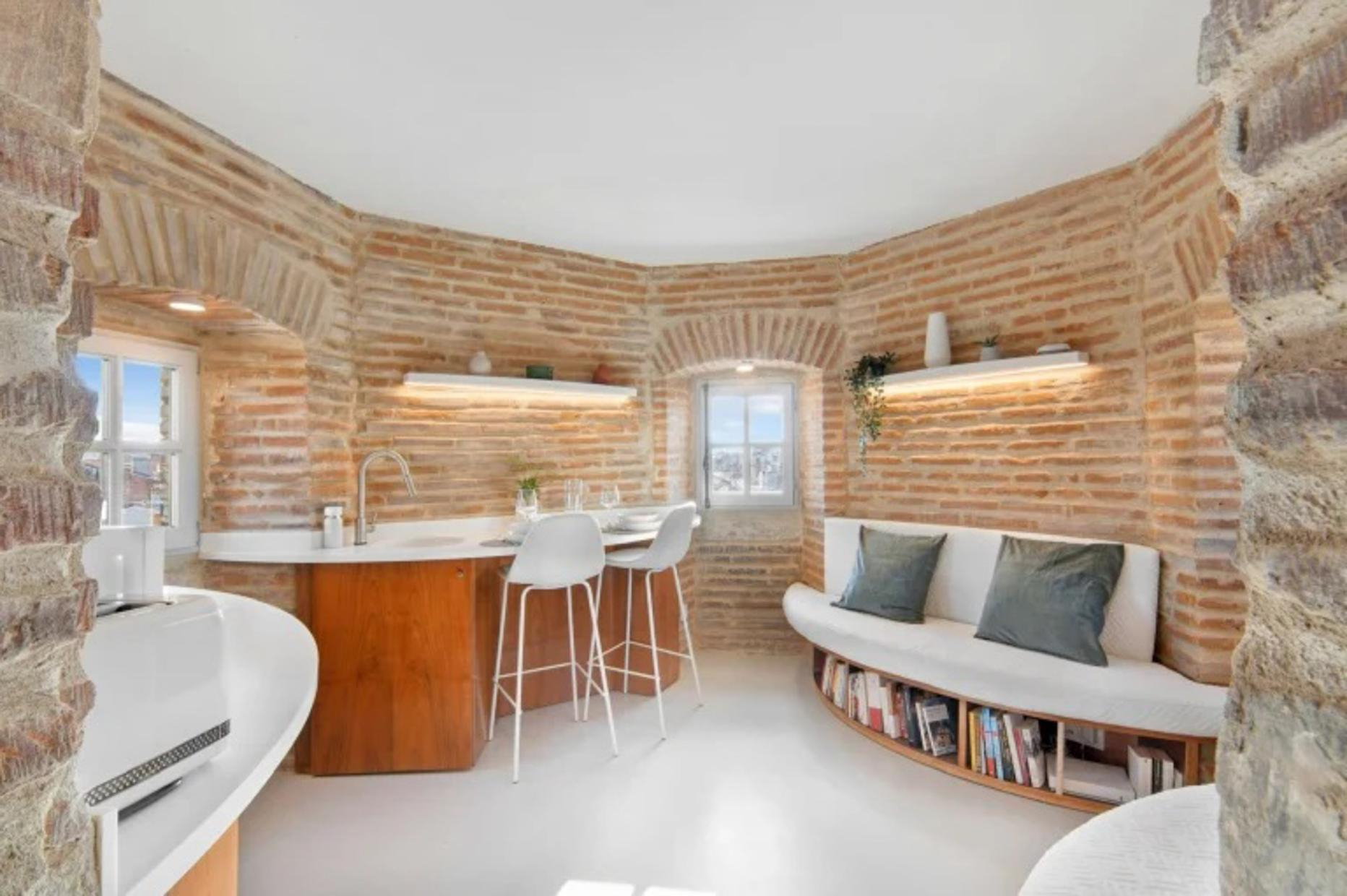 The top-of-the-range triplex flat is accessed by a 110-step spiral stone staircase (rope handrail). Located at the top of the tower, it faces the inner courtyard (facades and entrance currently being renovated). The three superimposed rooms are circular and measure around 9m² each. Their ribbed ceilings are remarkable. On the lower level of the flat: the shower room with toilet. On the upper level: the double bedroom with a 160cm double bed. On the top level: the living room with kitchenette and lounge area, with uninterrupted views over the rooftops through three windows, each of which looks out over a different part of the city like an orientation table; on a clear day, you can even see the Pyrenees!