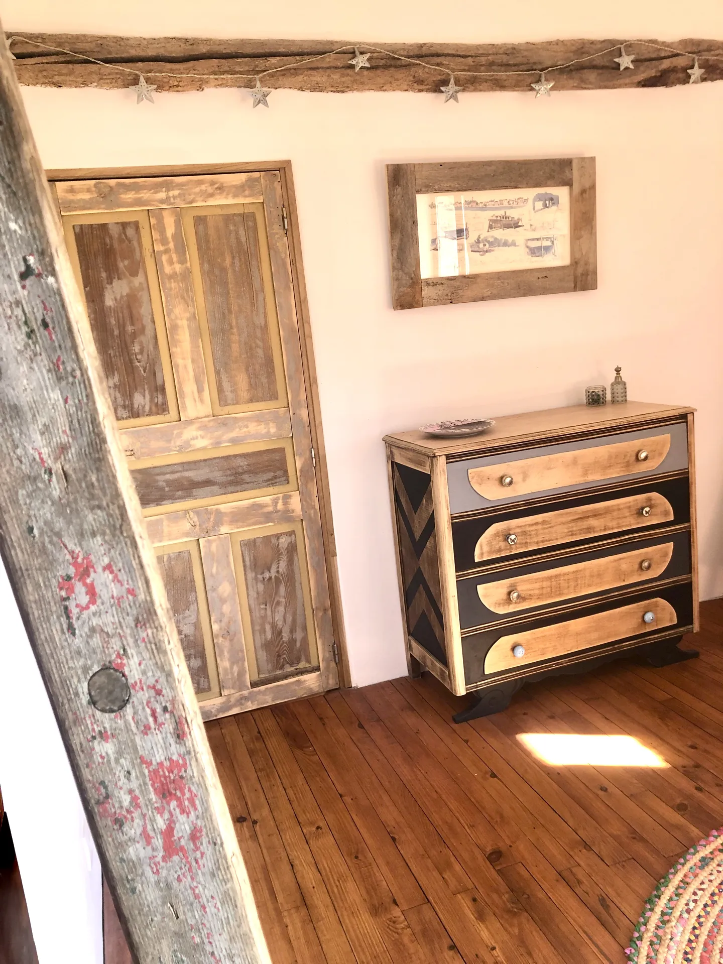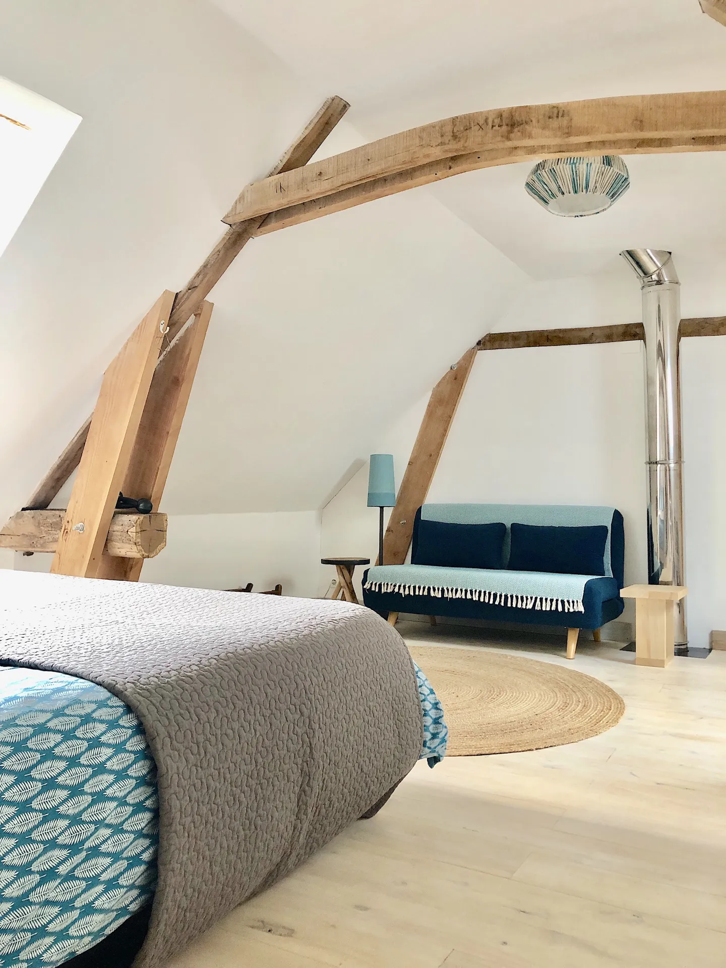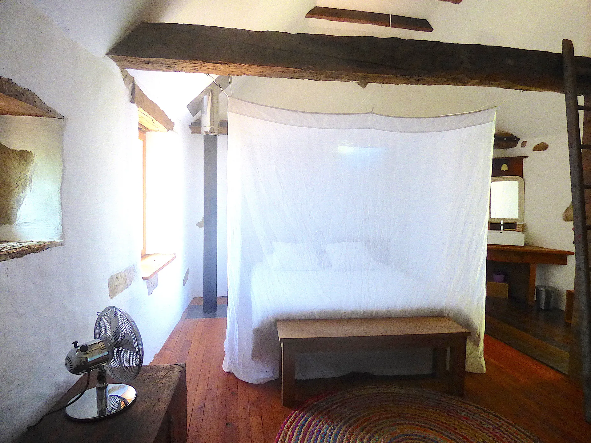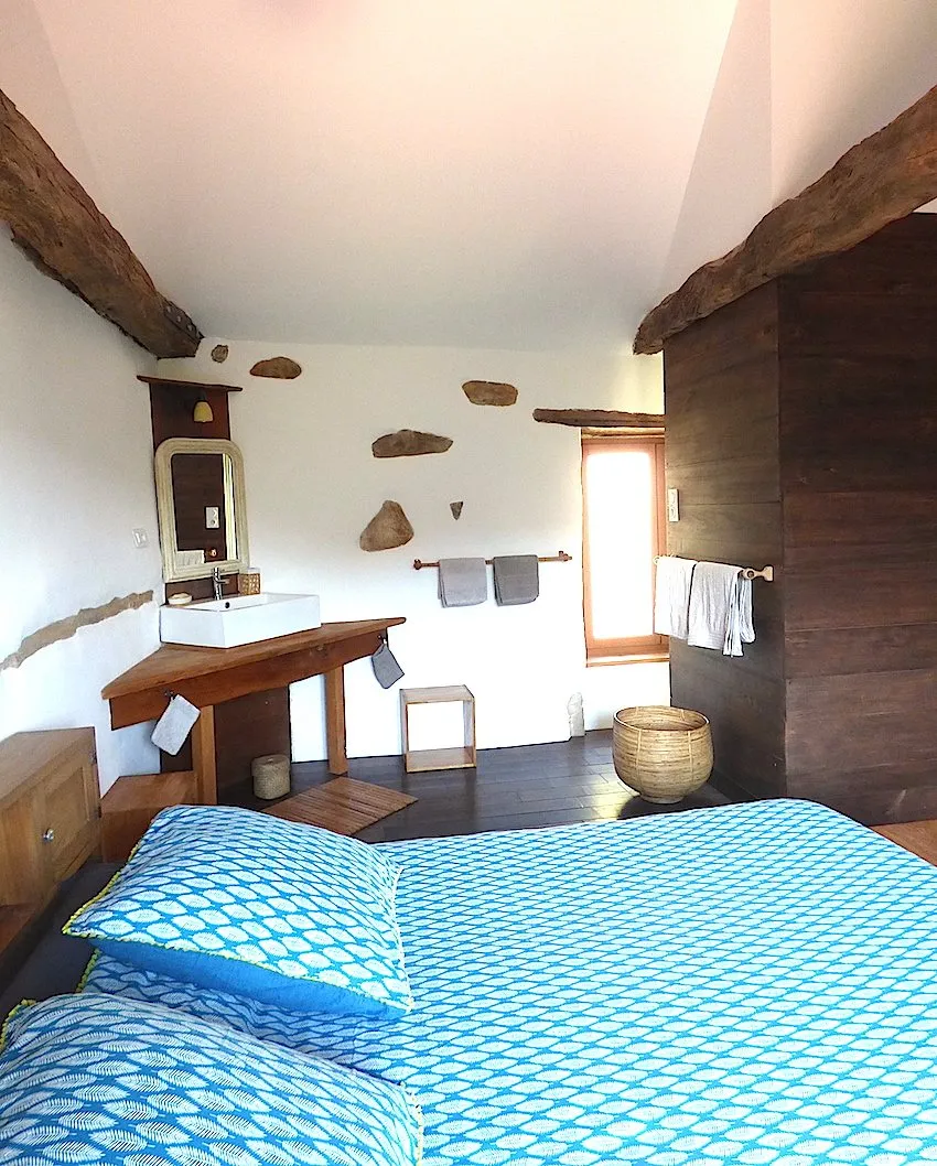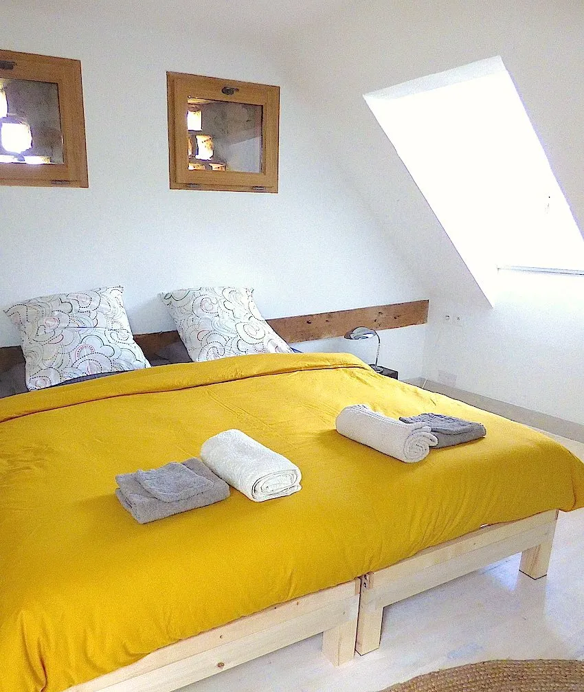 • 1 grande chambre double au plafond cathédrale, salle d’eau et toilettes sèches, couchage 160, 2 personnes.