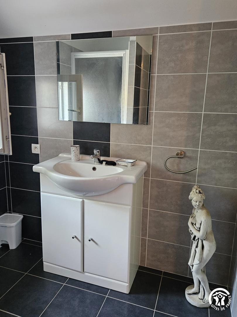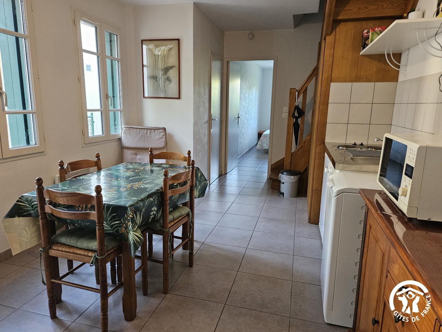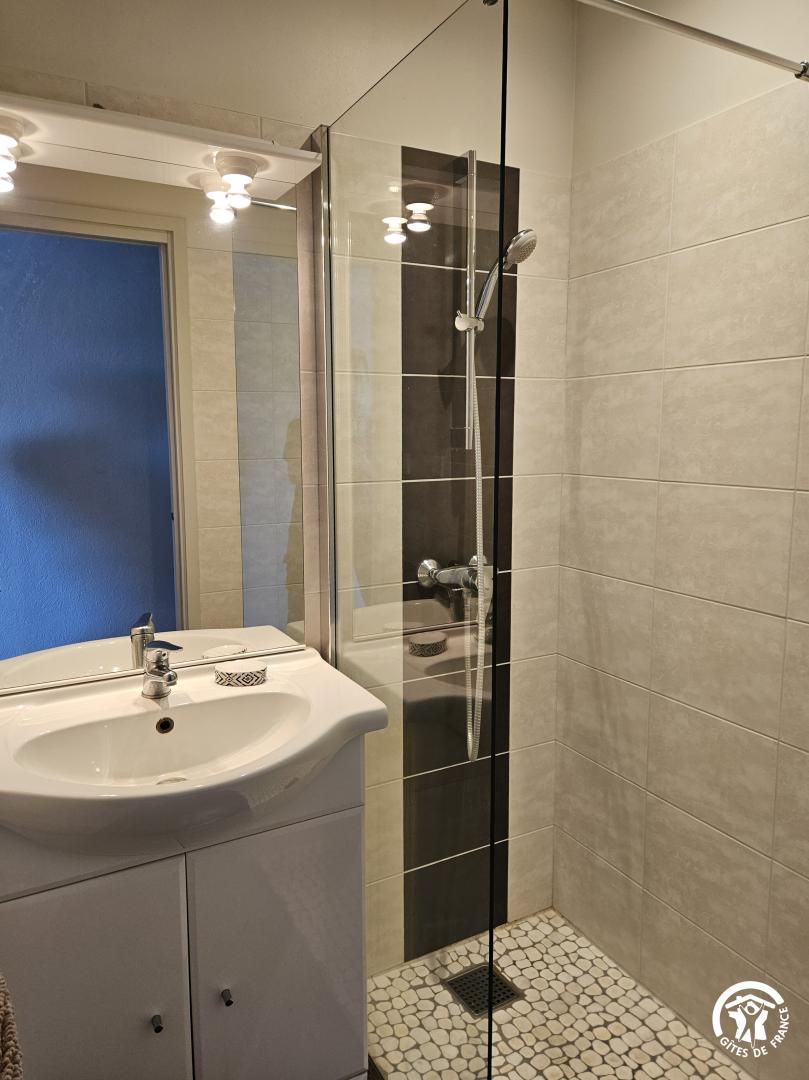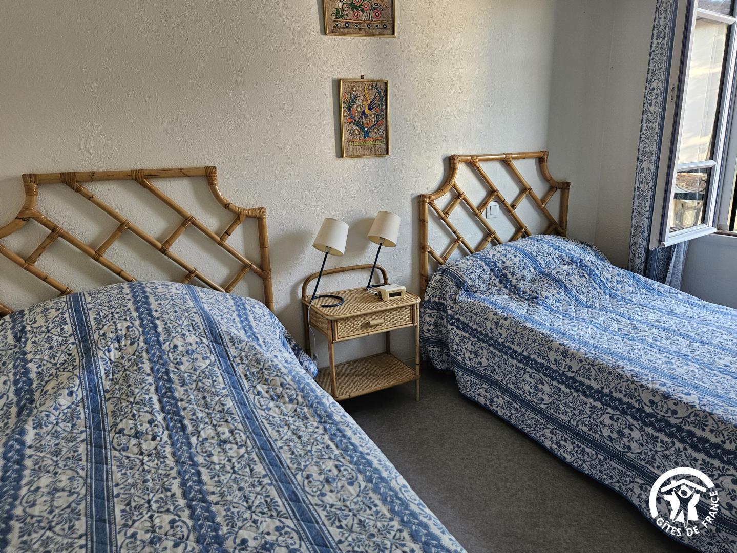 A l’étage : chambre (deux lits simples), salle d’eau avec wc. Chauffage électrique. Climatisation. Petite cour privative, piscine commune à partager avec les propriétaires, chauffée de début mai à fin septembre.