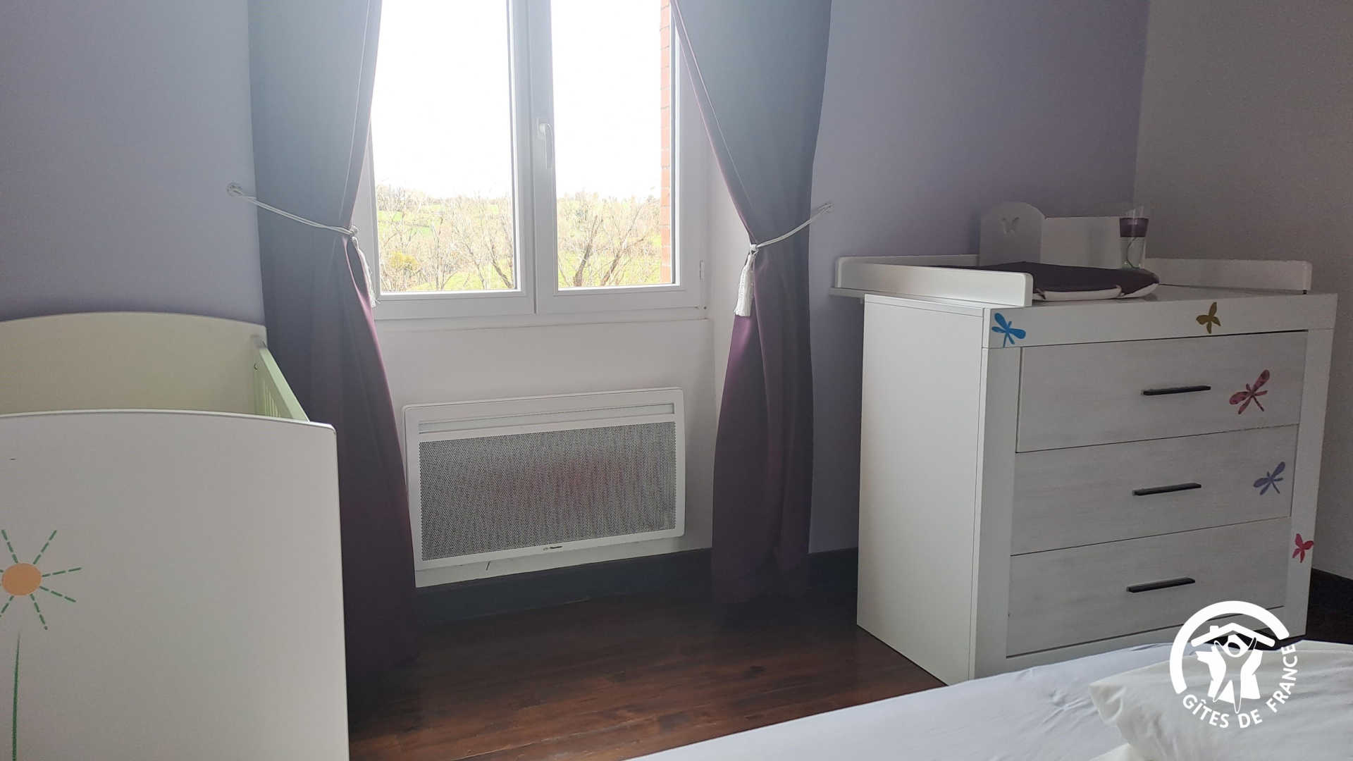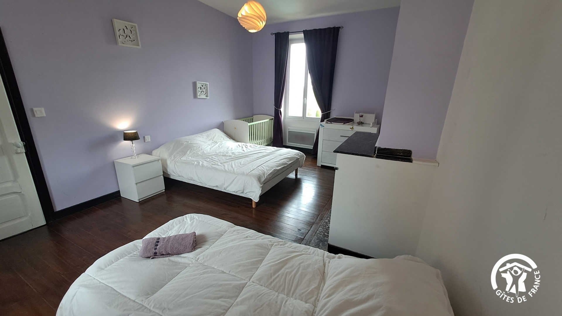 – Chambre “violette” avec un lit double en 160x200cm, un lit simple en 90x190cm et un lit bébé avec table à langer