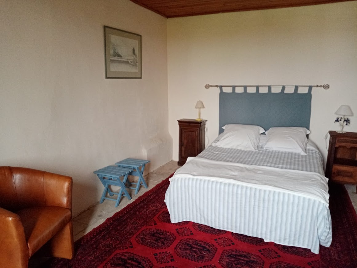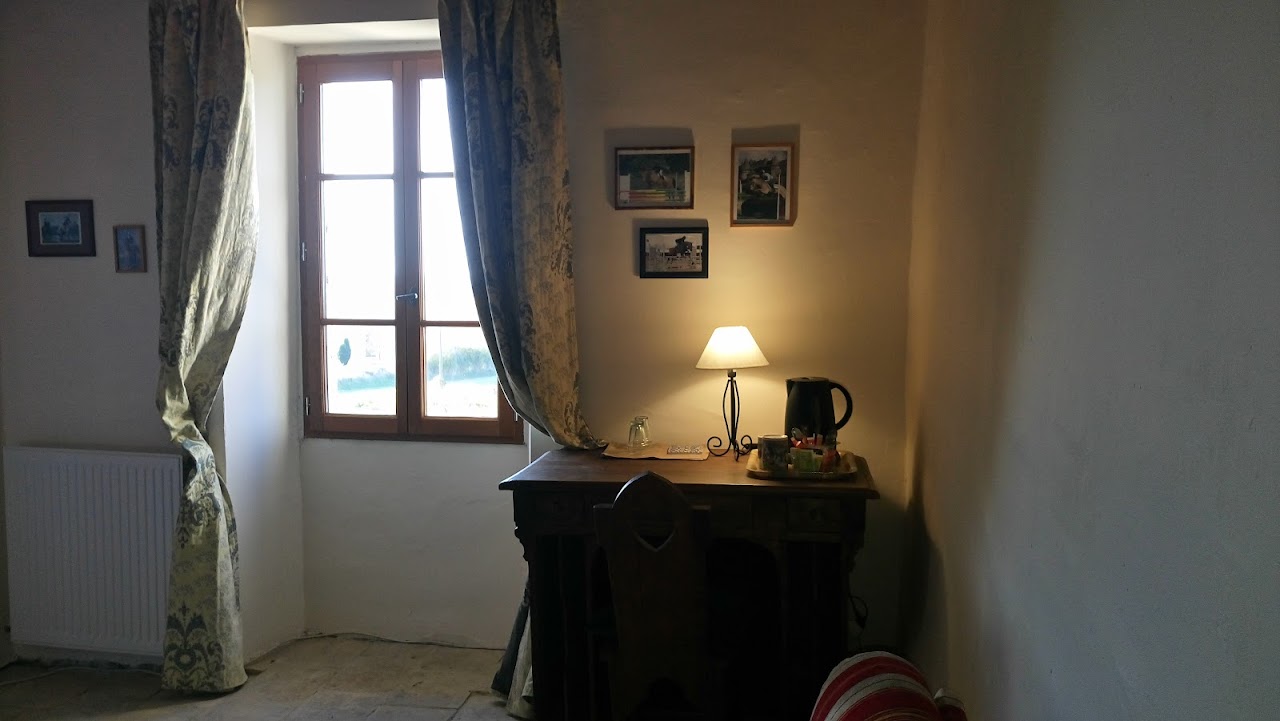 The room is located on the second floor with a very wide view of the vineyards and surrounding countryside. Some days you may even catch a glimpse of the Pyrenees or our ponies in their meadow.